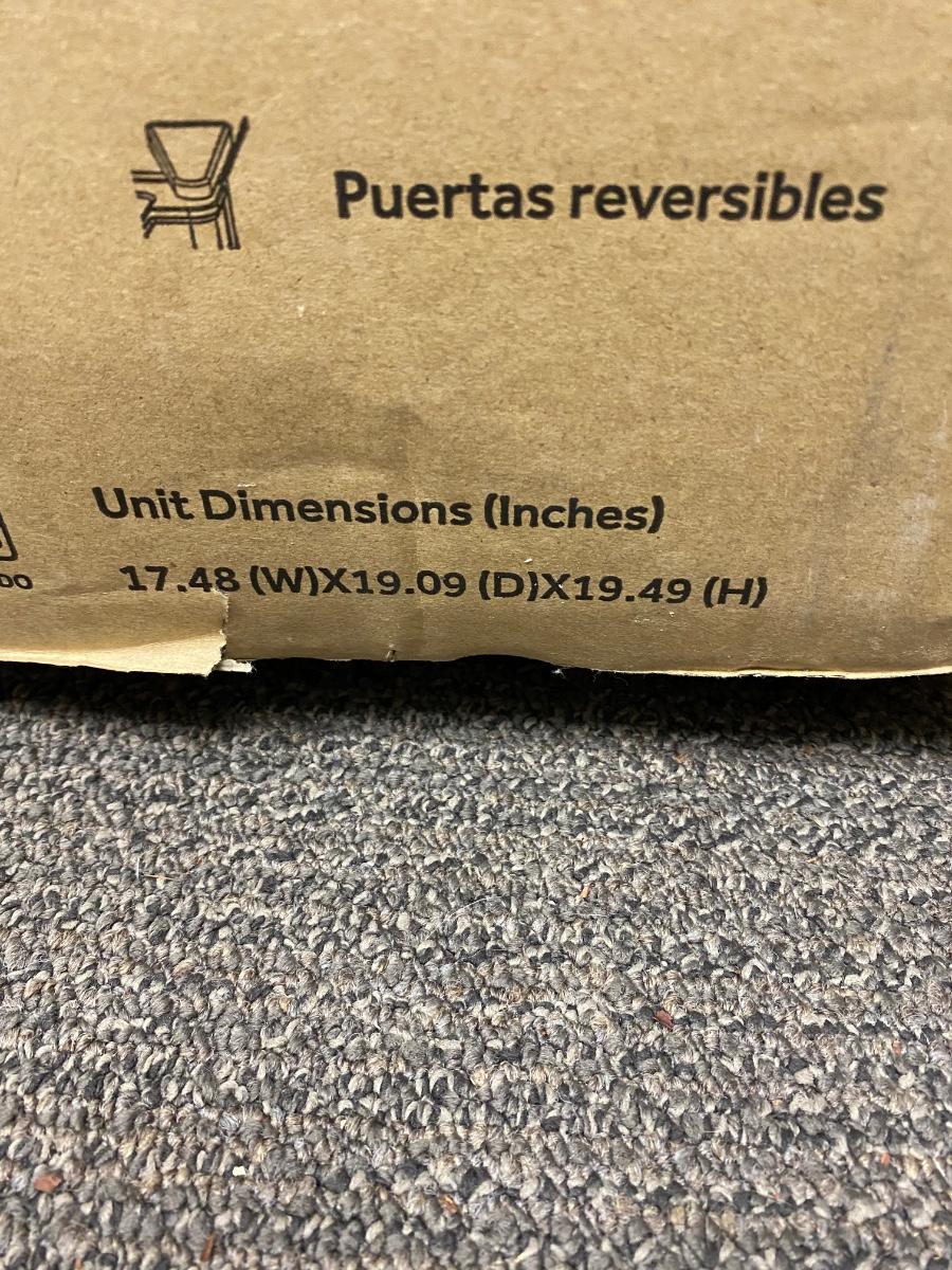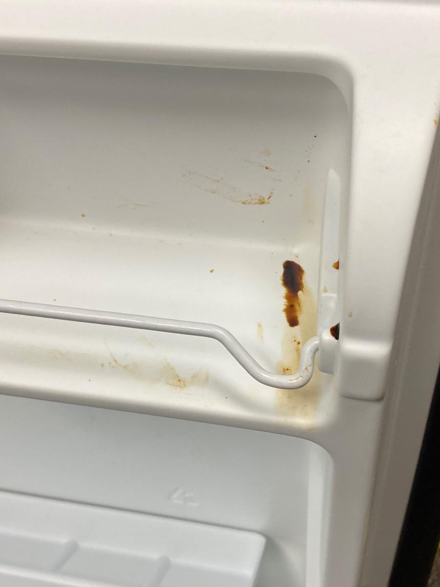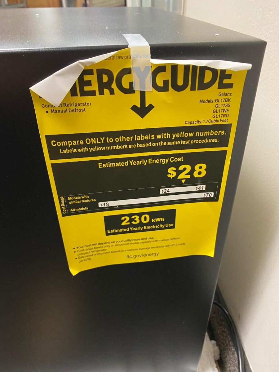 Galanz 1.7cu ft mini fridge. Small freezer spot inside, can hold a two-liter bottle in door. In original box, opened. Plugged in and it seems to work. Unsure if it was actually ever used. There are some spots inside, but the white plastic looks very clean other than those spots.