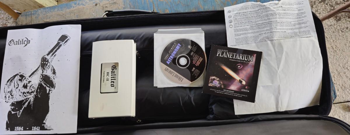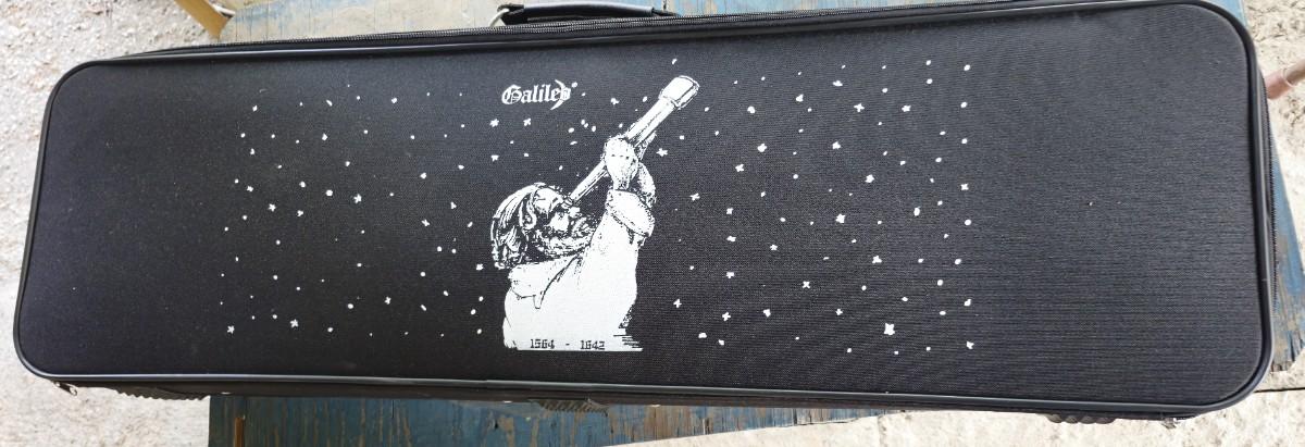 Galileo HC-2 telescope on tripod base, includes directions and carrying case. Case: 11" H x 38" W x 5" D.