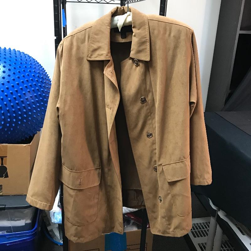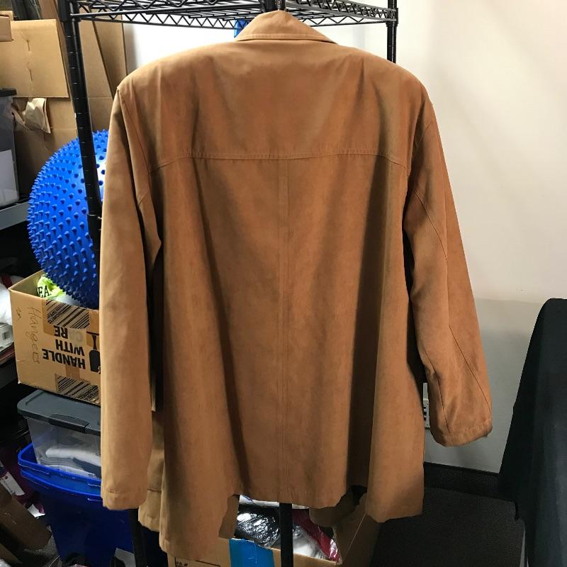 Up for auction is a caramel brown ladies coat. The fabric has a very smooth suede like texture.