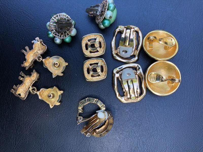 Lot includes Ciner, Monet and Unsigned Earrings, 5 of the Earrings are Gold Tone with one Silver Tone Back. All Are in Good Condition. The Pair of Green Bead Earrings the Clip is loose.