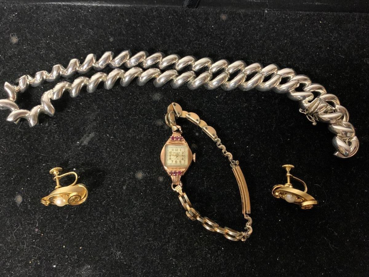 14K rose gold vintage watch with rubies together with a costume jewelry necklace and ear rings
