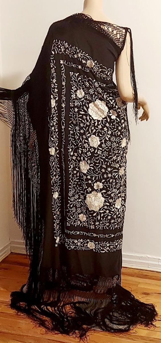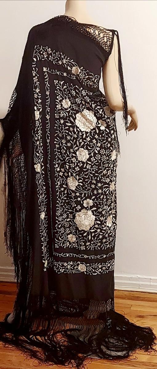 Antique Silk one Shoulder Manila hand embroidered Shawl dress w/Fringes