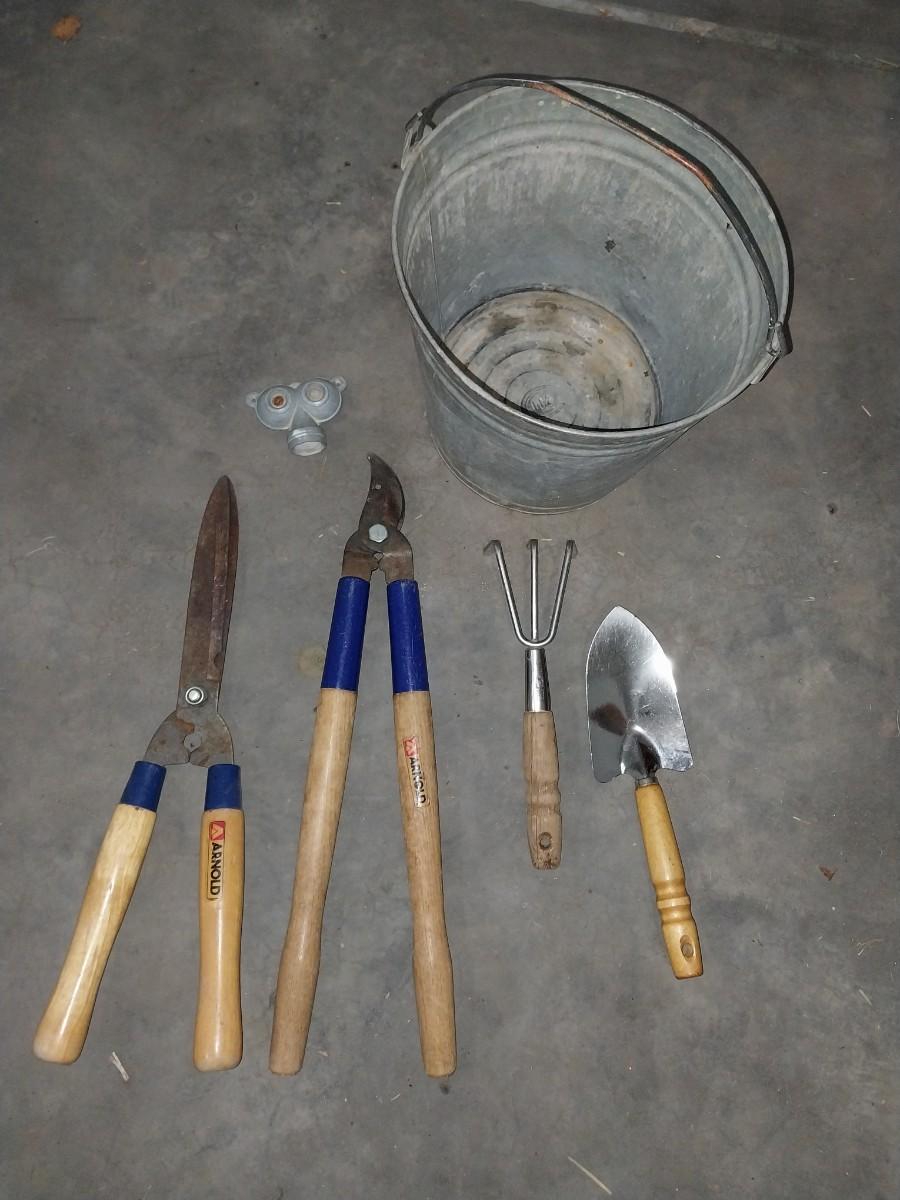 GALVANIZED BUCKET AND GARDENING TOOLS