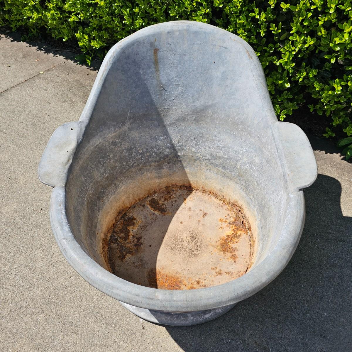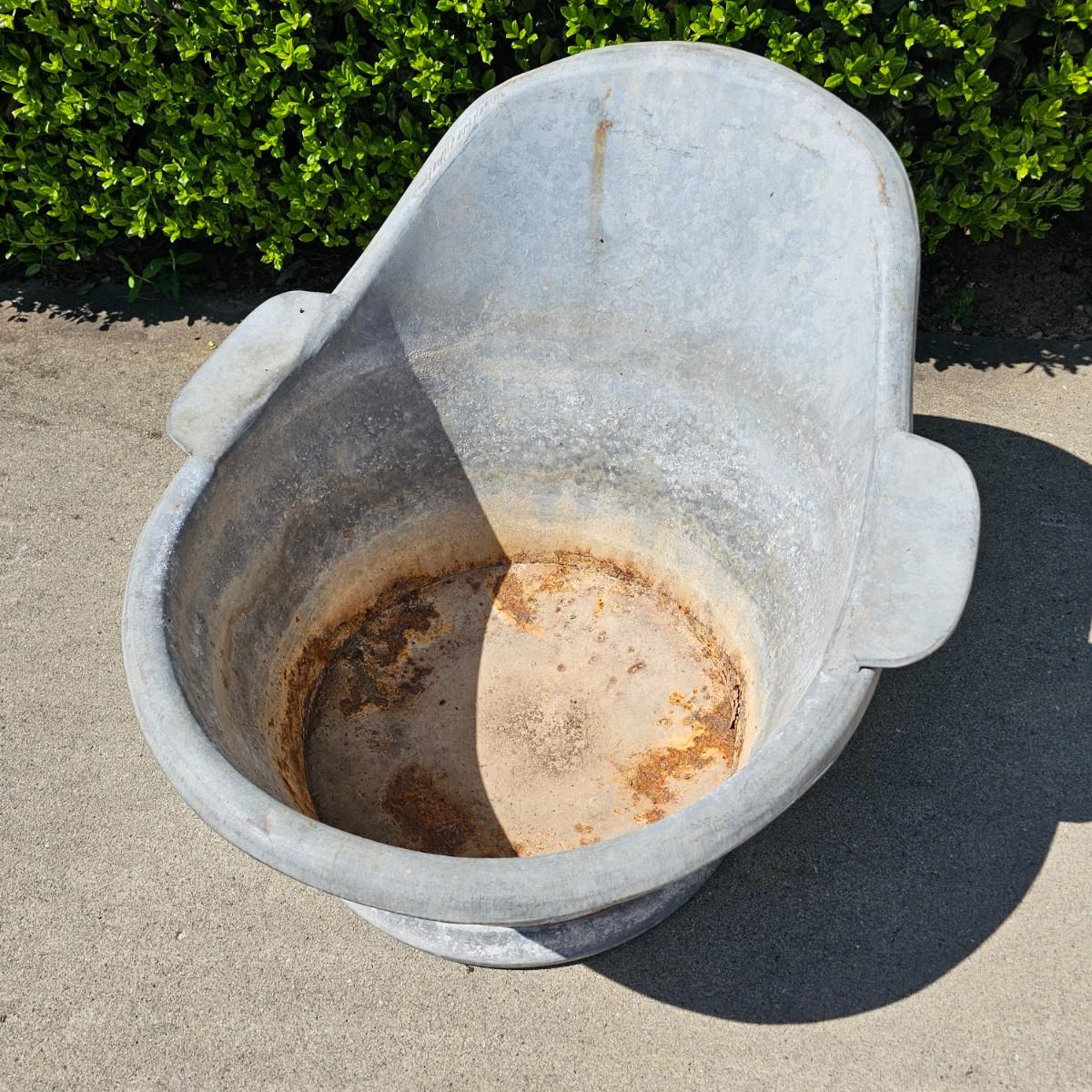 Old style cowboy bathtub made out of galvanized metal. Backrest and handles. Tub measures 27" x 29" x 19"H, has some rust in bottom and around edges. See photos for details. Local pickup only.