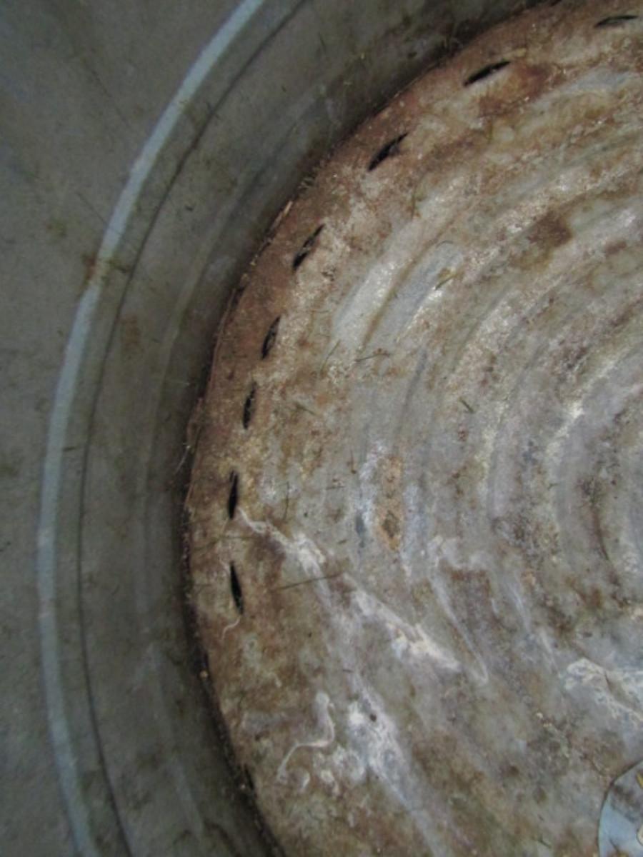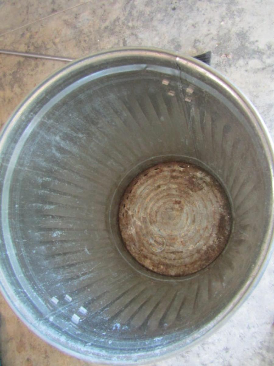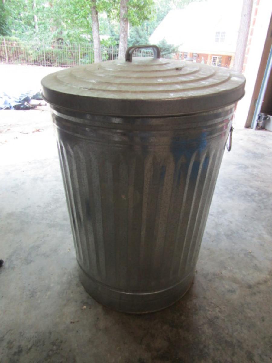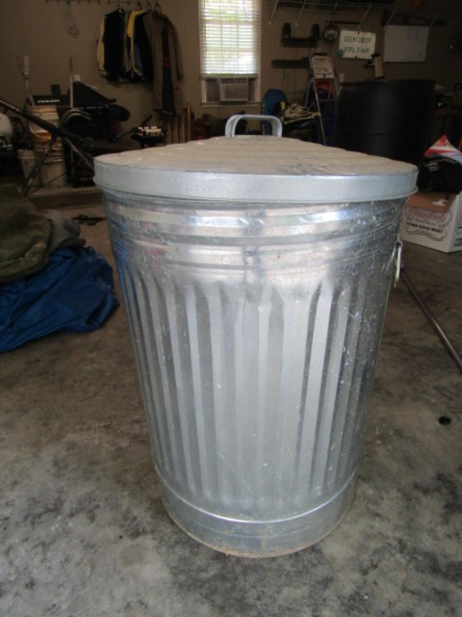Galvanized Metal Garbage Can with Lid. Bottom has been vented for drainage.