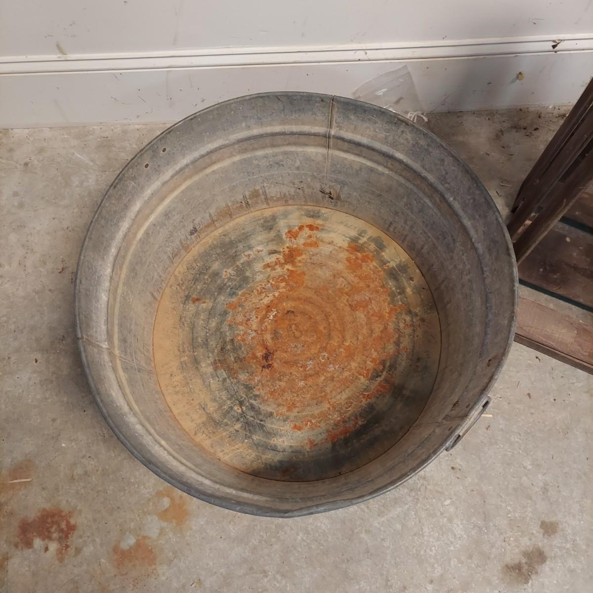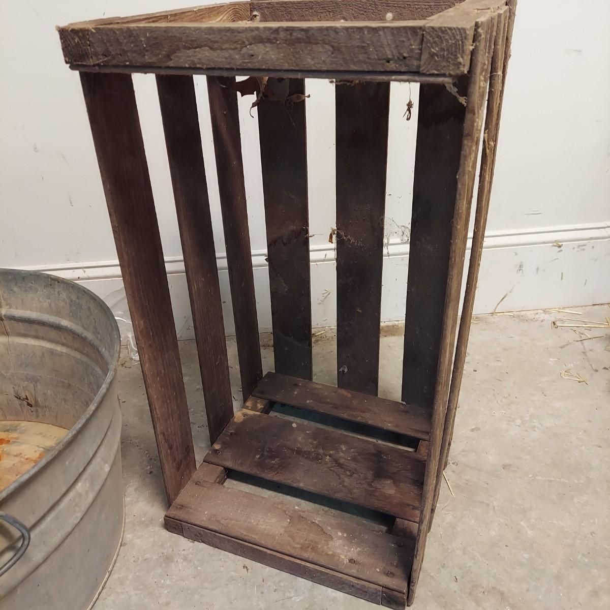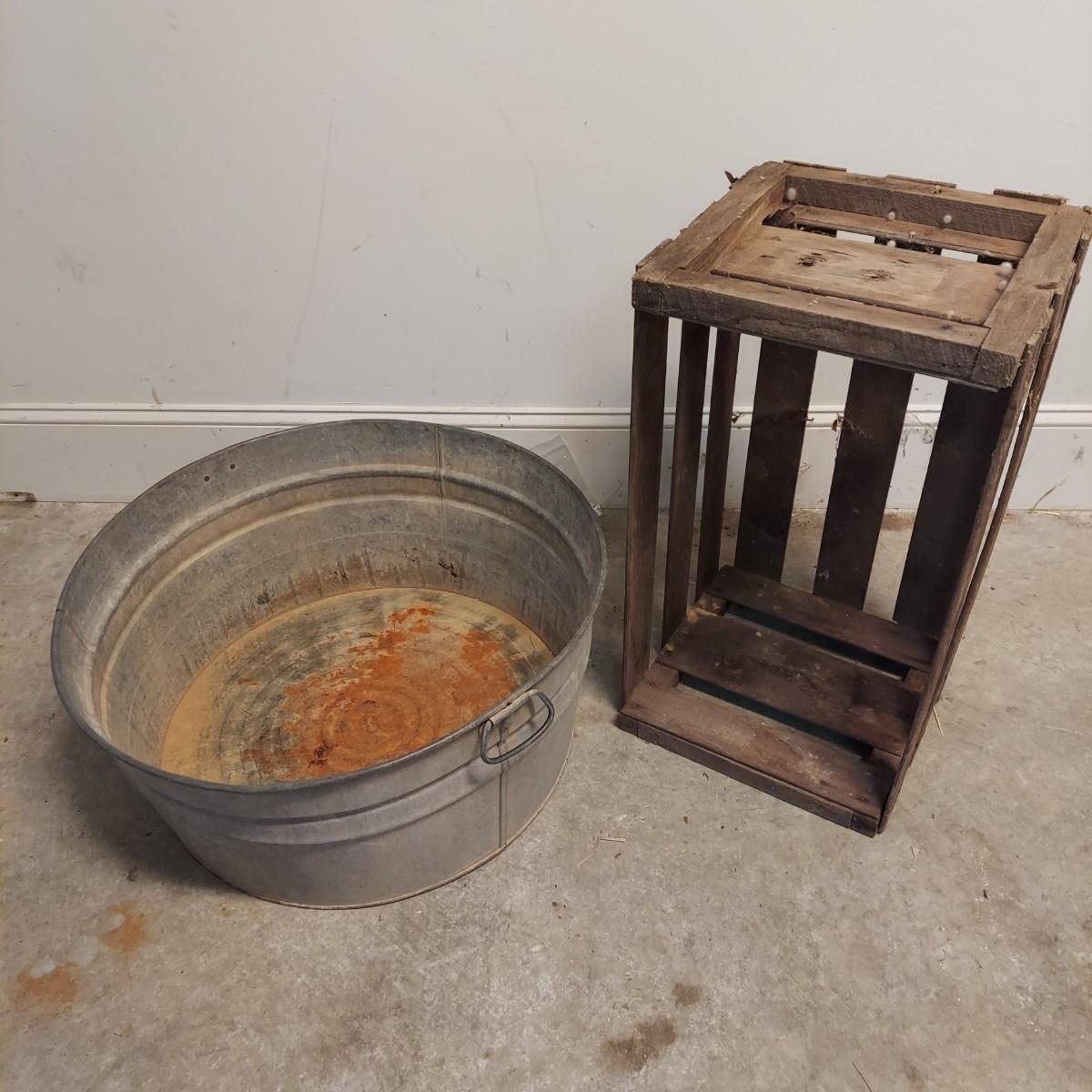Large galvanized round Pail with a wooden produce crate style box. The metal tub measures 24"D x 12"H. The box measures 25” x 14” x 13"H. Please see photos for details. Local Pickup Only