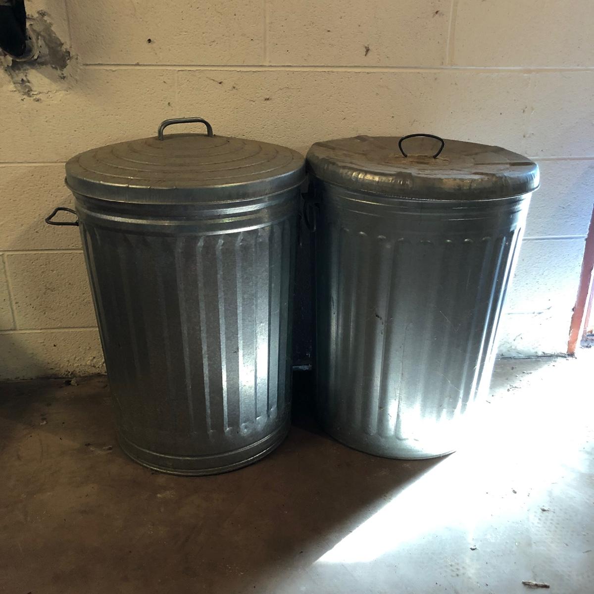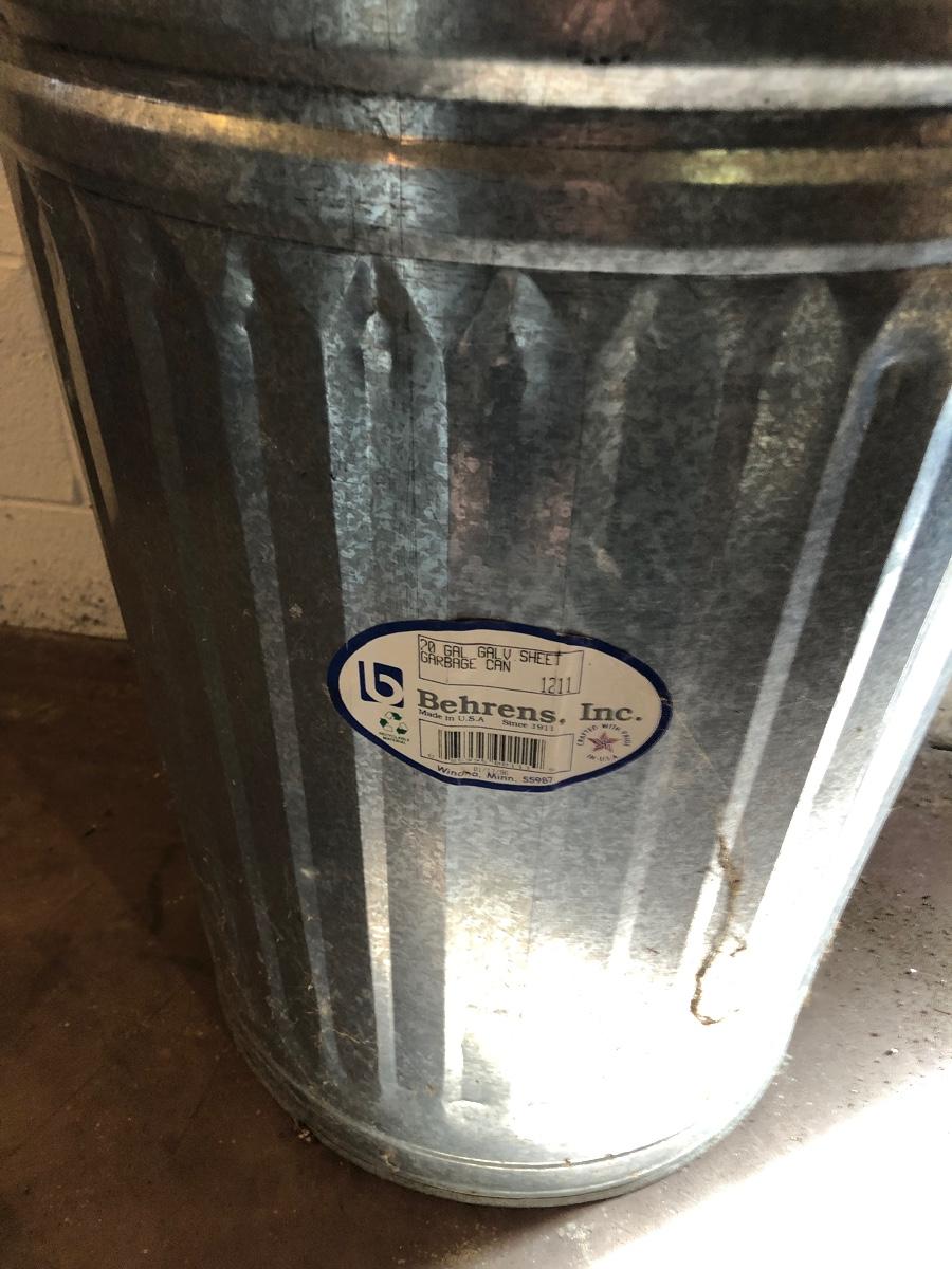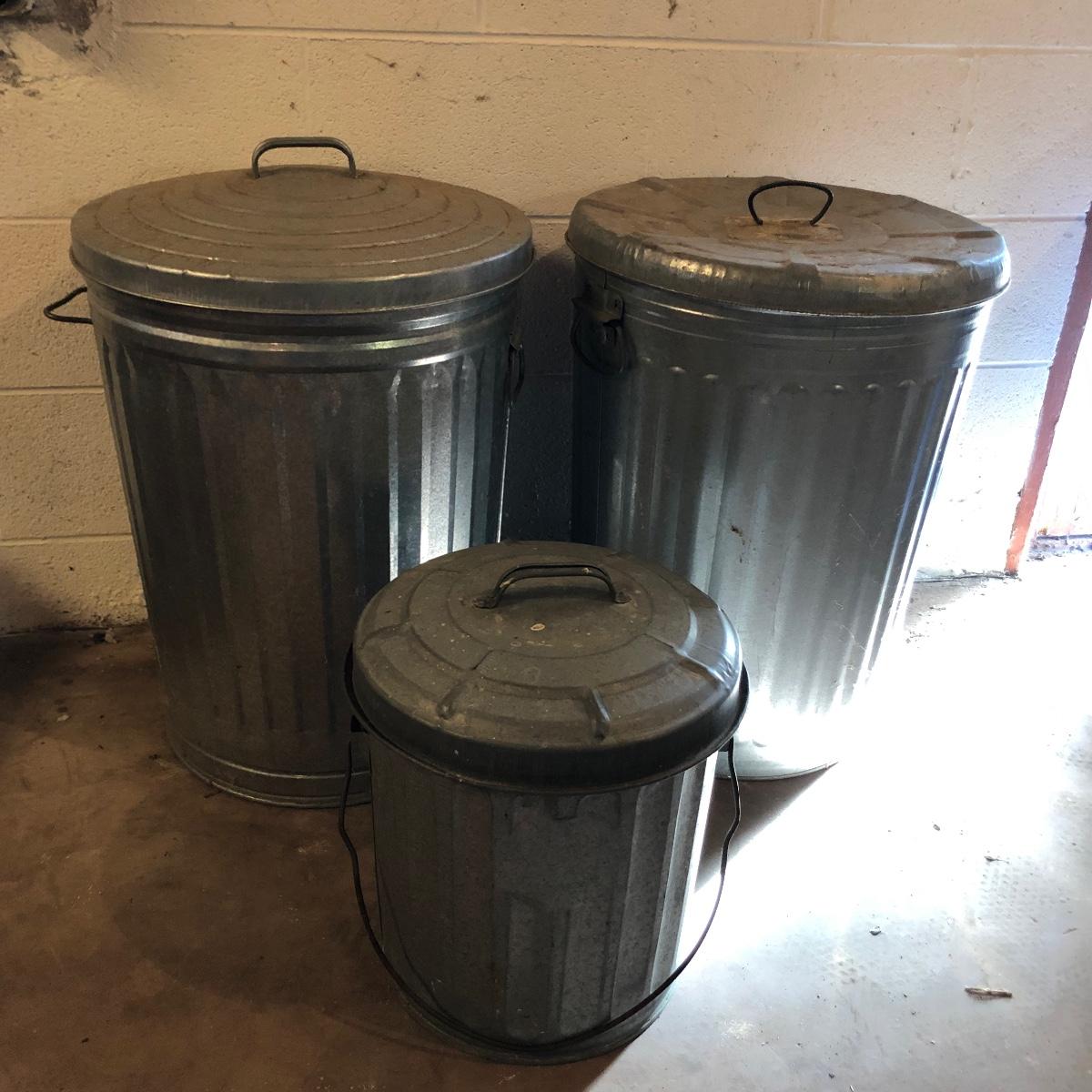 Lot includes 20 gallon Behrens galvanized garbage can, one 20 gallon unmarked galvanized garbage can and a five gallon galvanized can. All three have lids.