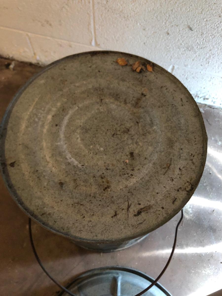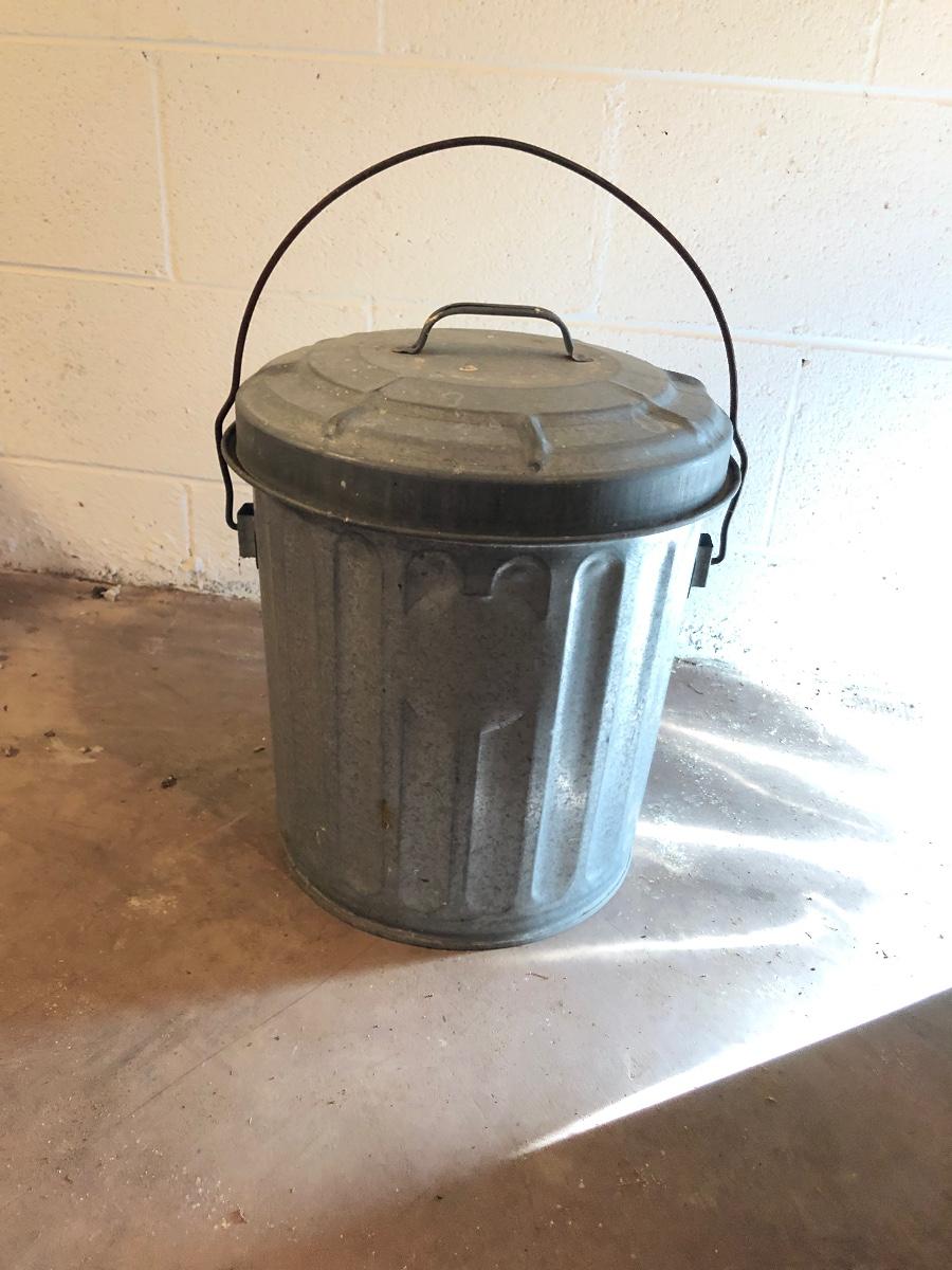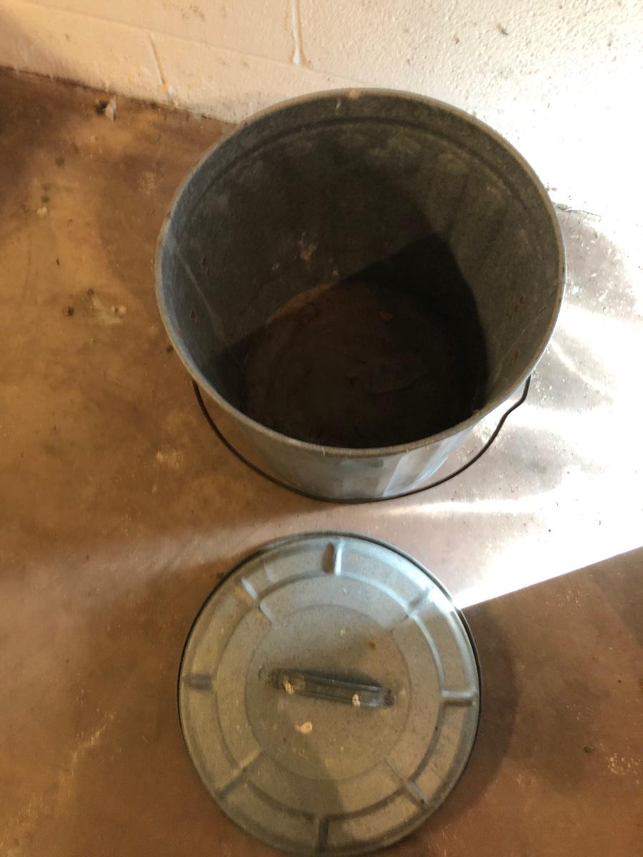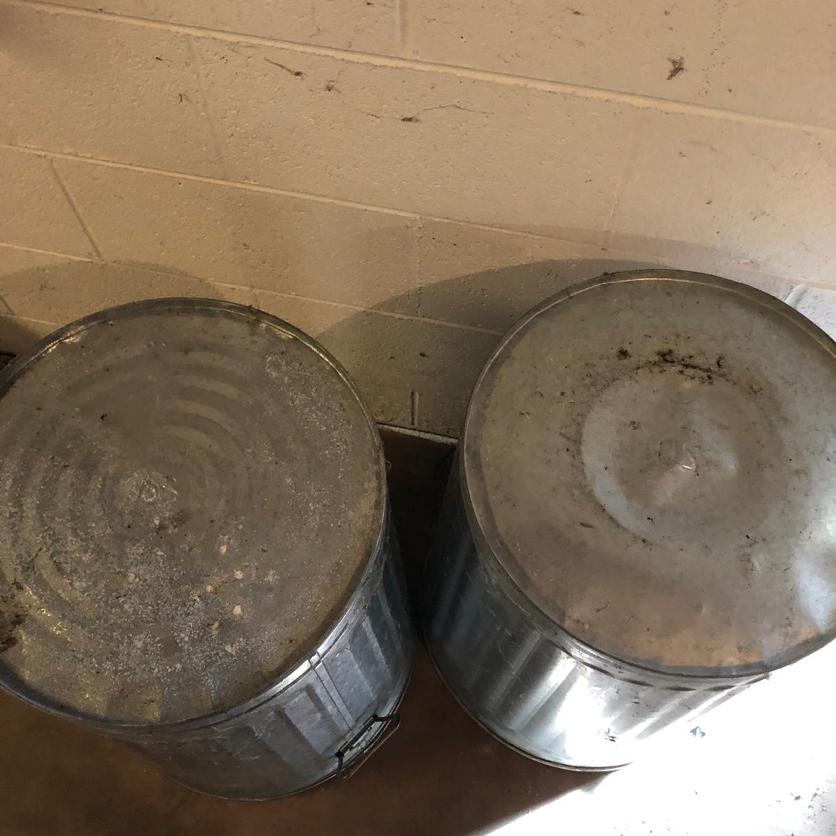 Lot includes 20 gallon Behrens galvanized garbage can, one 20 gallon unmarked galvanized garbage can and a five gallon galvanized can. All three have lids.