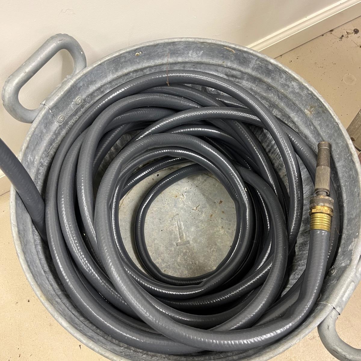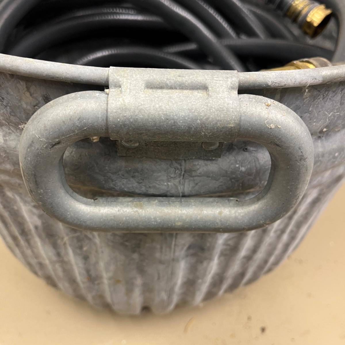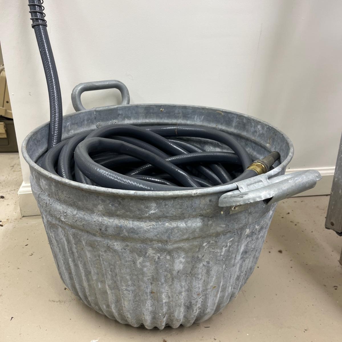 Lot includes a galvanized tub with handles that measures 17.5”D x 11.5”H. Also includes two hoses with nozzles.