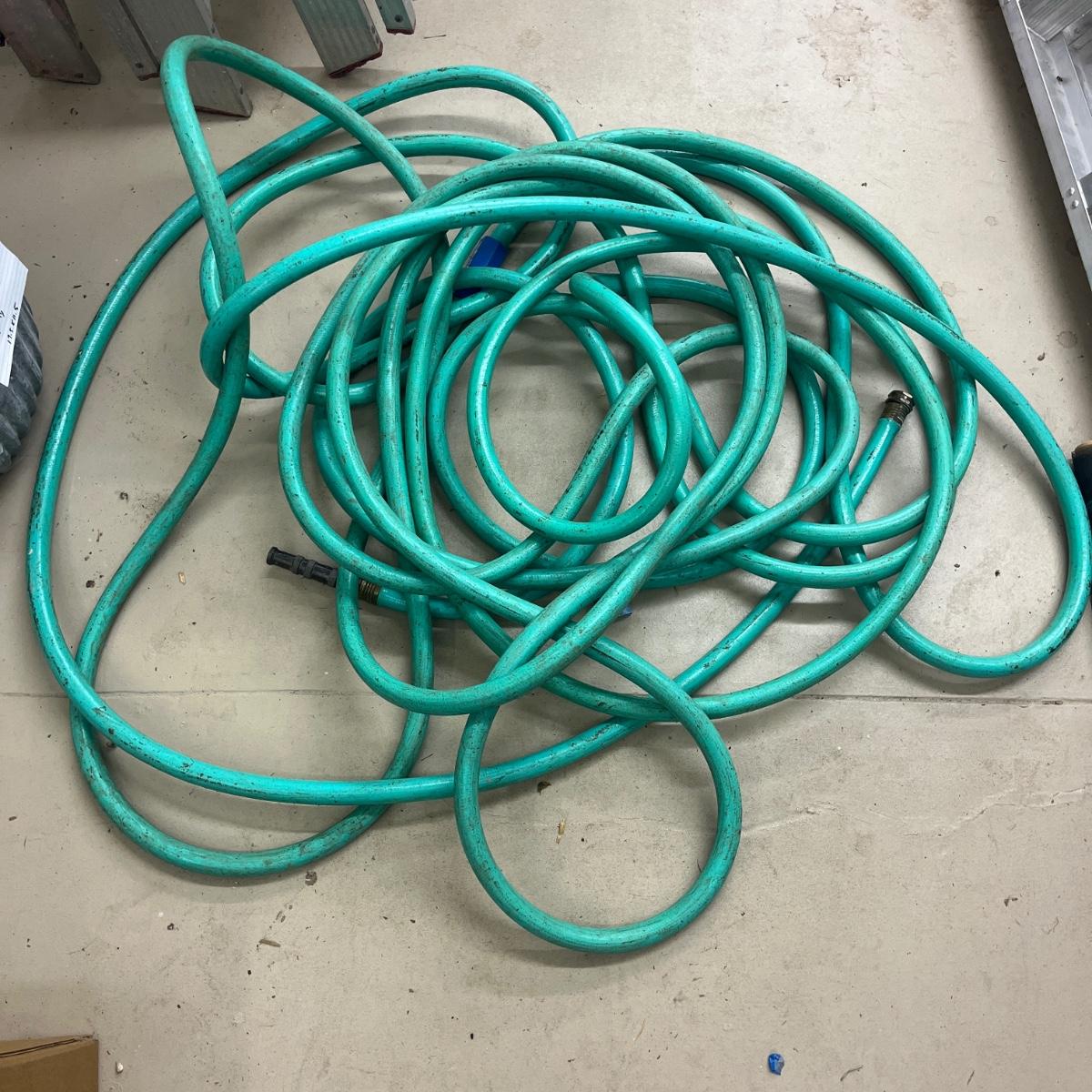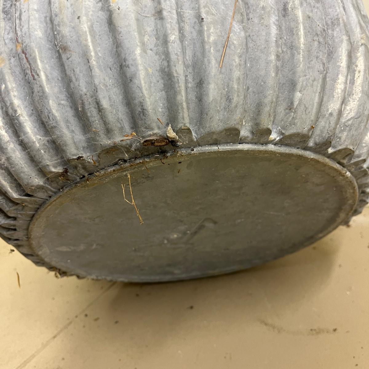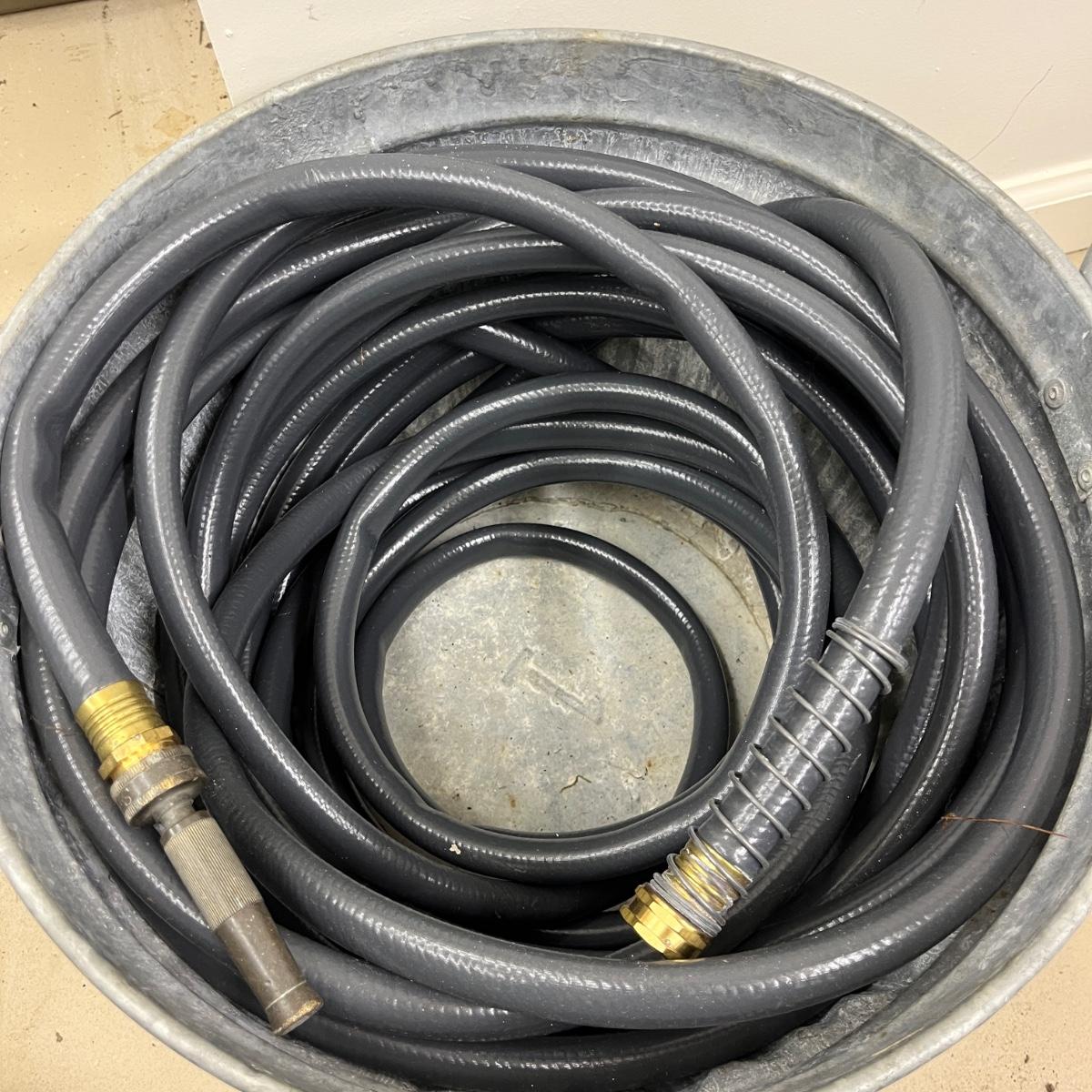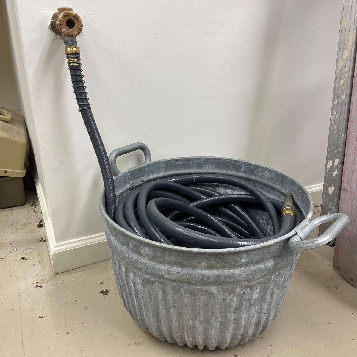 Lot includes a galvanized tub with handles that measures 17.5”D x 11.5”H. Also includes two hoses with nozzles.