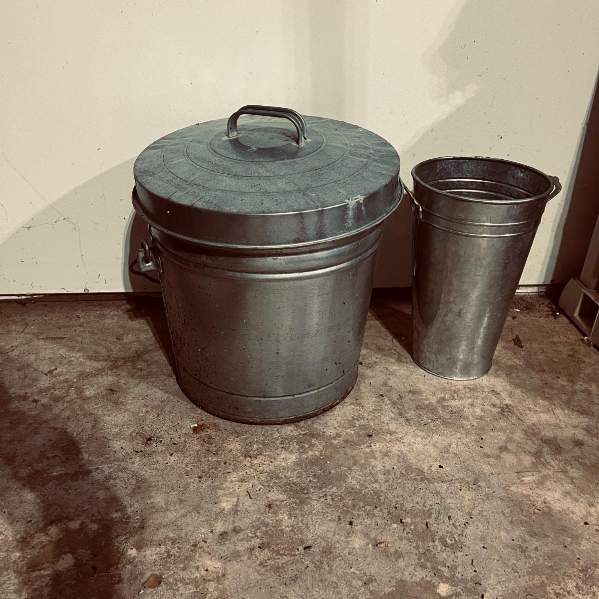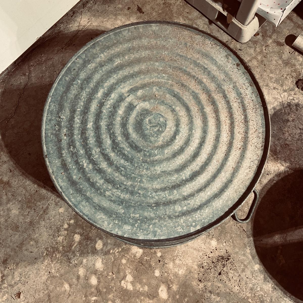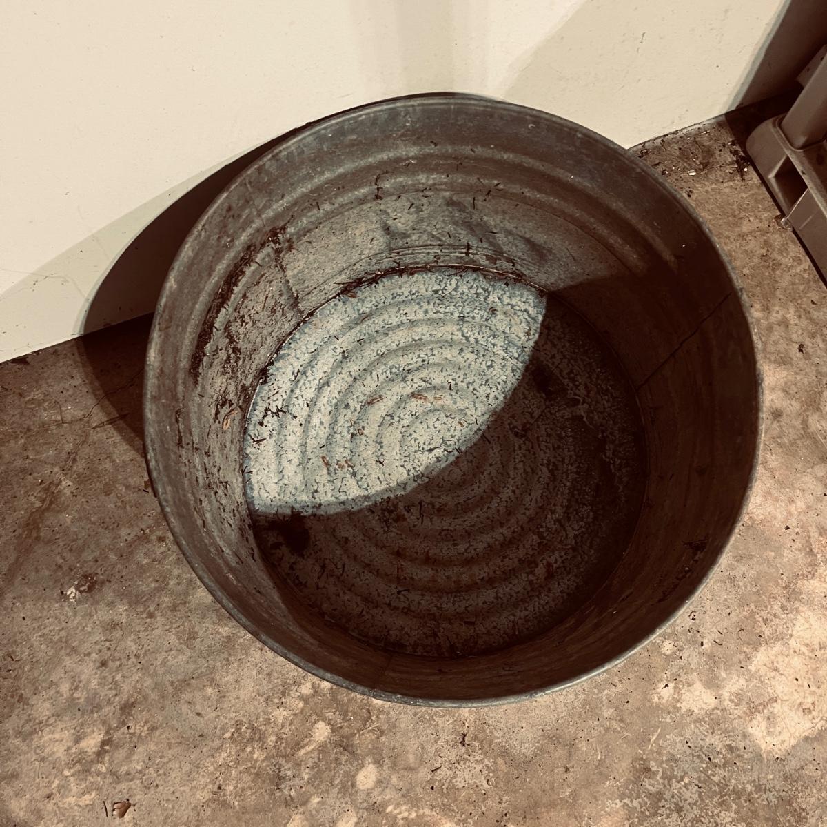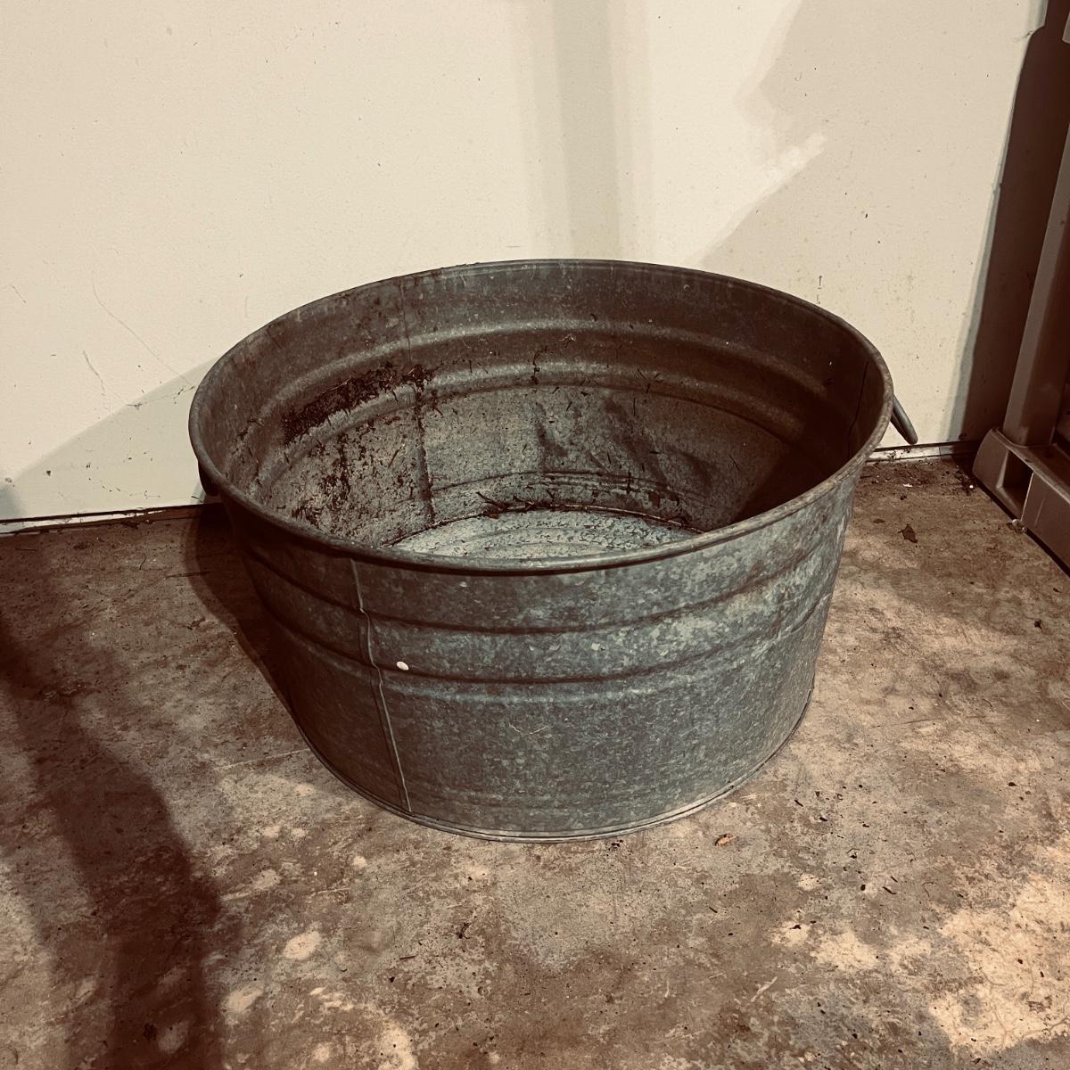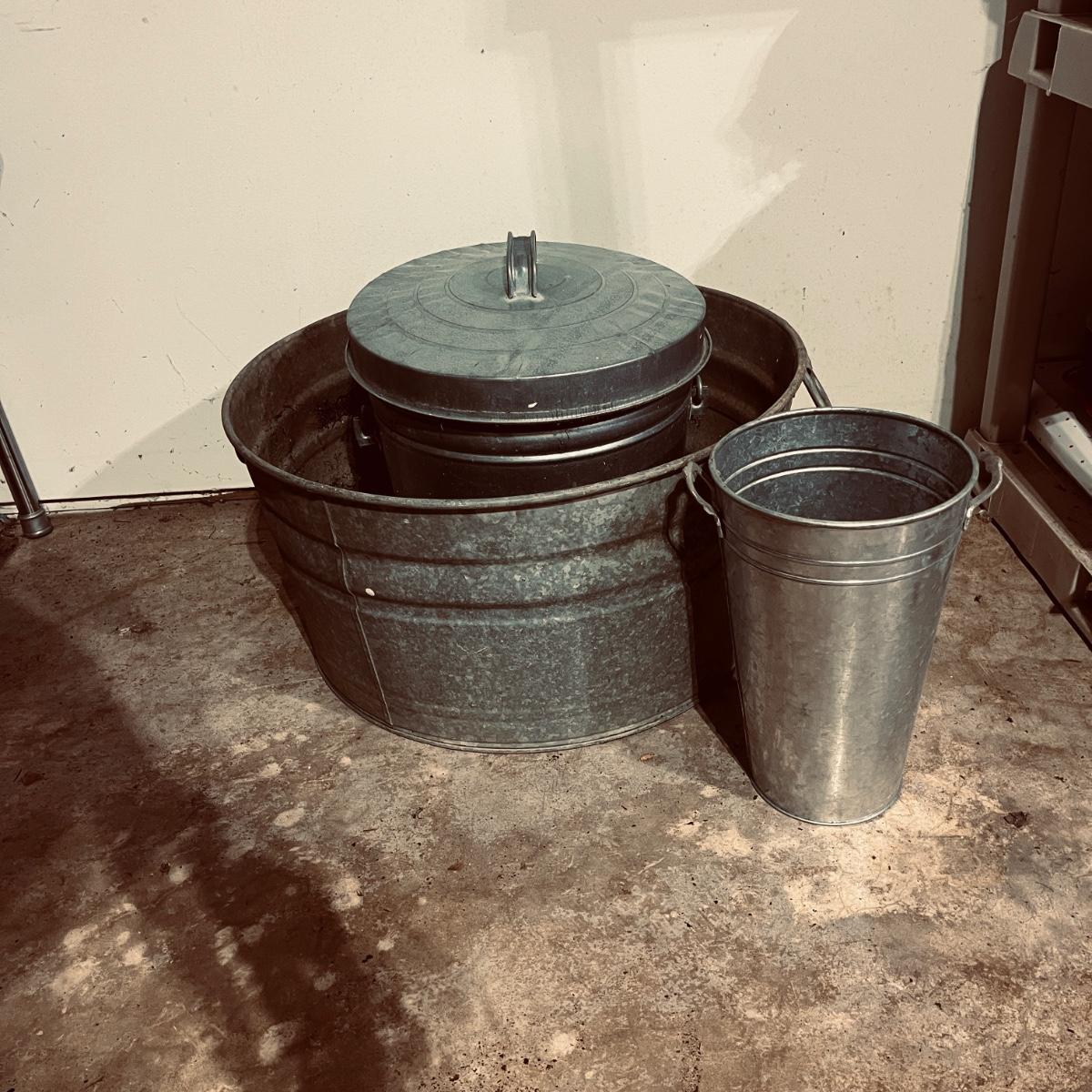 Lot includes a galvanized washtub, French bucket and a small garbage can with lid that has a hole in the bottom, see pictures. Washtub measures 21.5”D x 11”H.