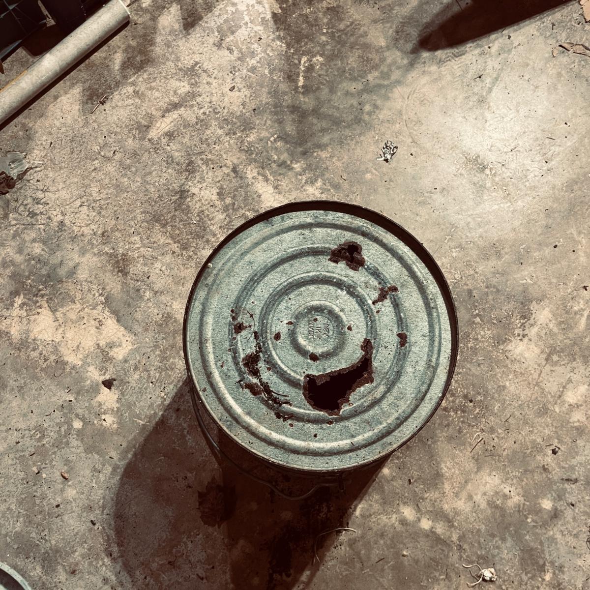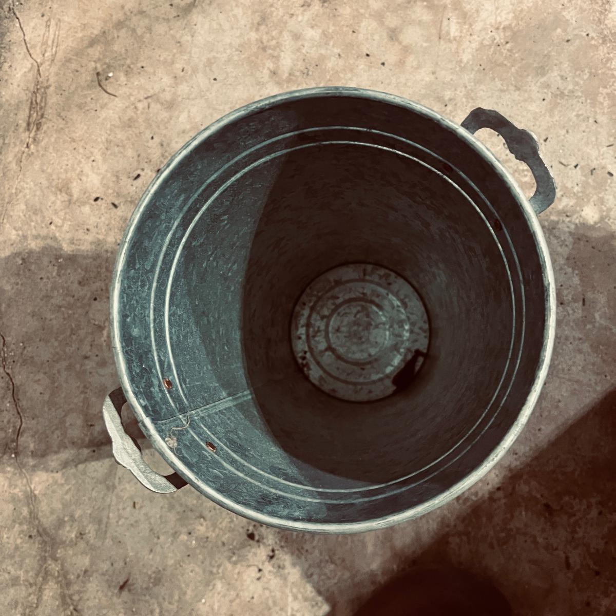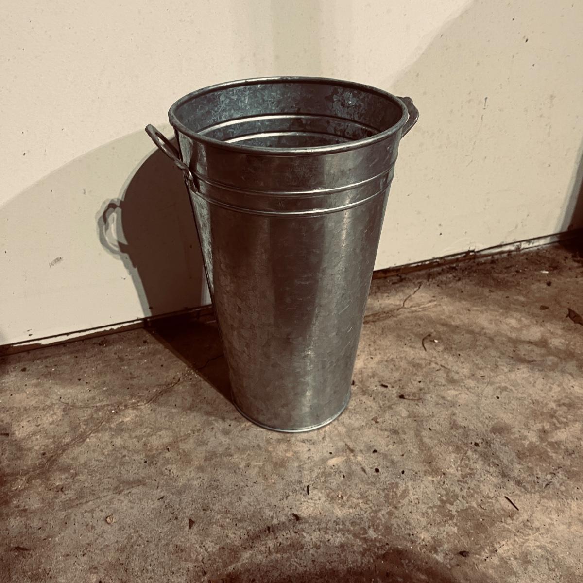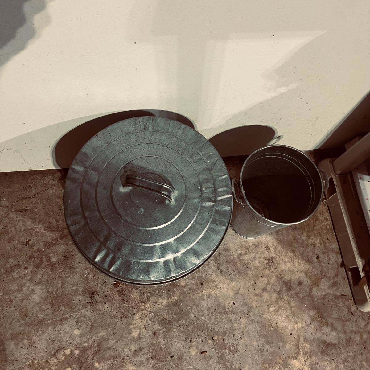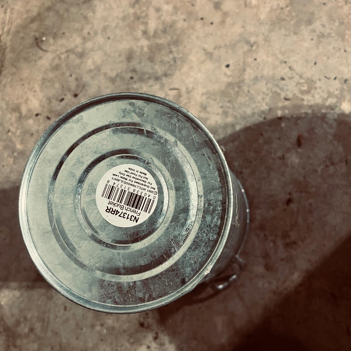 Lot includes a galvanized washtub, French bucket and a small garbage can with lid that has a hole in the bottom, see pictures. Washtub measures 21.5”D x 11”H.