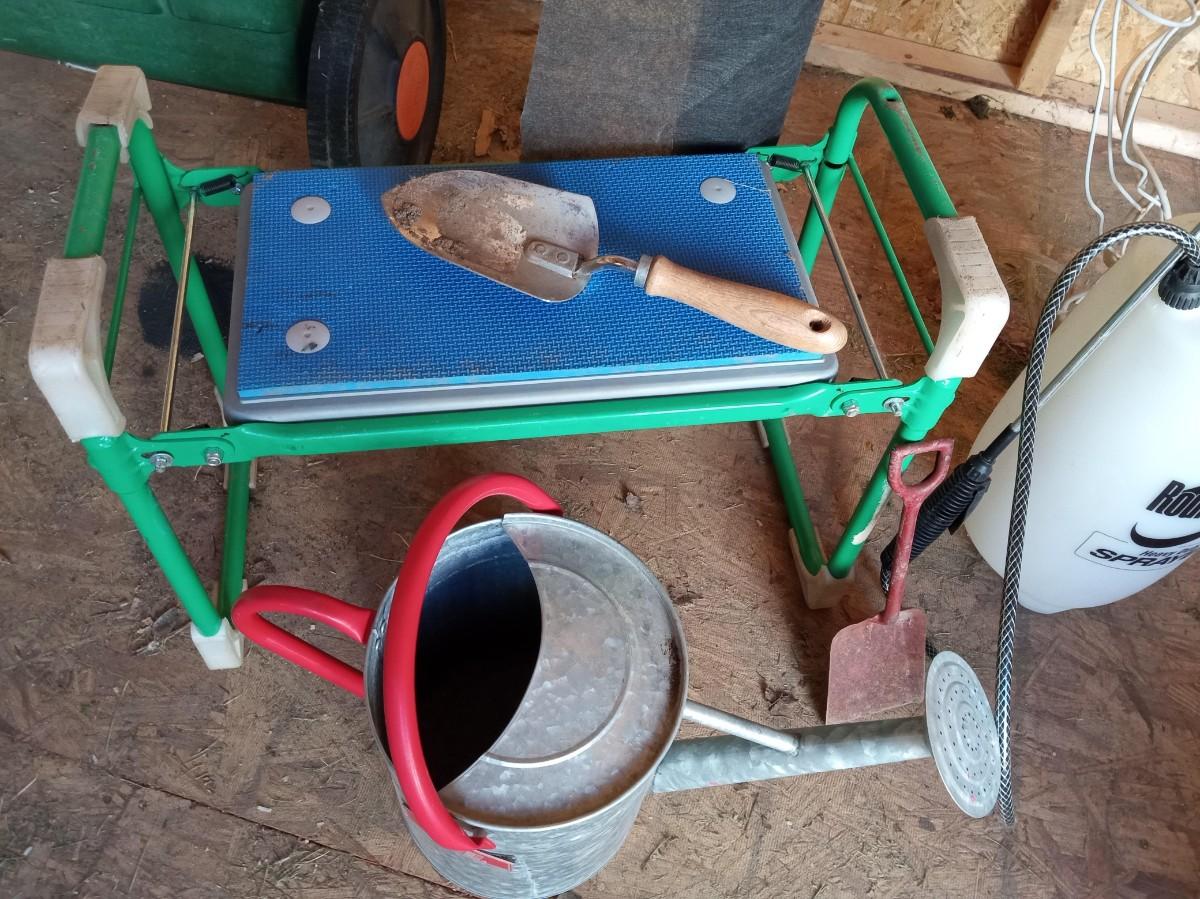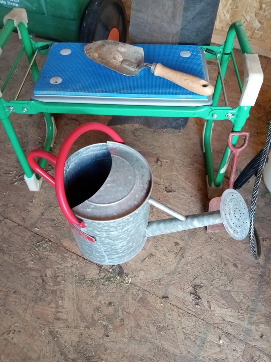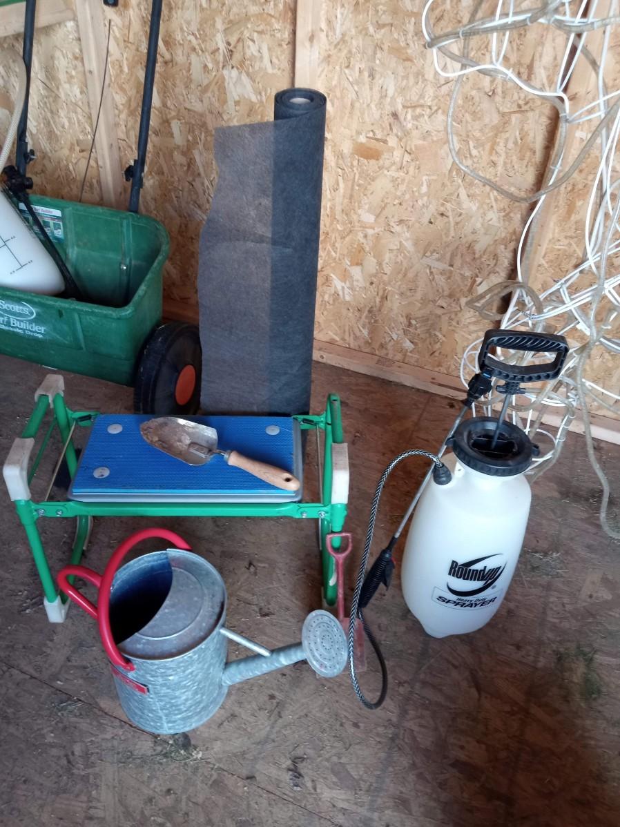 GALVANIZED WATER CAN, GARDENING SEAT, SPRAYER, WEED BARRIER