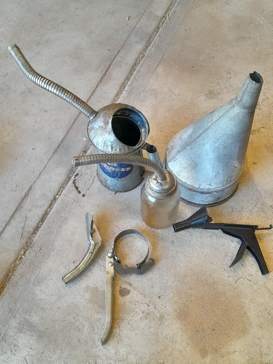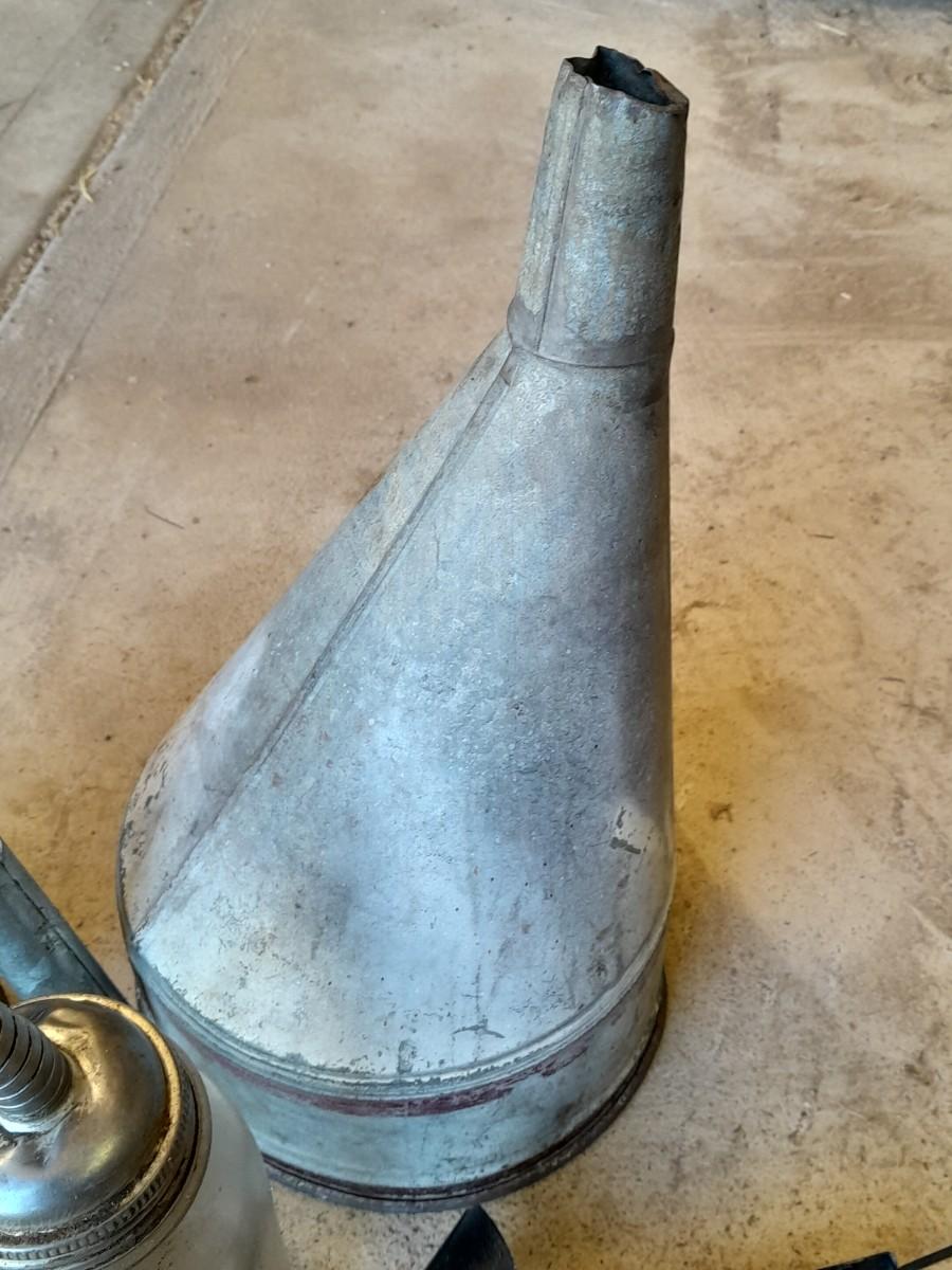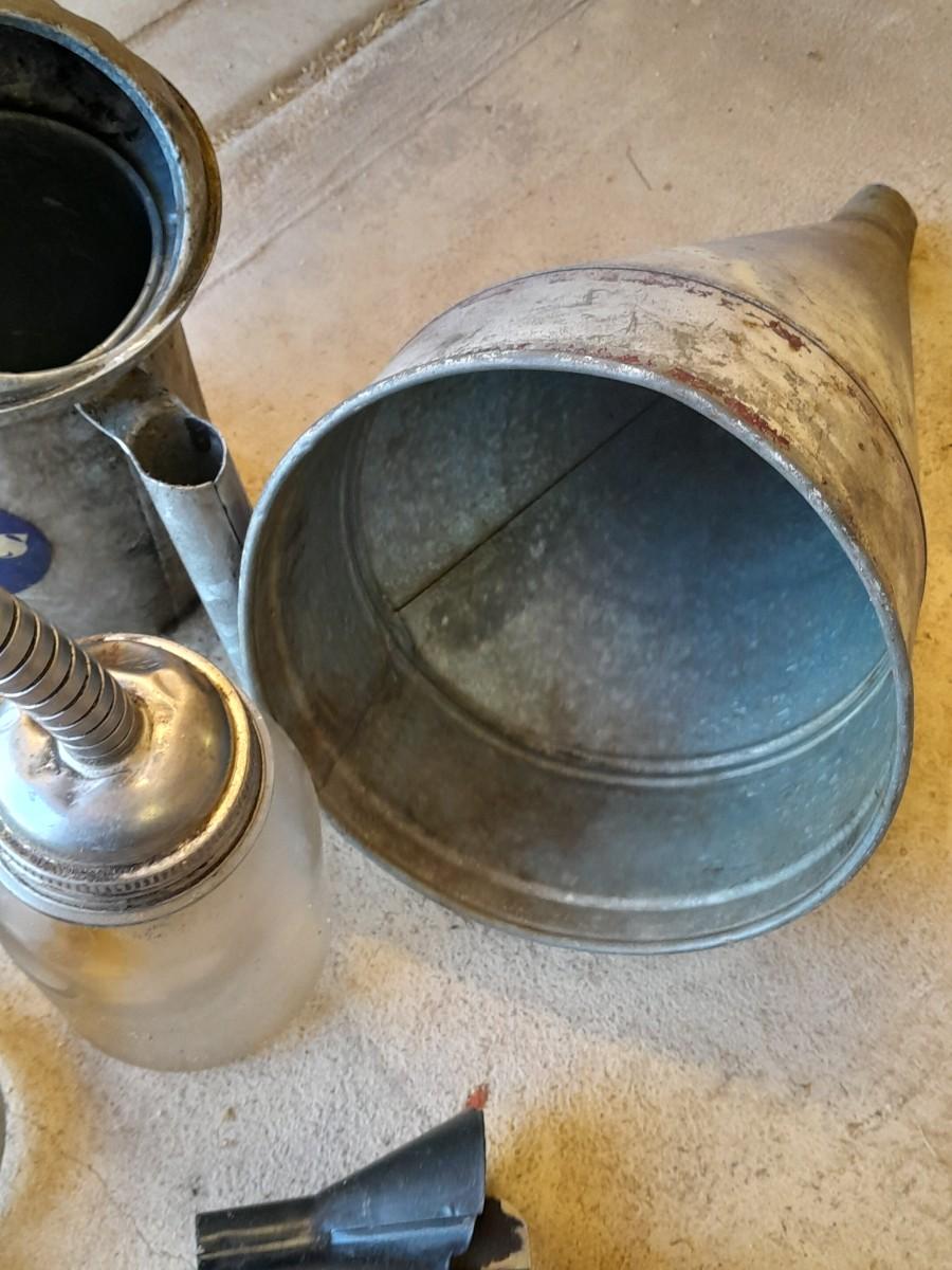 GALVENIZED METAL OIL CAN, FUNNELS, AND MORE