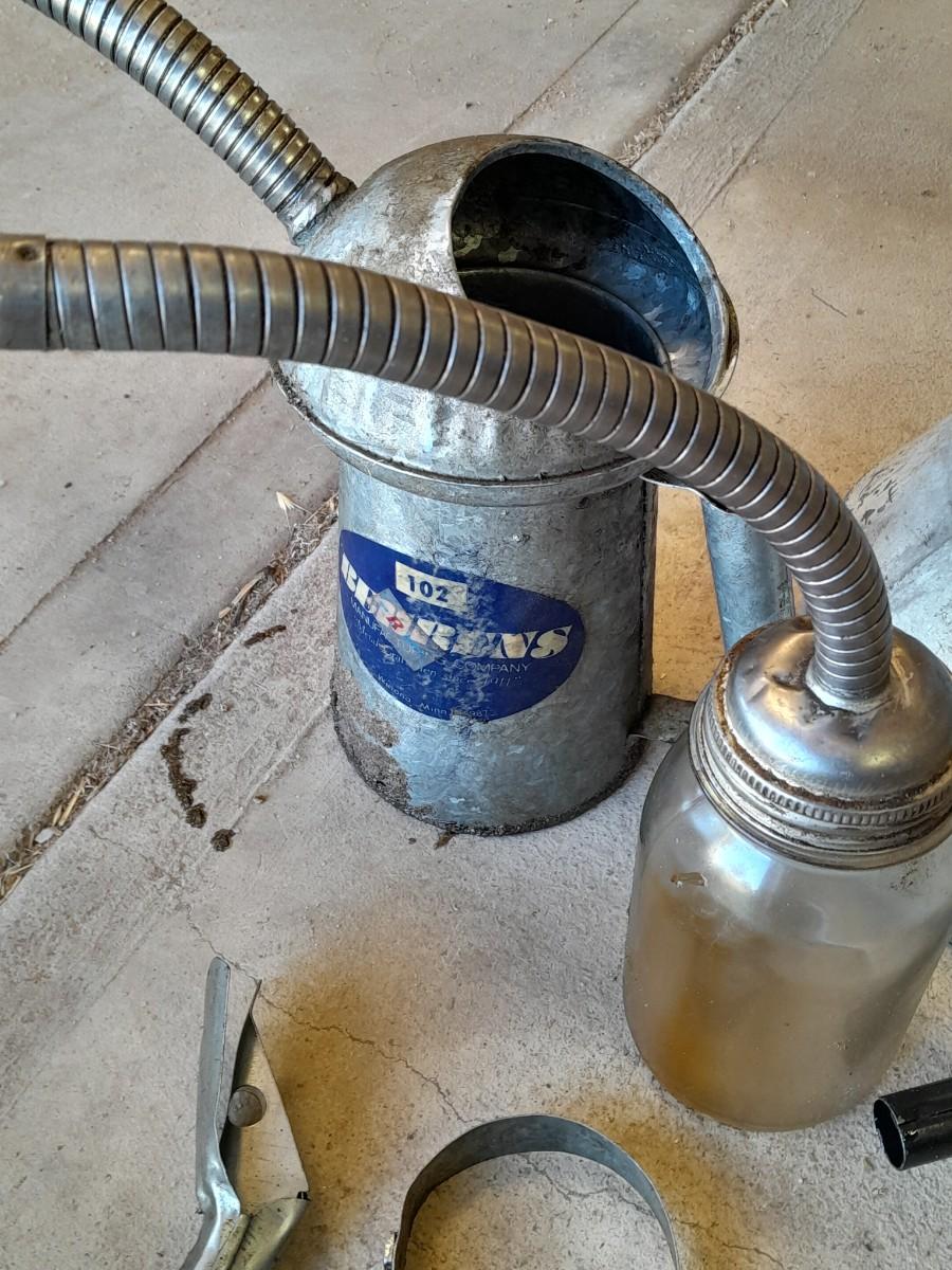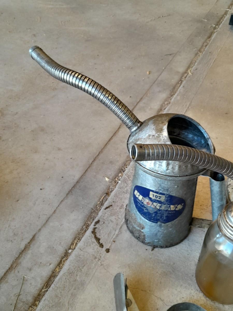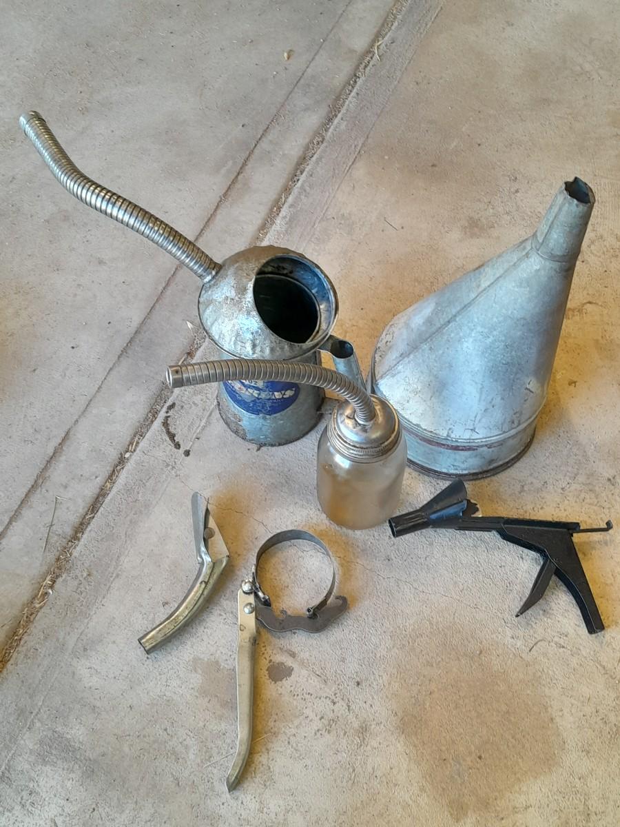 GALVENIZED METAL OIL CAN, FUNNELS, AND MORE