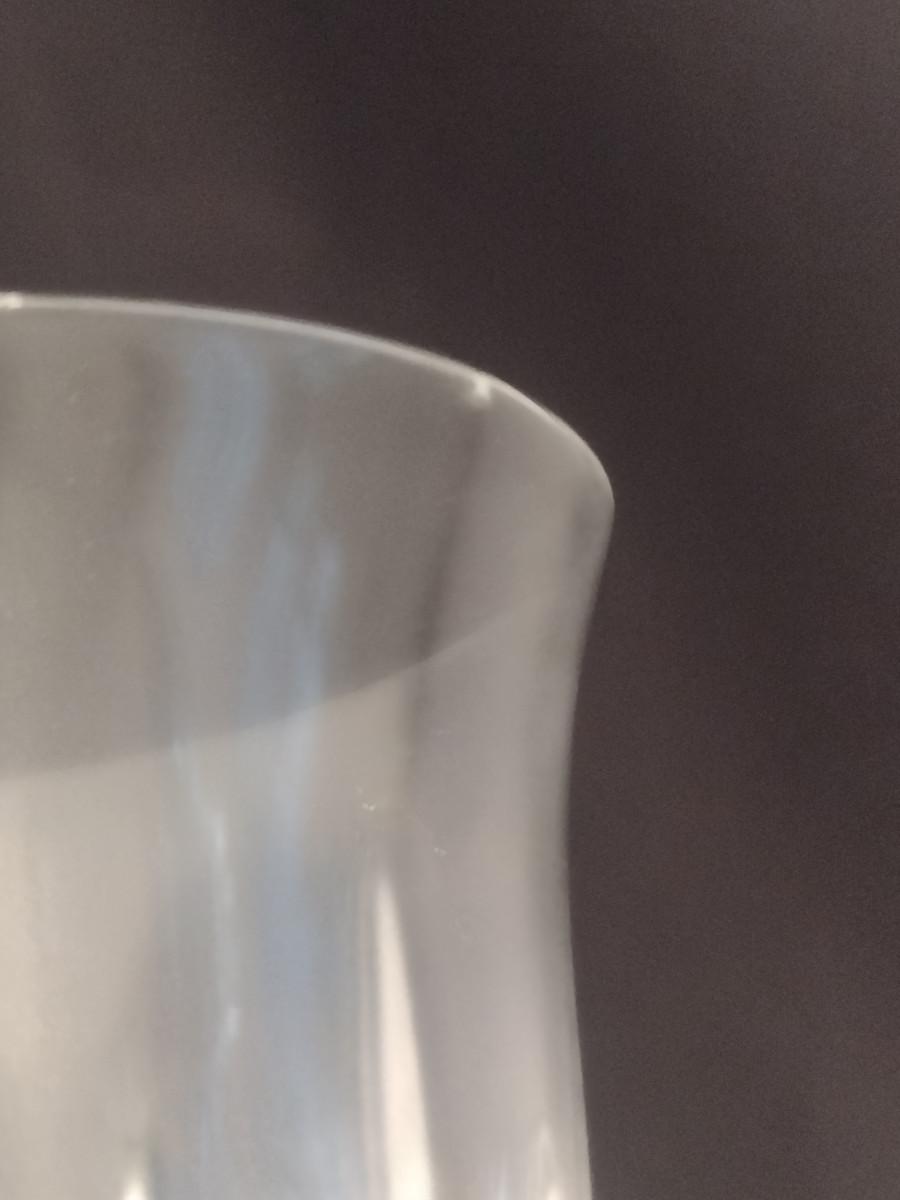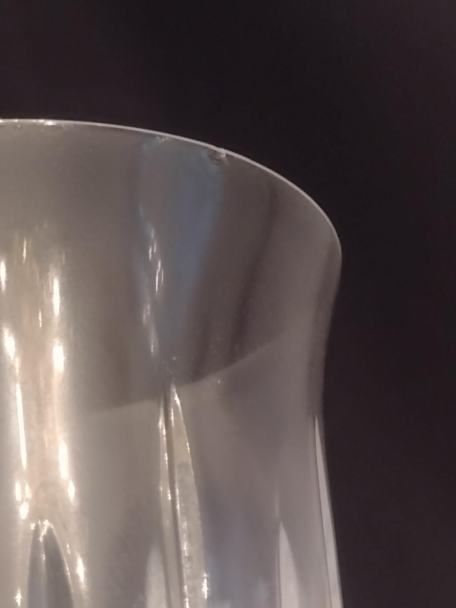 Galway Irish Crystal Water Goblets- Possibly Longford Pattern- Eight Pieces. Maker's marks are mostly worn off and barely discernible. Three pieces have small chigger bite on rim.