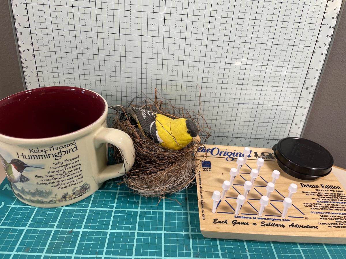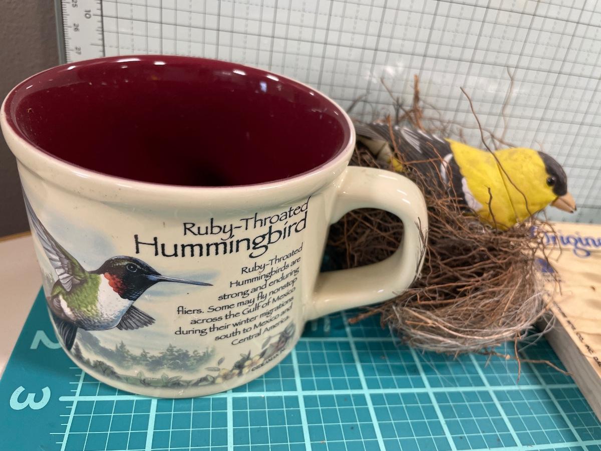 Game, bird in nest and mug