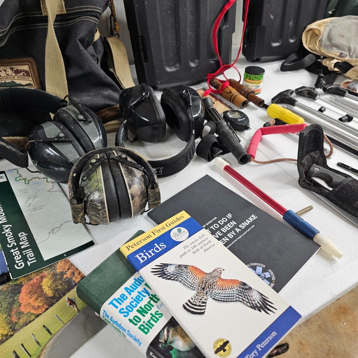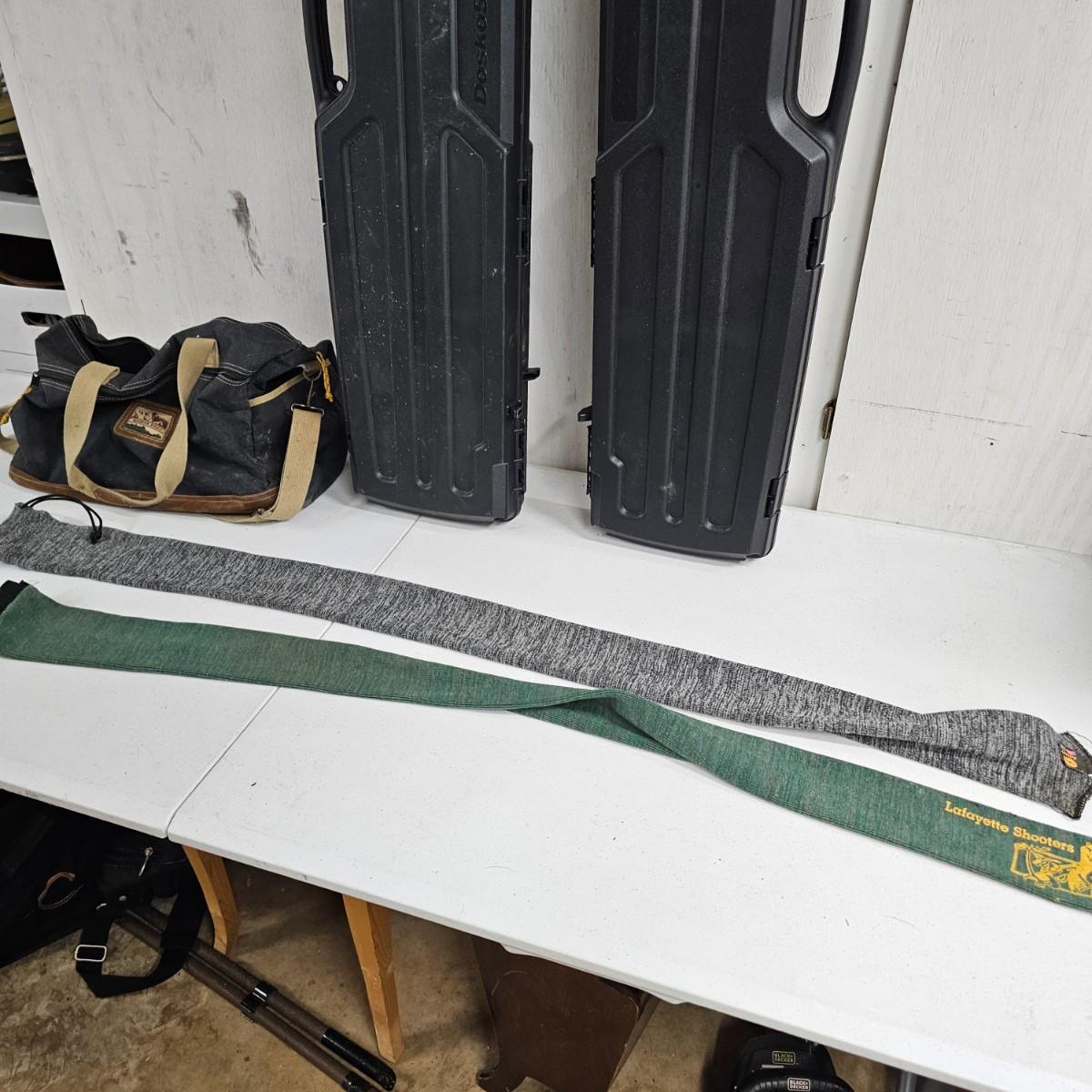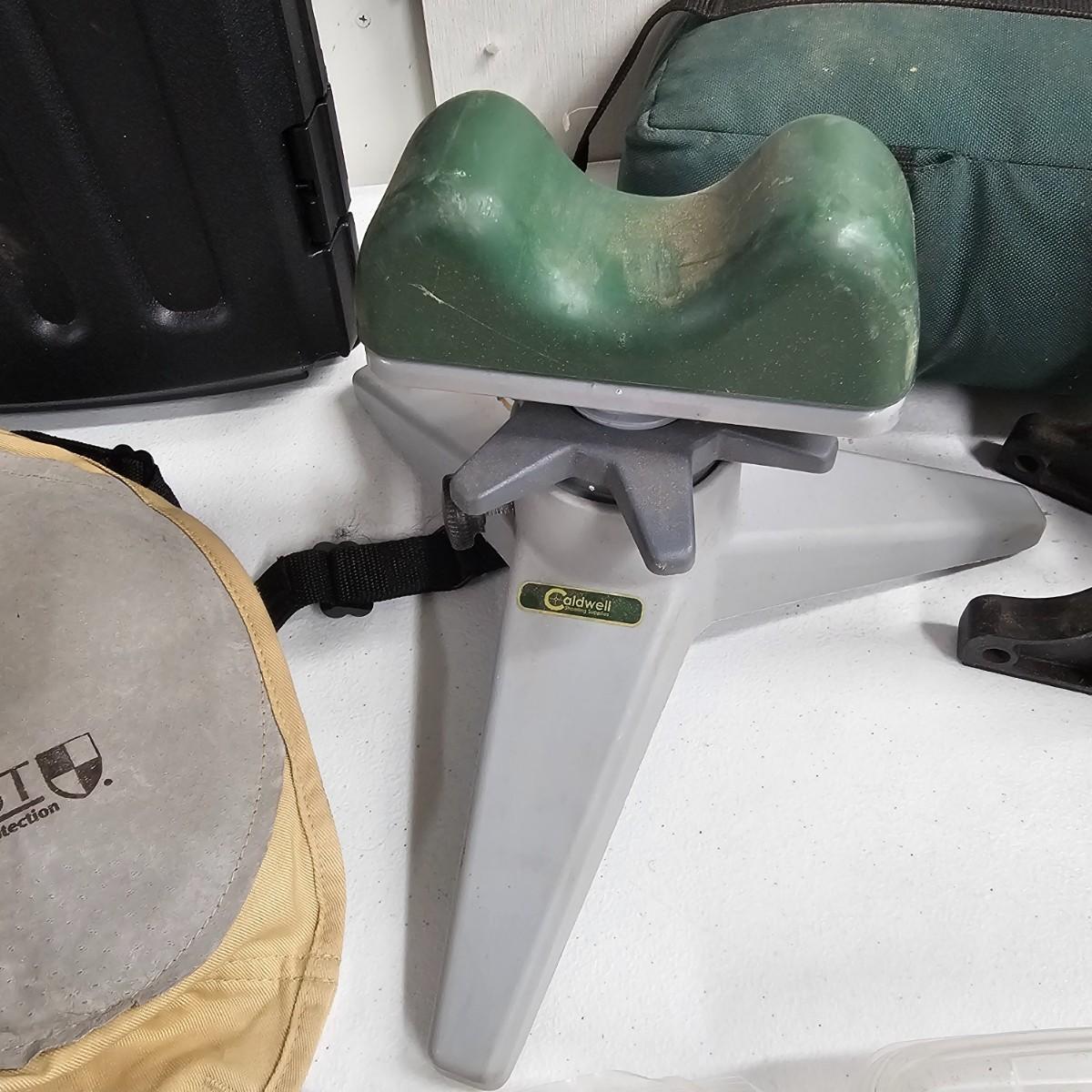 Duck calls and CD, carry bags, tour books and more. Several sets of gun cleaning rods from .22 caliber to shotgun size. Pads and patches. Two different sets of gun rests fir shooting it practice. Triangular piece is 12" D x 8"H and adjustable. Two knit gun socks are 48" long. Two hard shell plastic long gun cases, 10.5" x 48" x 3"H, will hold a 45" long firearm. Many other items, see photos for details. Local pickup only.