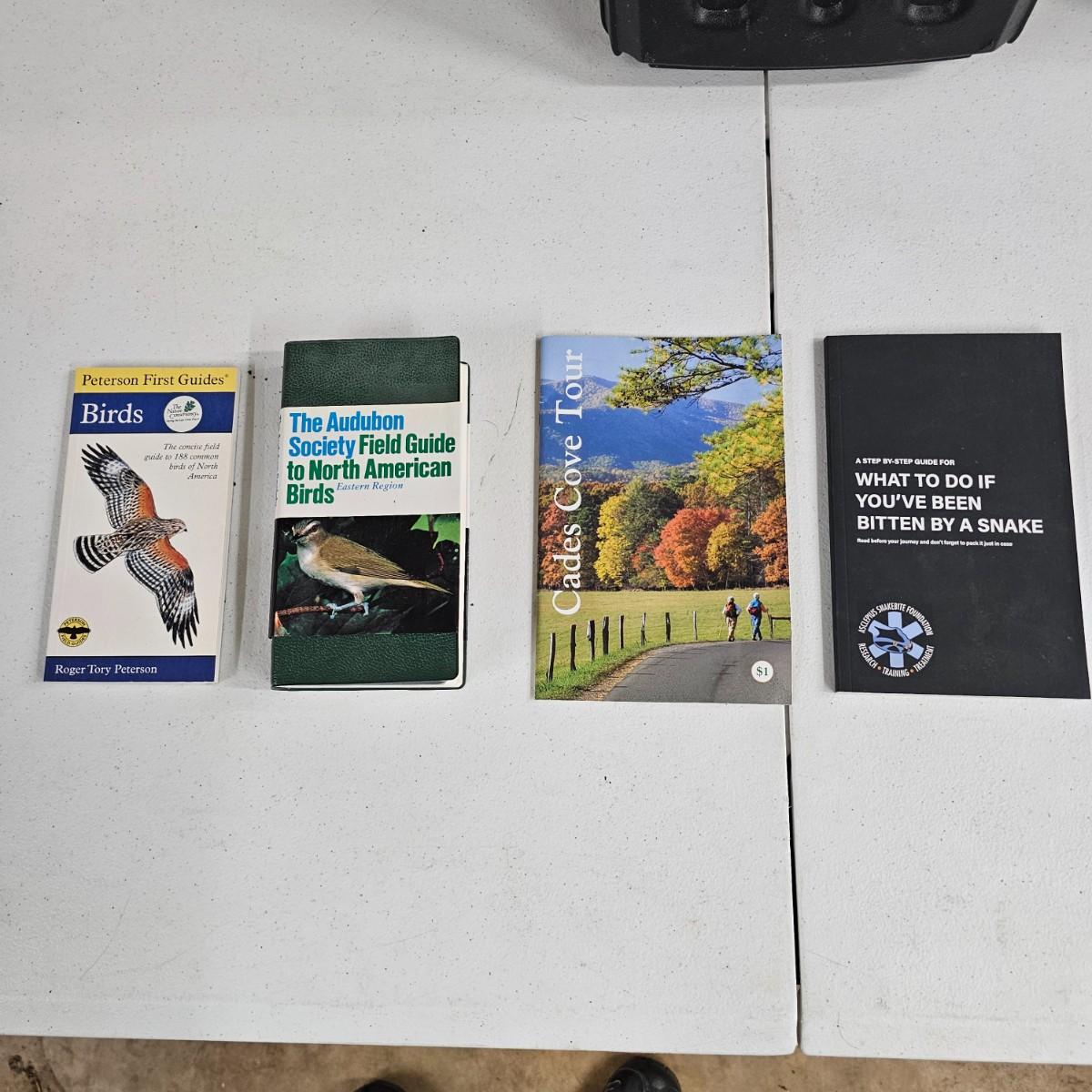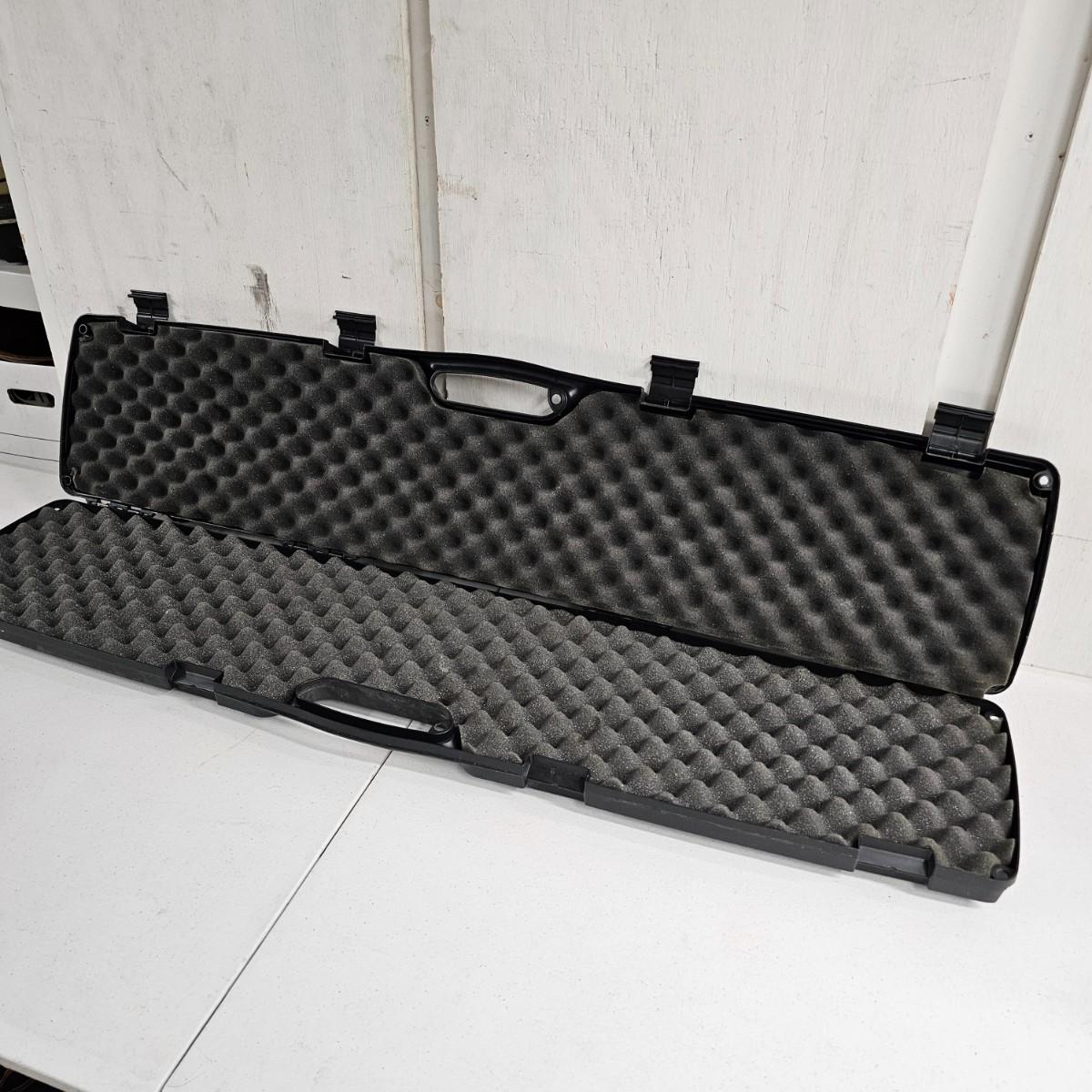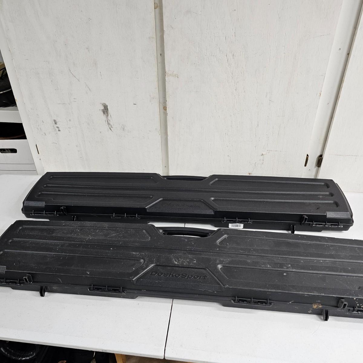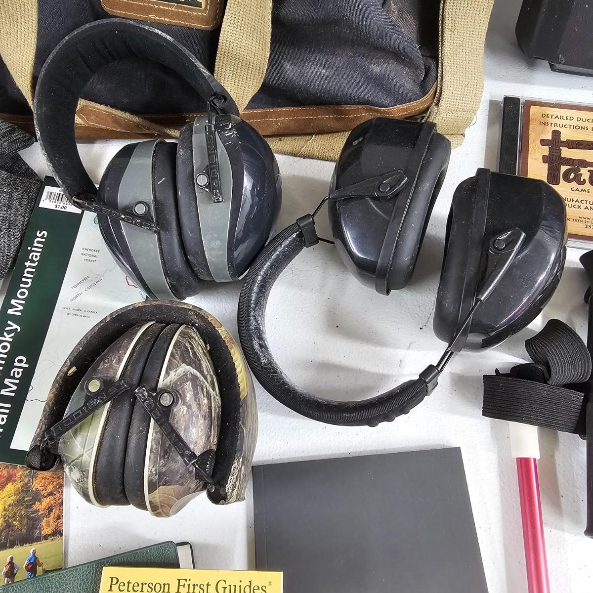Duck calls and CD, carry bags, tour books and more. Several sets of gun cleaning rods from .22 caliber to shotgun size. Pads and patches. Two different sets of gun rests fir shooting it practice. Triangular piece is 12" D x 8"H and adjustable. Two knit gun socks are 48" long. Two hard shell plastic long gun cases, 10.5" x 48" x 3"H, will hold a 45" long firearm. Many other items, see photos for details. Local pickup only.
