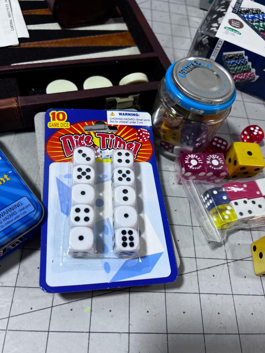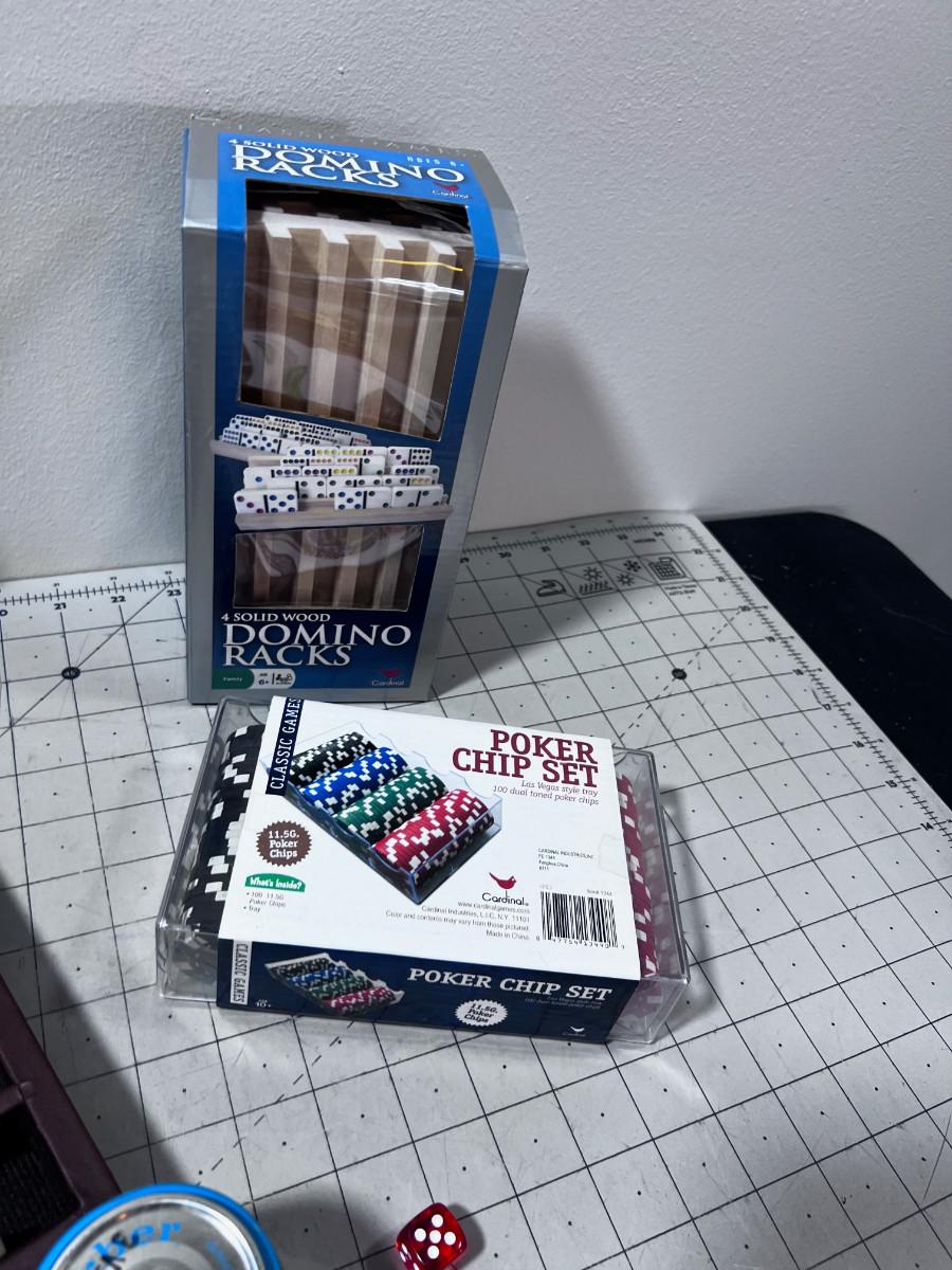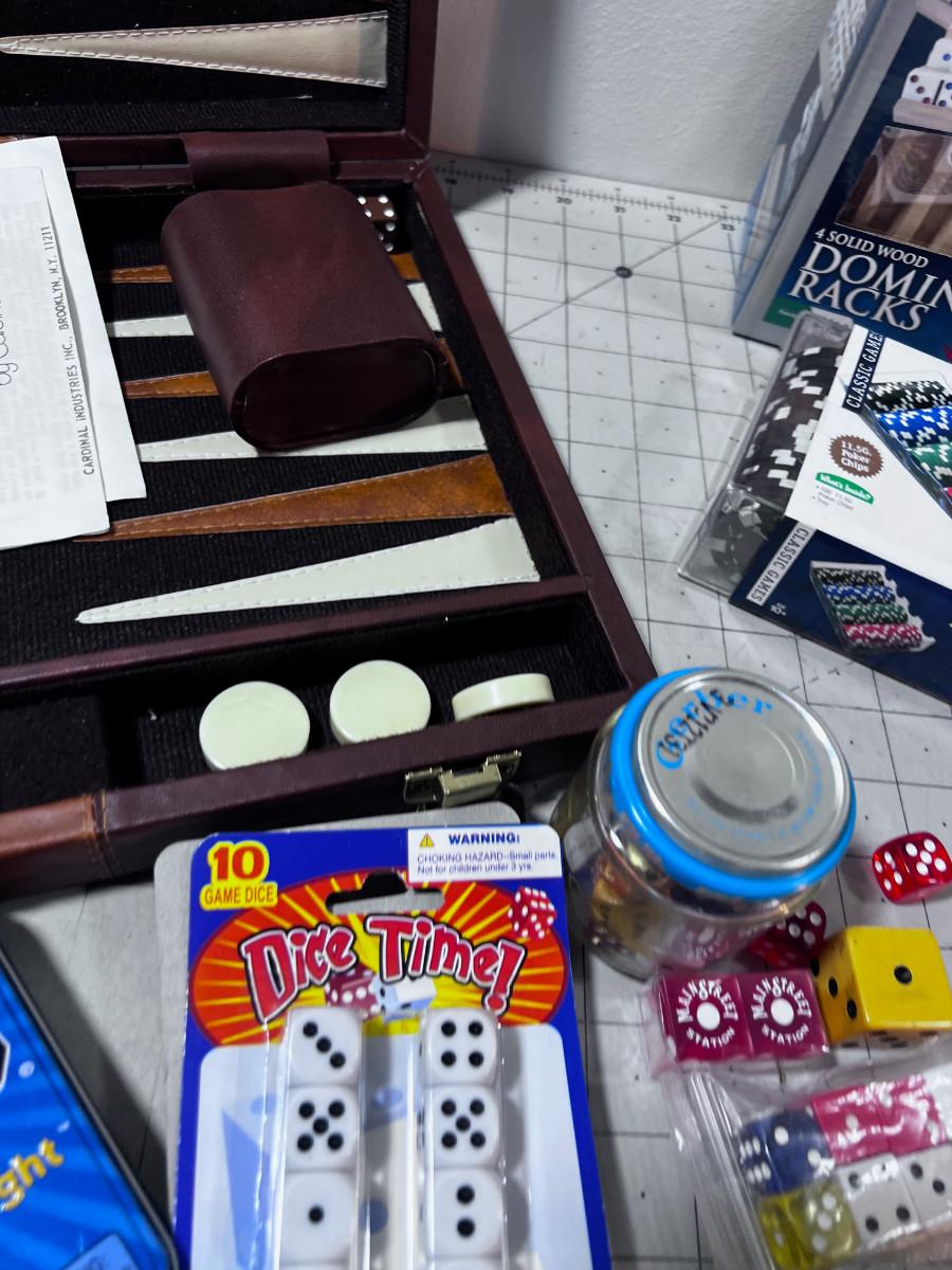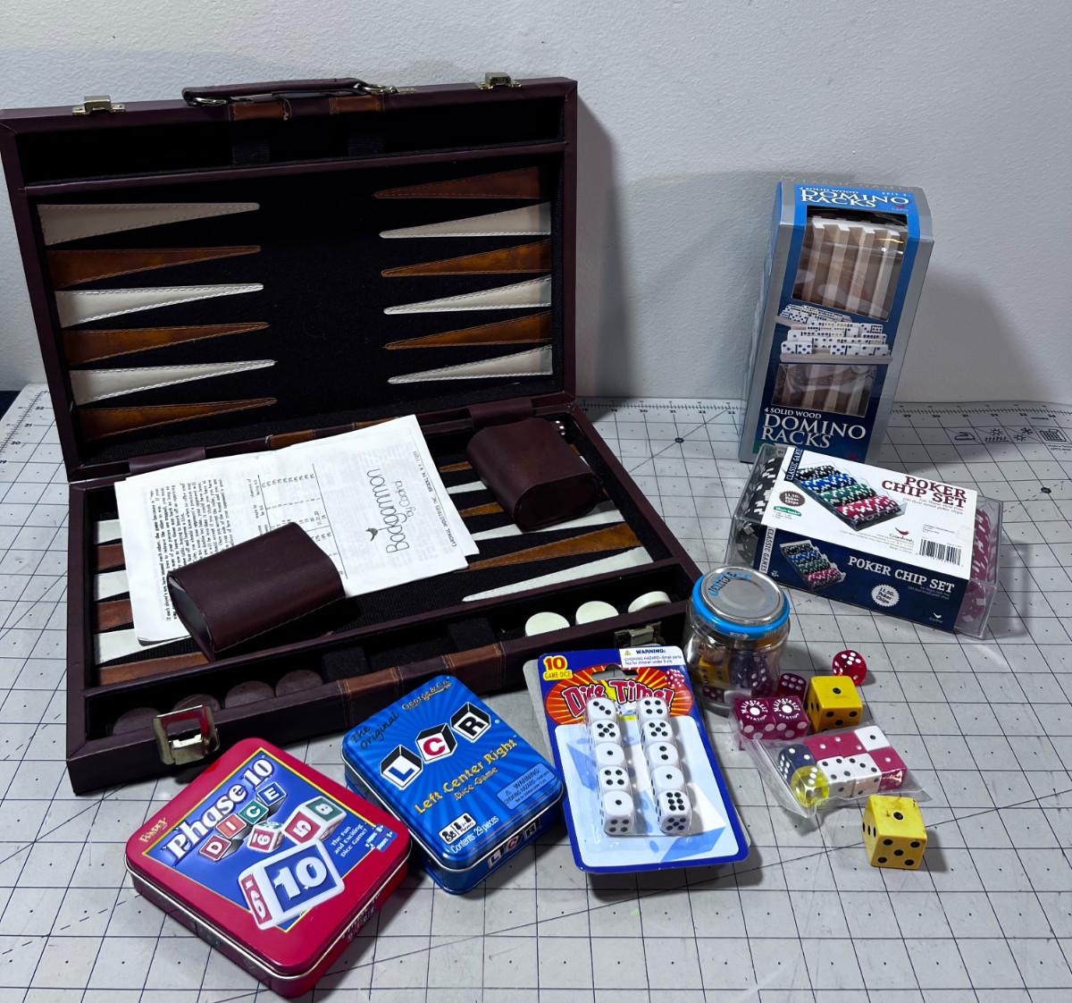 FUN STUFF! Dice. Domino Racks. And incomplete Backgammon Case.