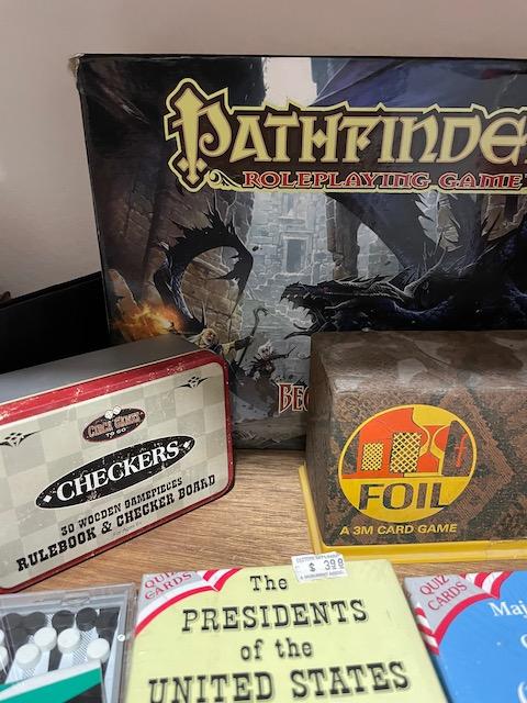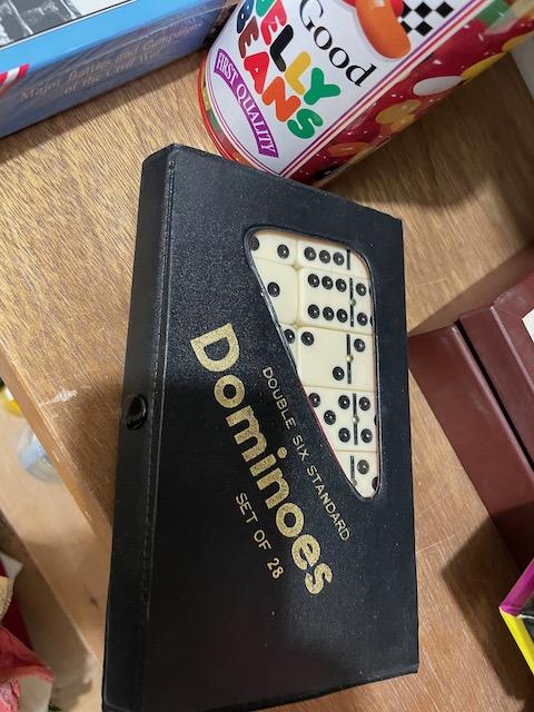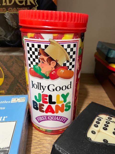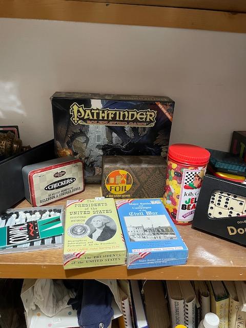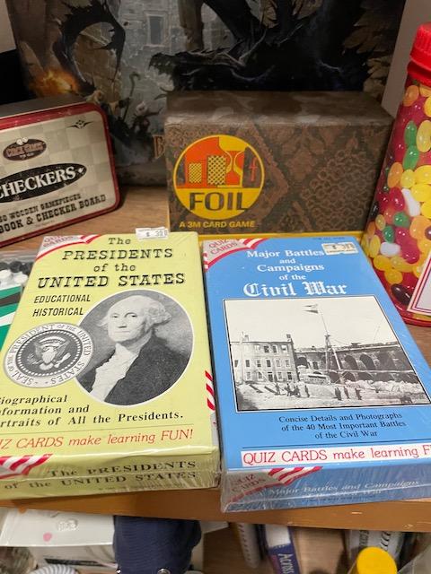 Games 01 - quiz cards - Foil card game - Jelly Bean trick can, spring loaded - checkers and dominos - no books included.