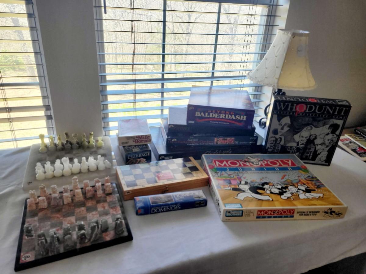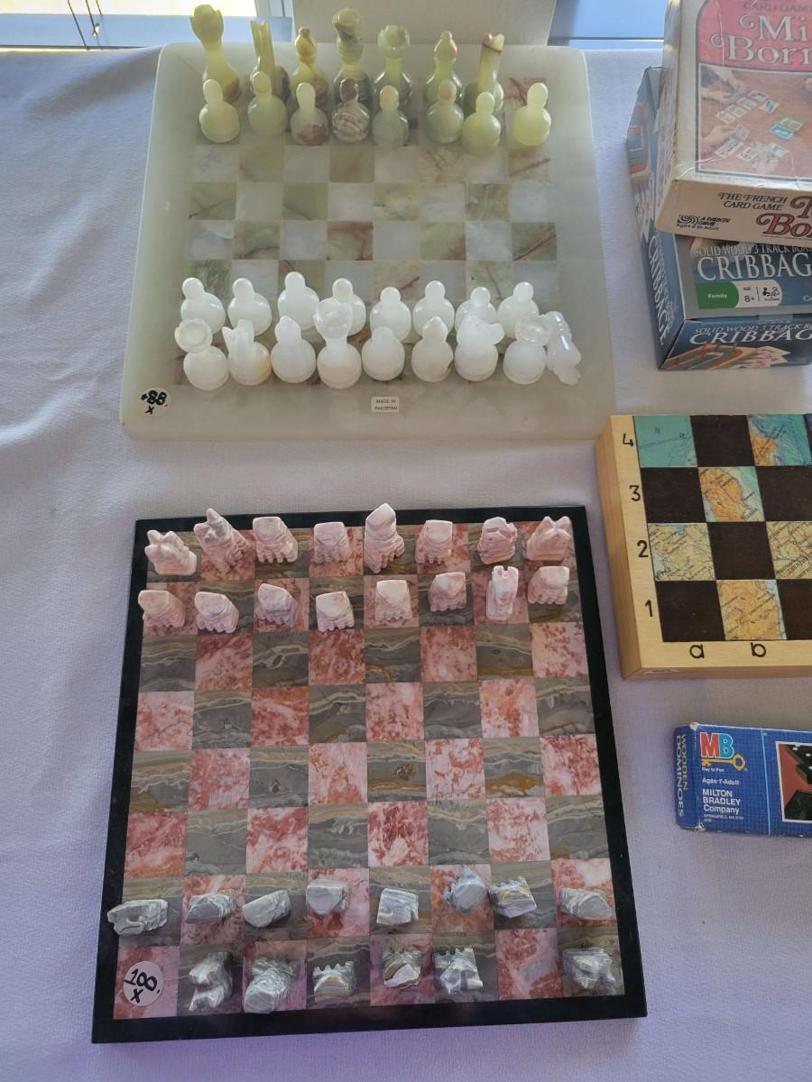 Variety of board games and chess boards. Note that the 2 stone chess sets are both missing 1-2 pieces as pictured.