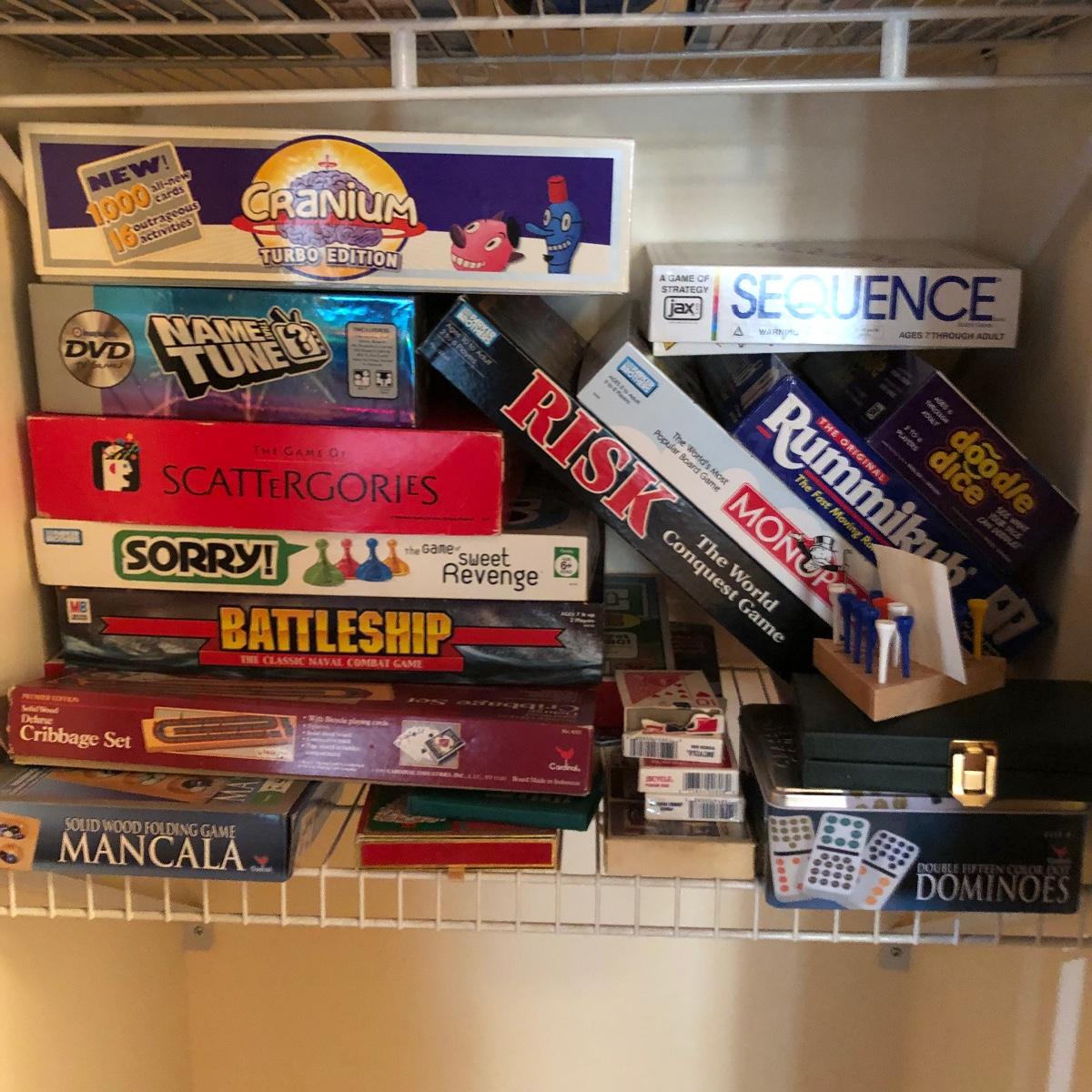 Lot contains a plethora of games including Risk, Sorry, Battleship, Monopoly, Cranium, Dominoes, Sequence, Mancala and more.