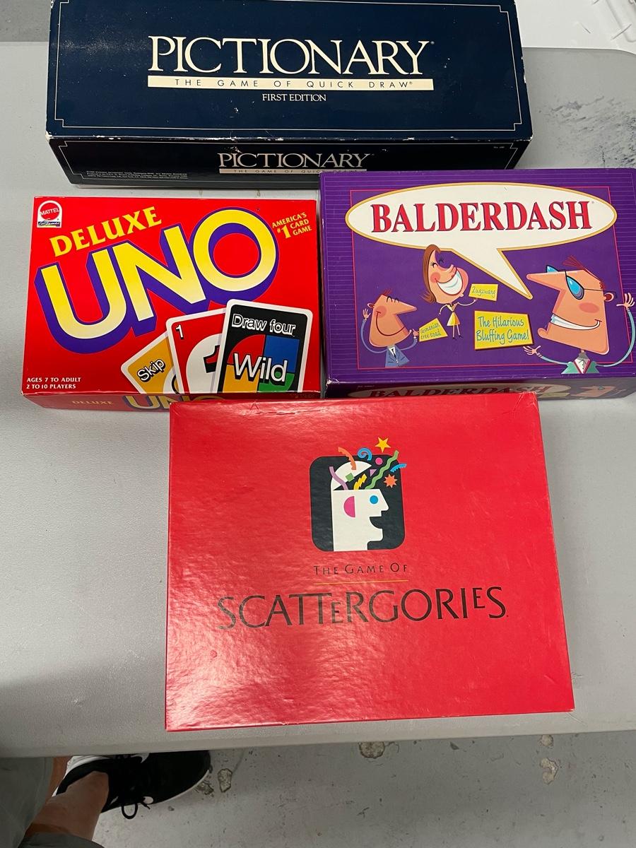 Lot 360 Games Galore: Deluxe UNO, Balderdash, Scattergories, and Pictionary