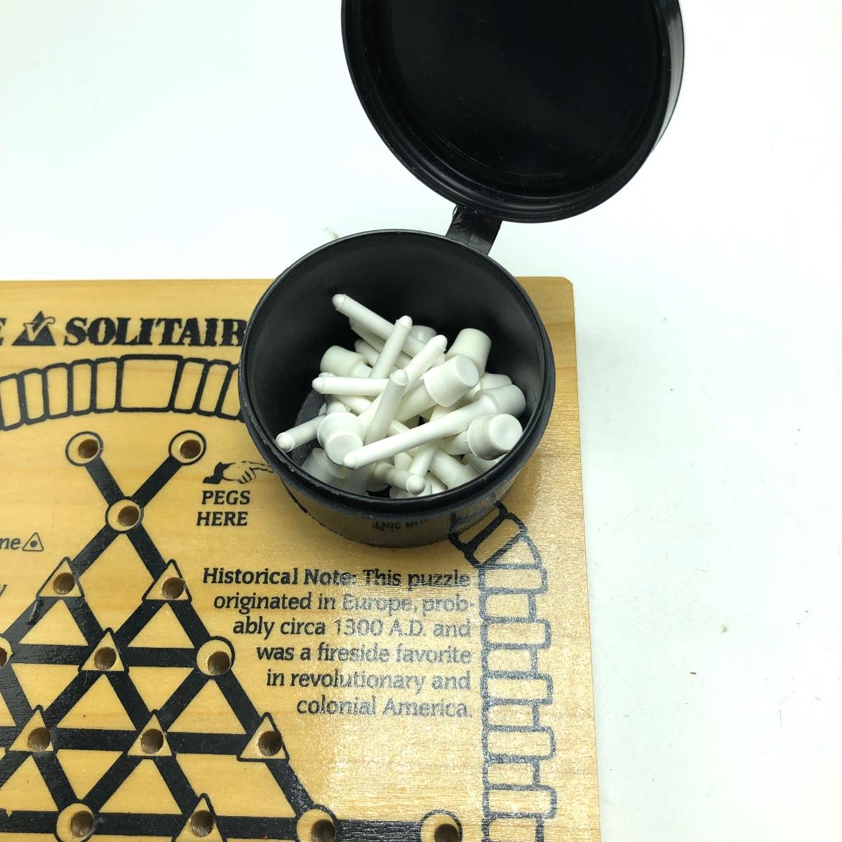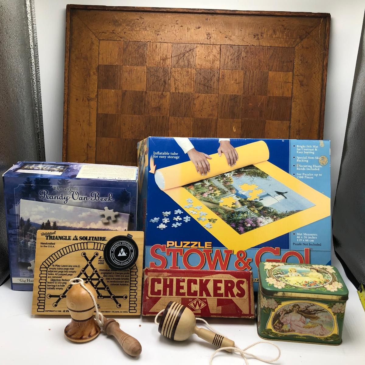Lot includes a wooden checker board with vintage checkers, triangle solitaire, marbles, puzzle, Stow & Go puzzle mover and a wooden ball and cup toy.