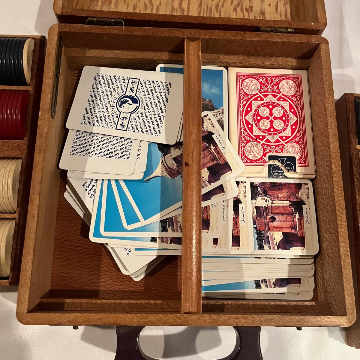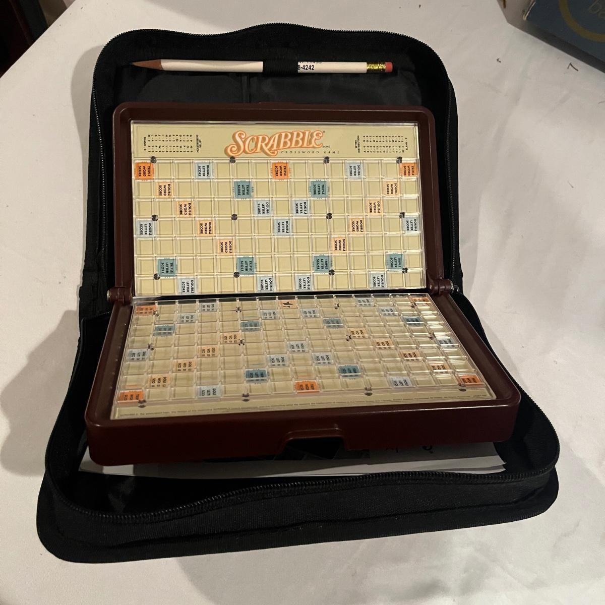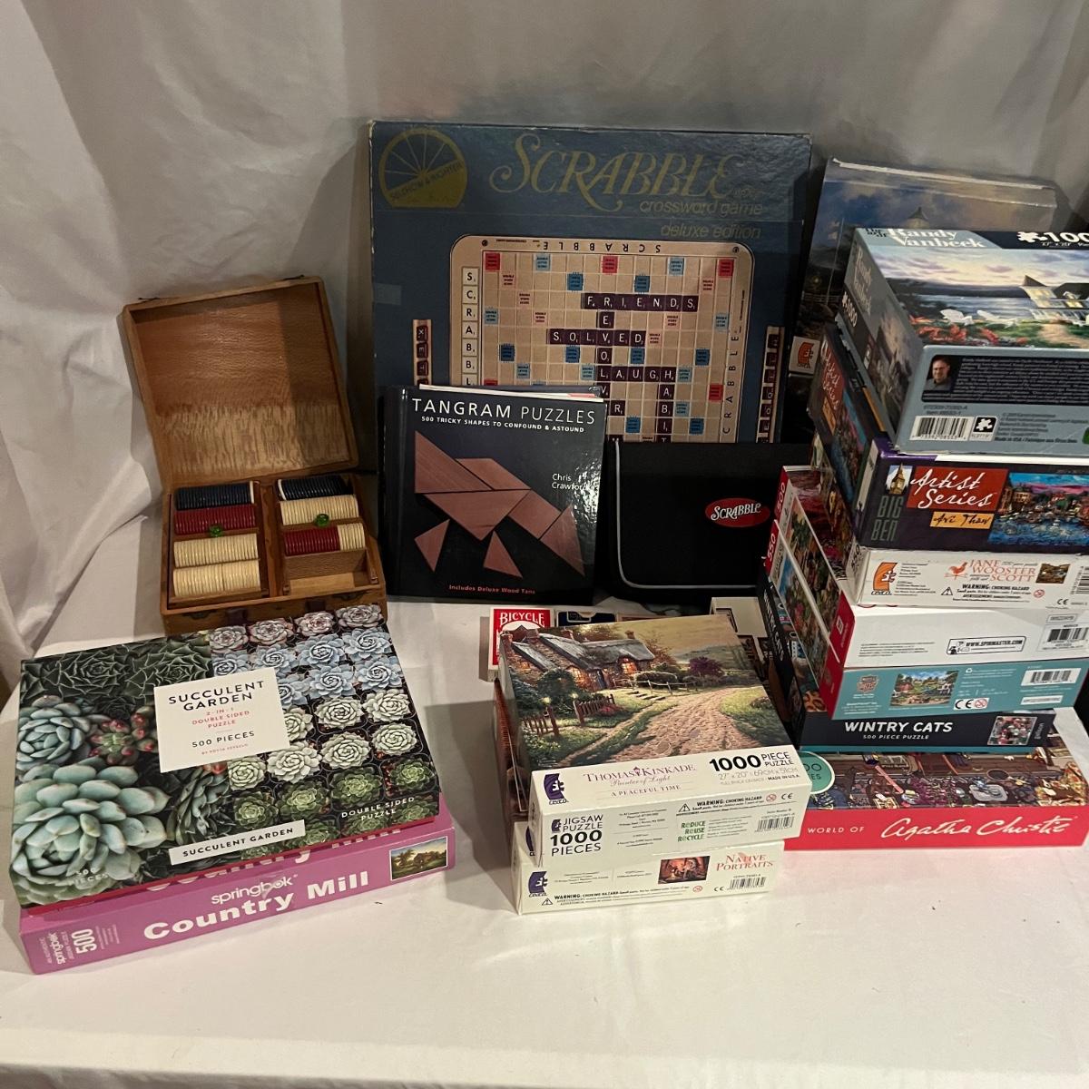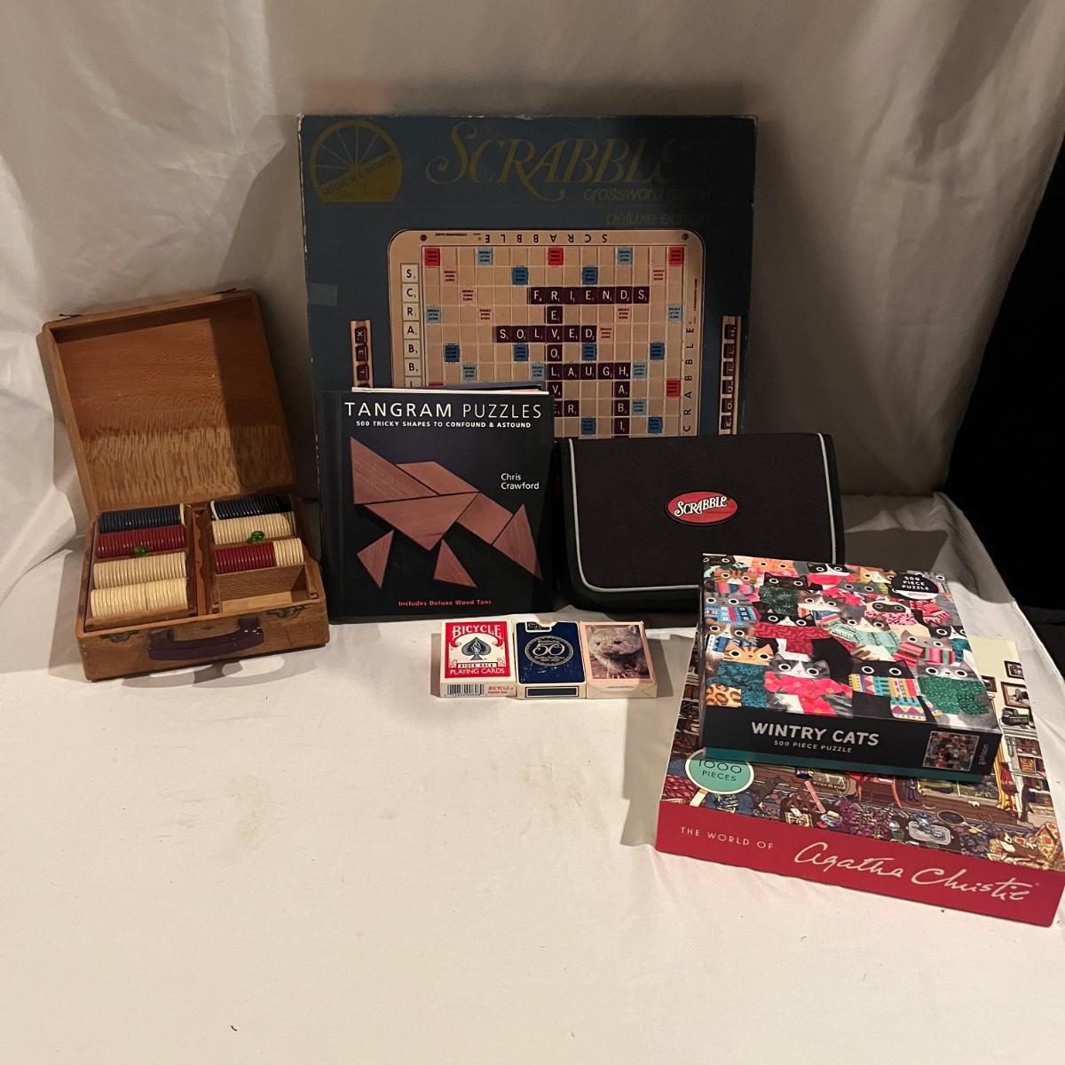 Lot includes portable and home Scrabble games, 13 puzzles, poker chips in a wooden case, tangram puzzles and used playing cards. Wooden case measures 8.5” x 8.5” x 3”H.