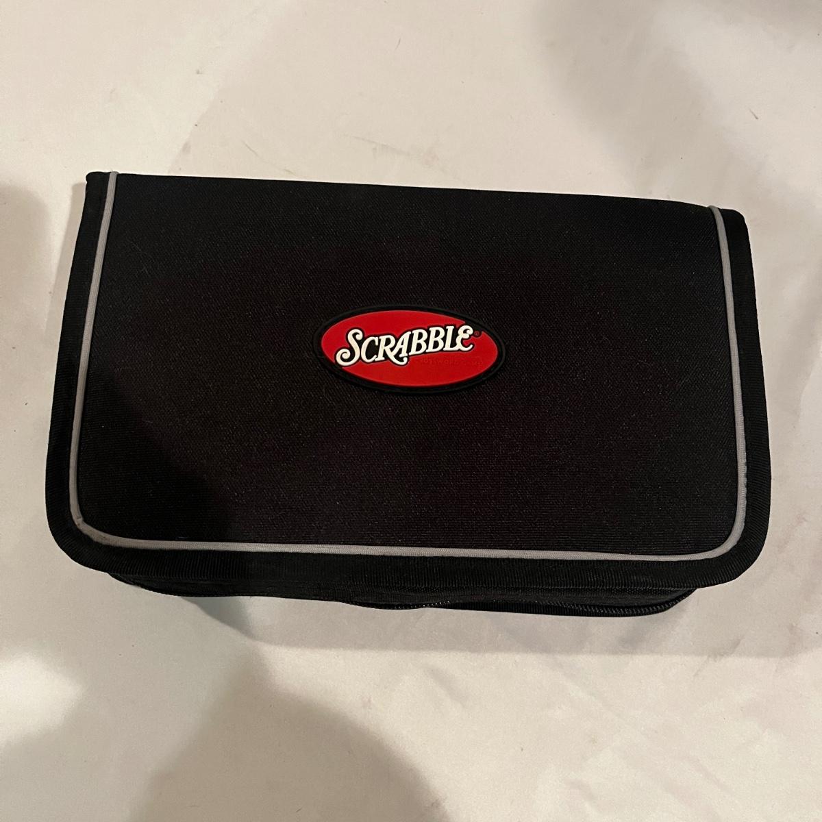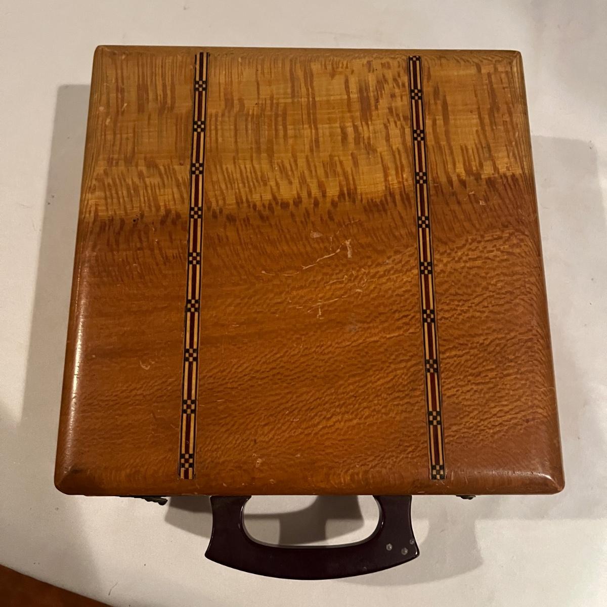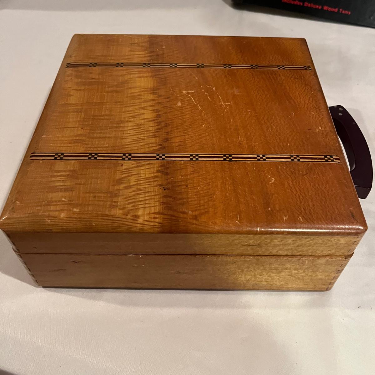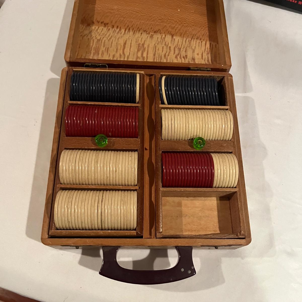 Lot includes portable and home Scrabble games, 13 puzzles, poker chips in a wooden case, tangram puzzles and used playing cards. Wooden case measures 8.5” x 8.5” x 3”H.