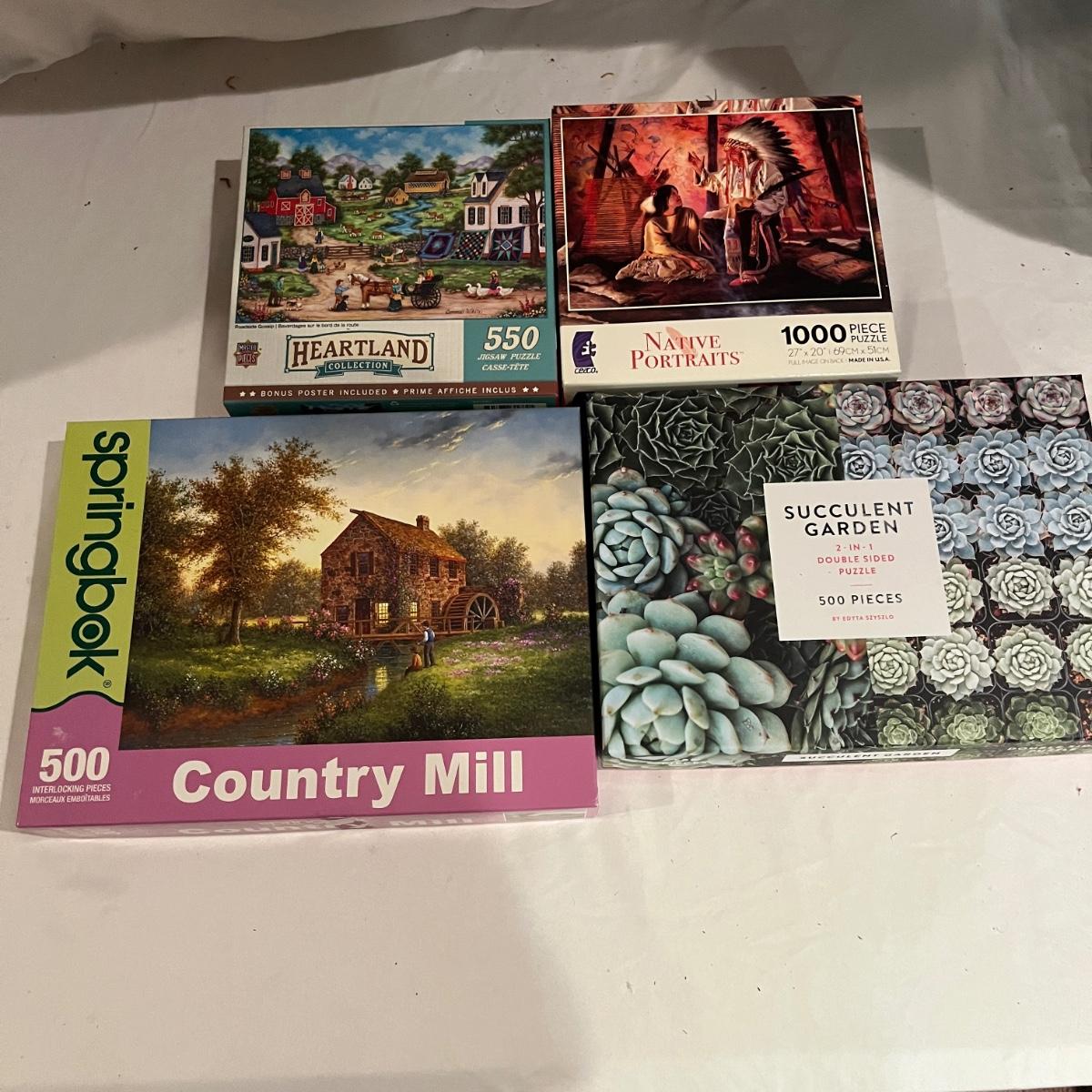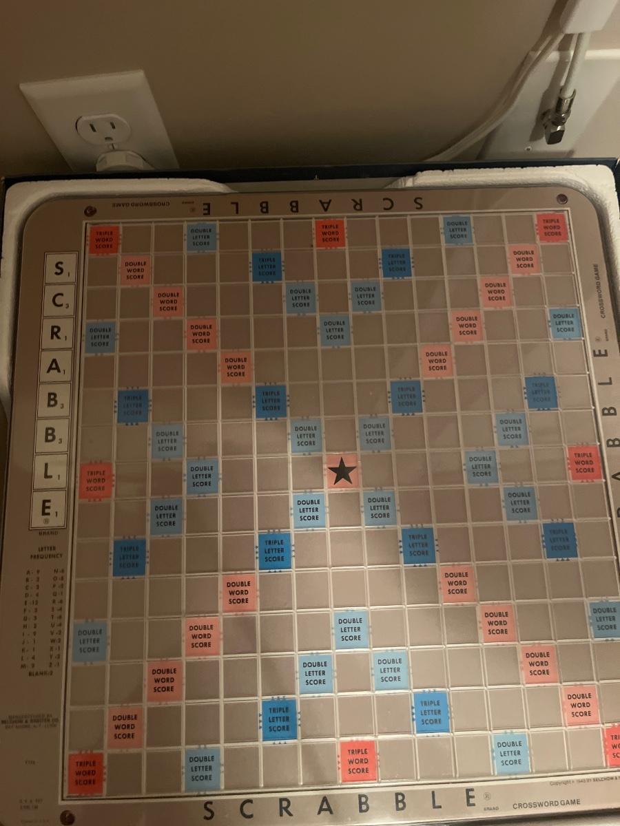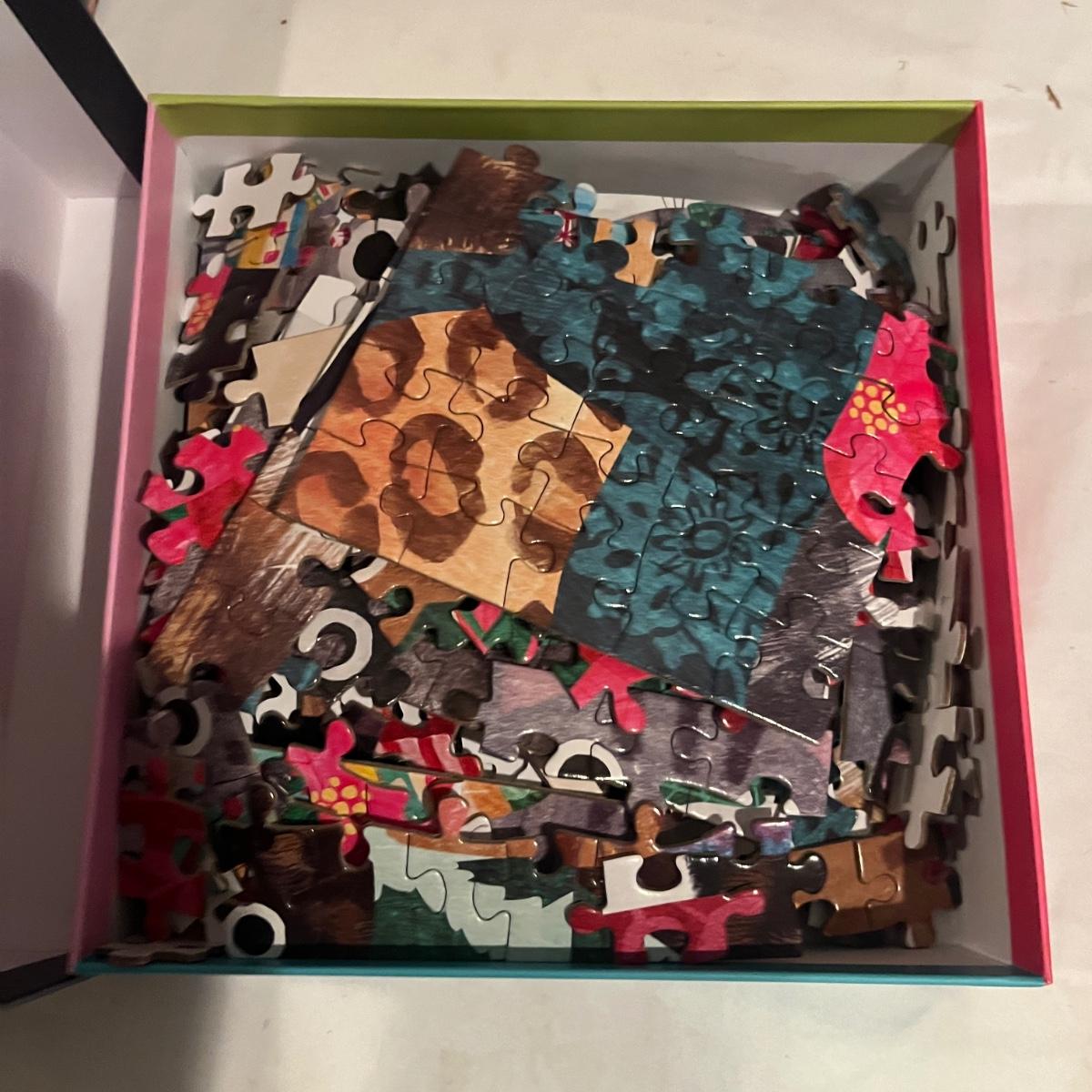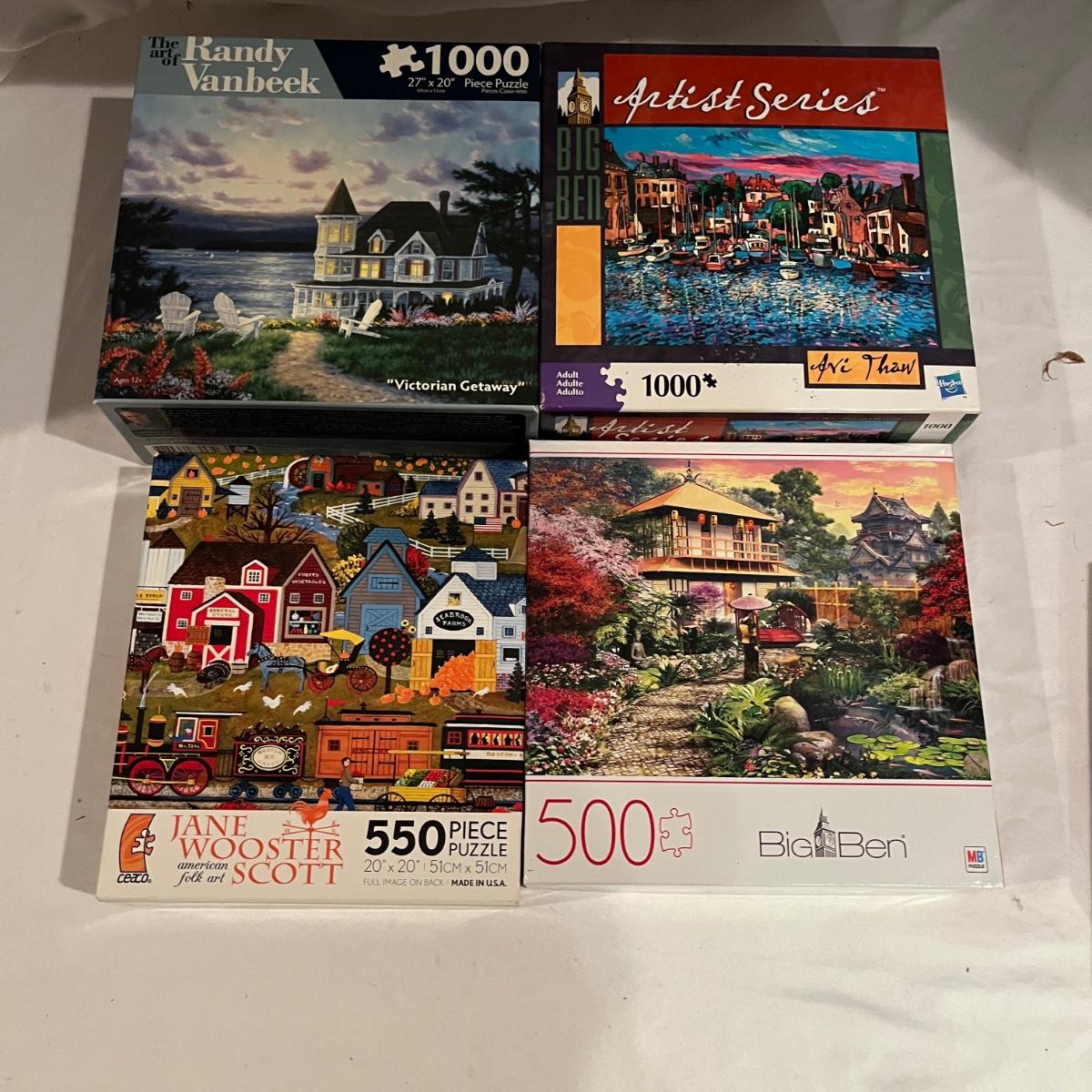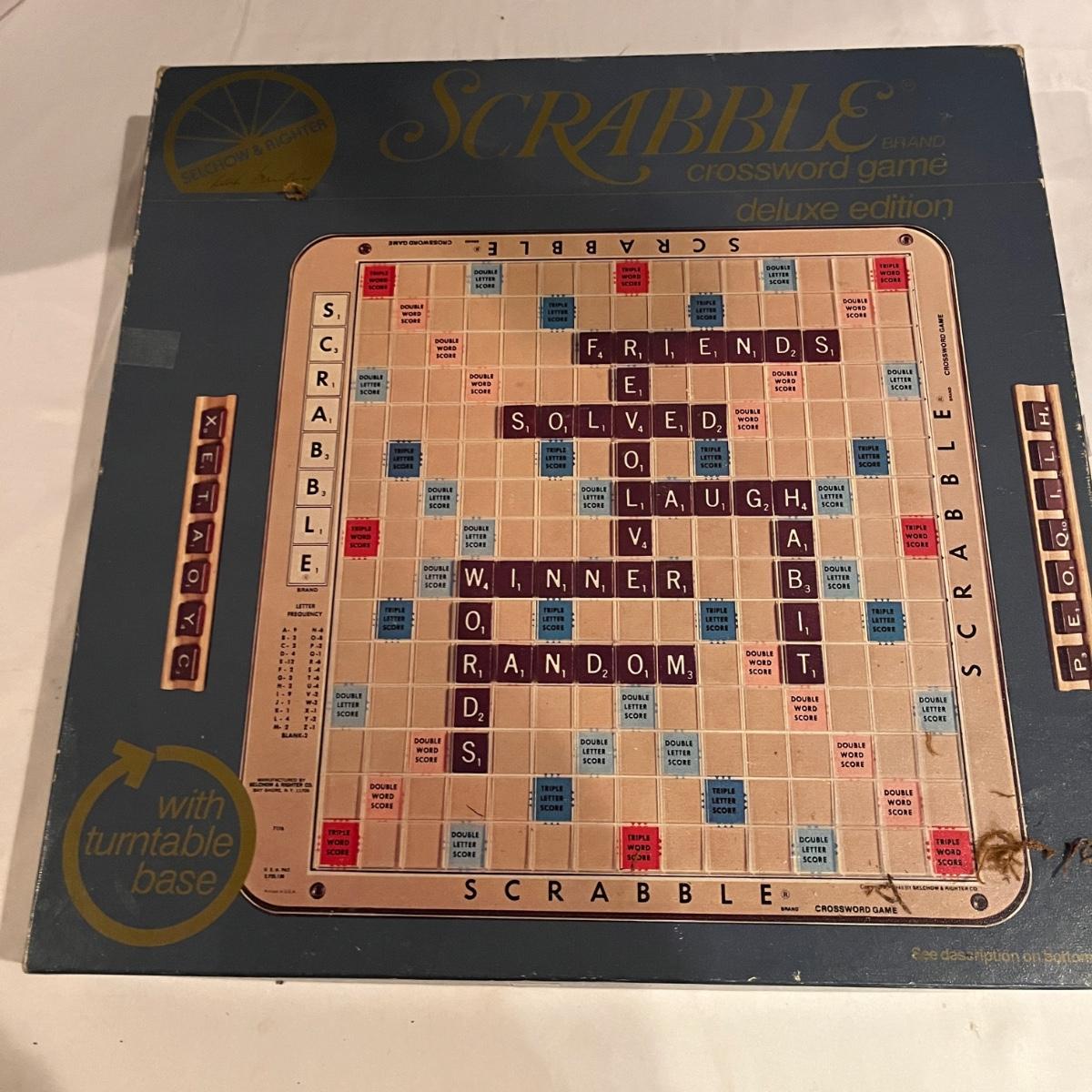 Lot includes portable and home Scrabble games, 13 puzzles, poker chips in a wooden case, tangram puzzles and used playing cards. Wooden case measures 8.5” x 8.5” x 3”H.