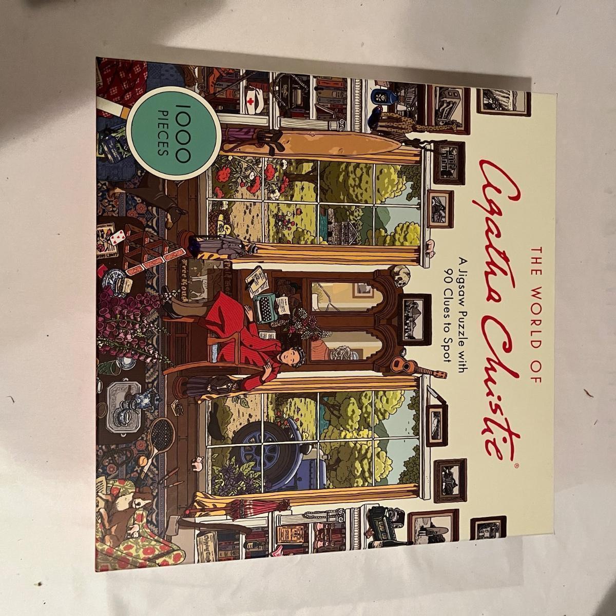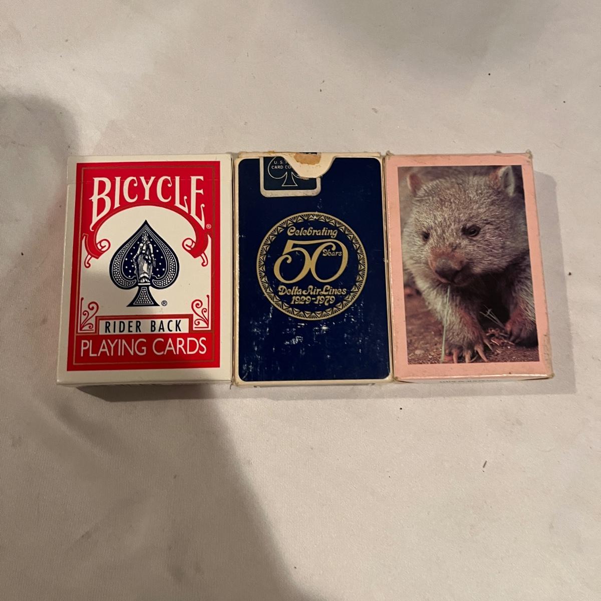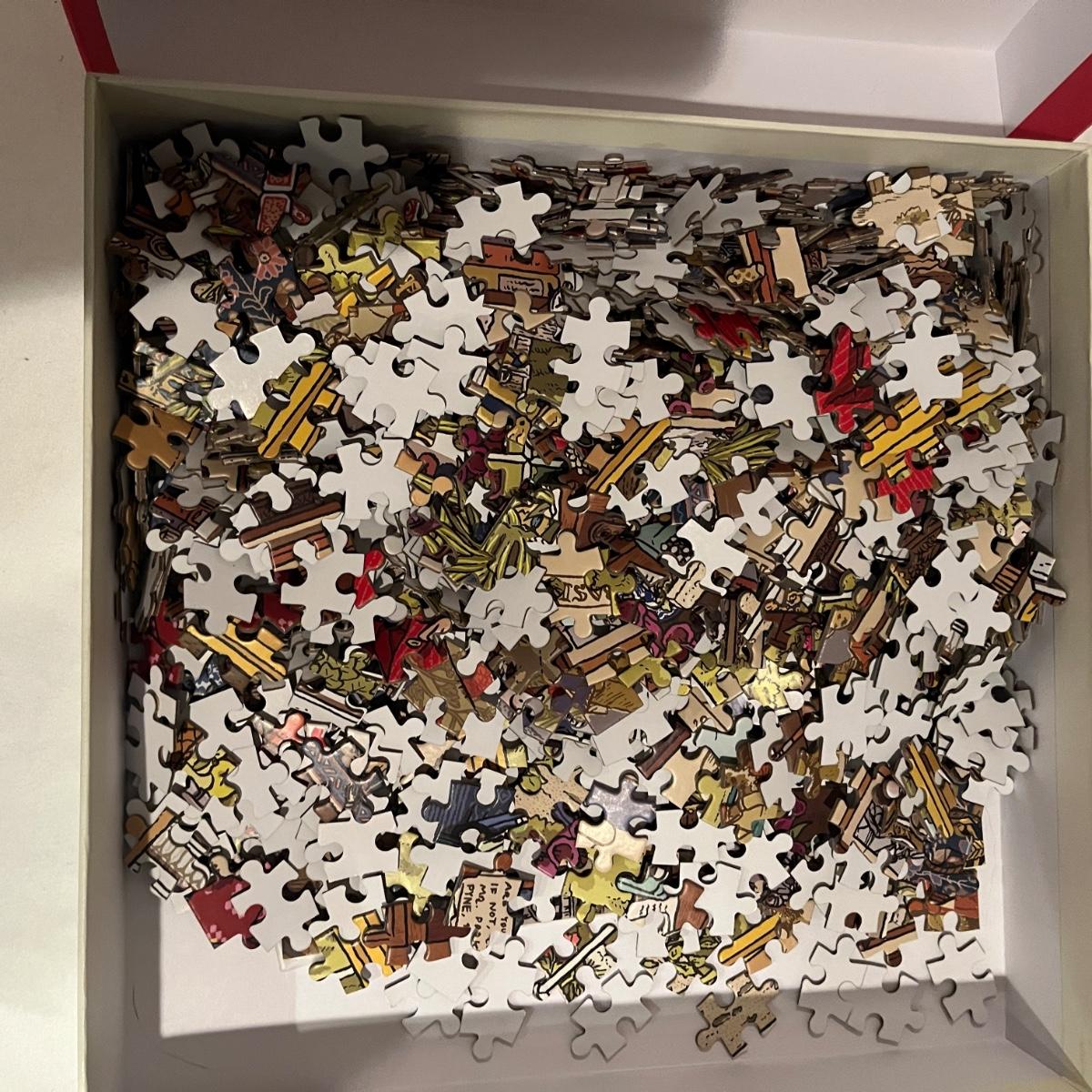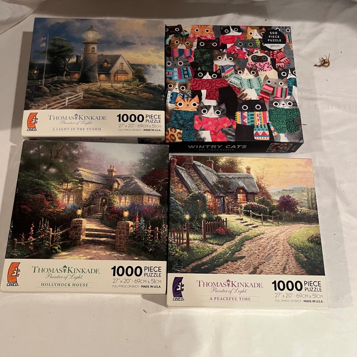 Lot includes portable and home Scrabble games, 13 puzzles, poker chips in a wooden case, tangram puzzles and used playing cards. Wooden case measures 8.5” x 8.5” x 3”H.