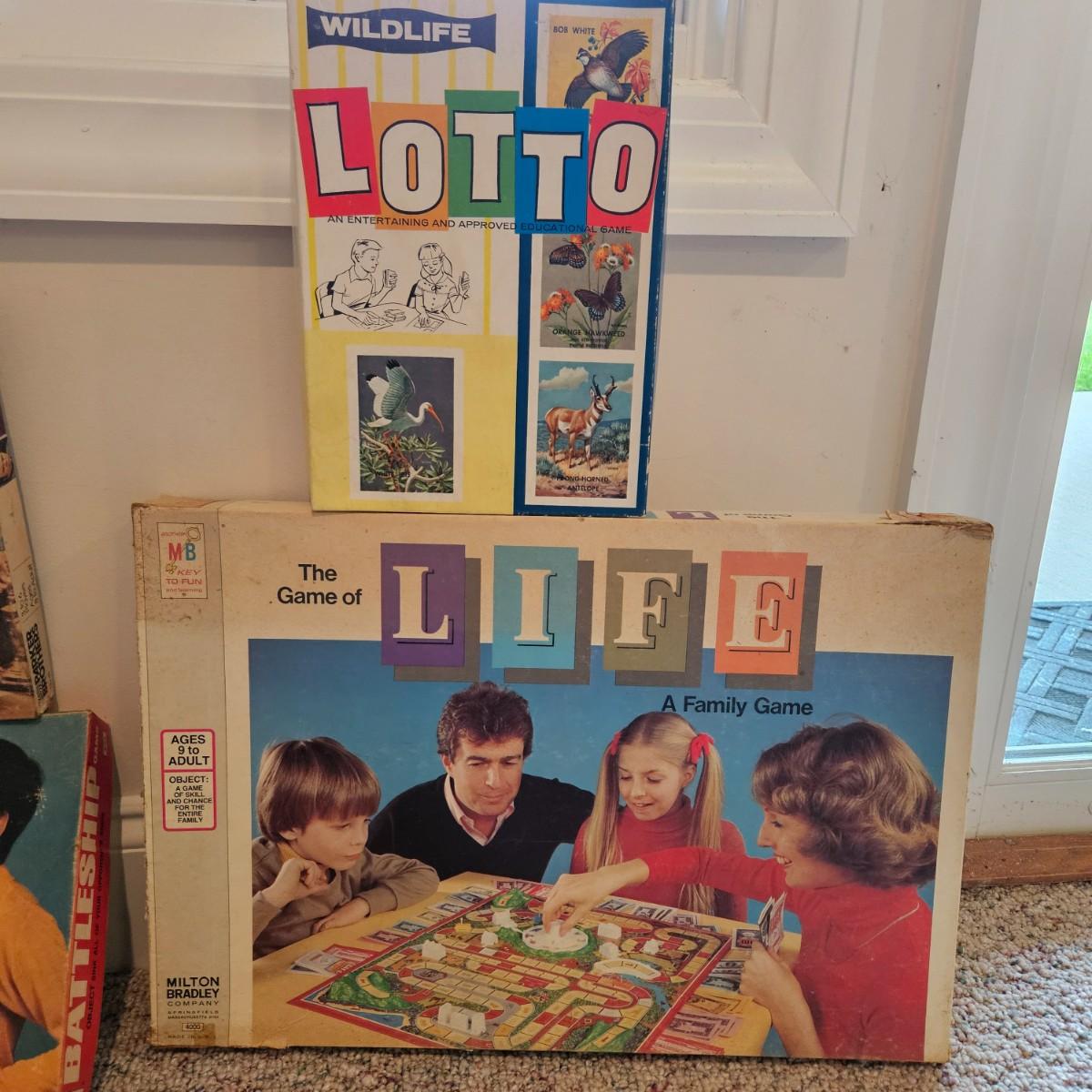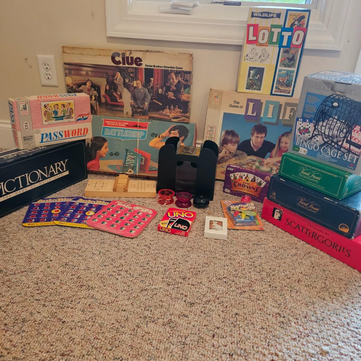 An assortment of games that includes Clue, Battleship, Trivial Pursuit, Life and more. Also includes an automatic card shuffler which takes four 'C' size batteries, but is untested. Also three Duncan yo-yo's, Auto bingo cards and more. Shipping available