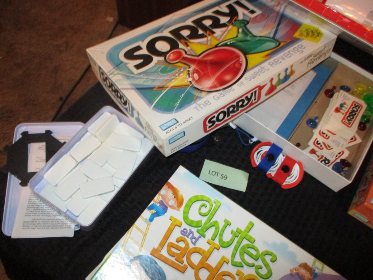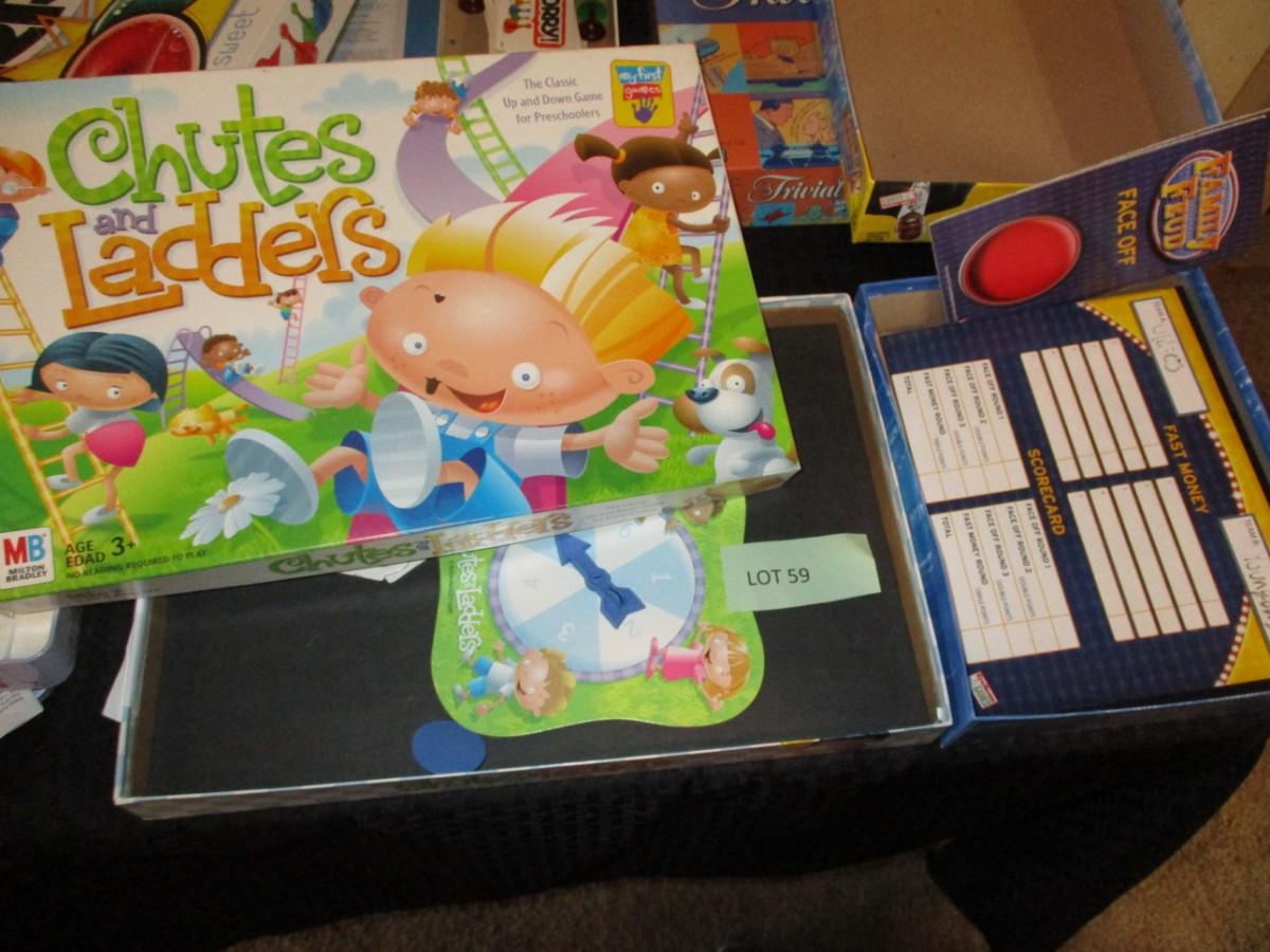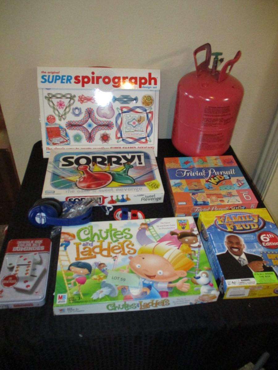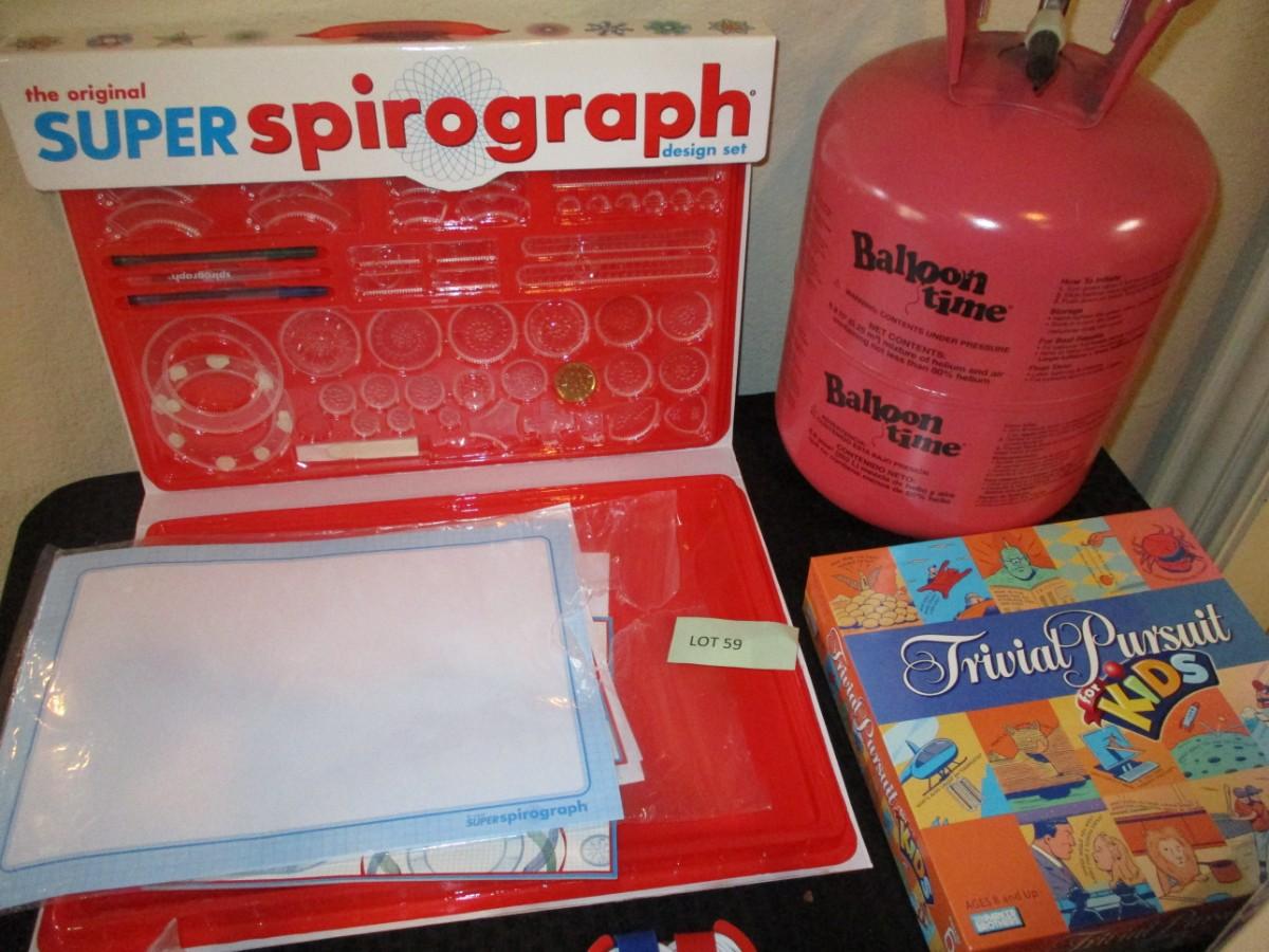 Sorry. Spirograph, Balloon Air Tank, Blue Headphones, Trivia Pursuit, Dominoes (not a complete set)