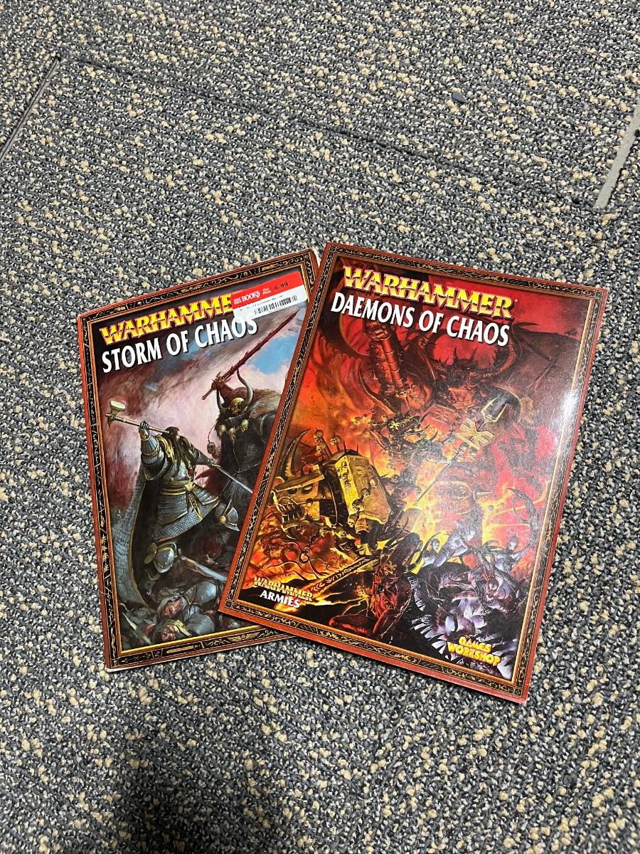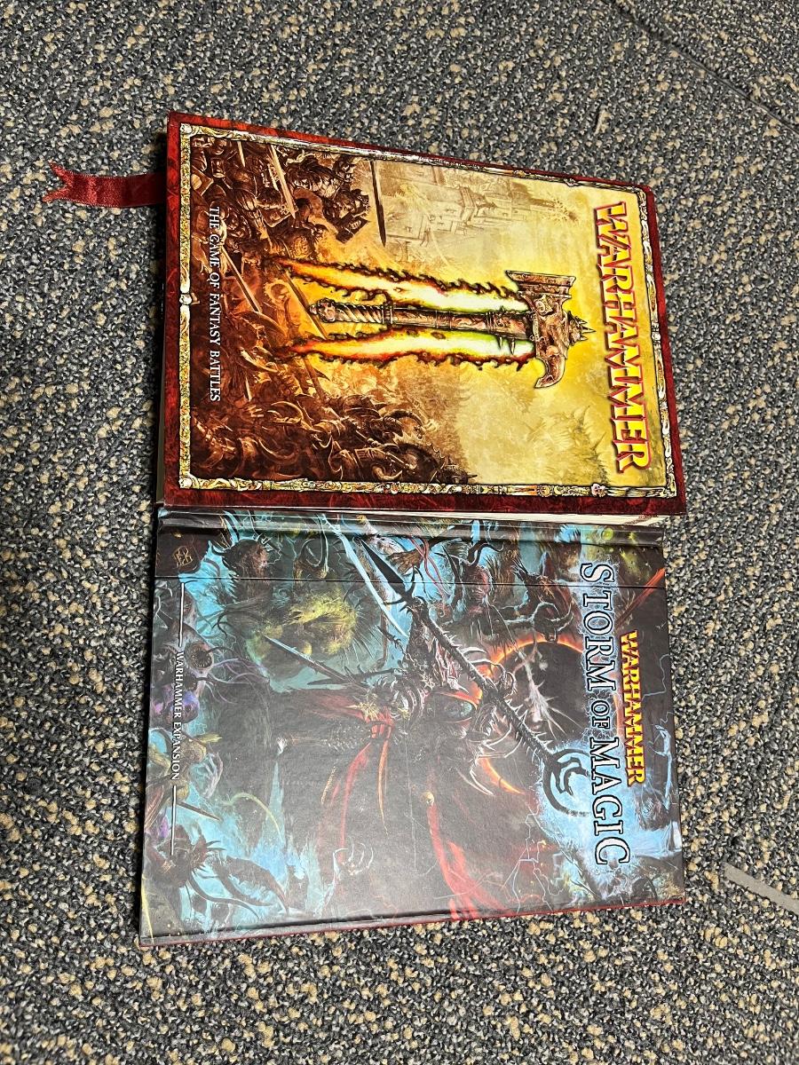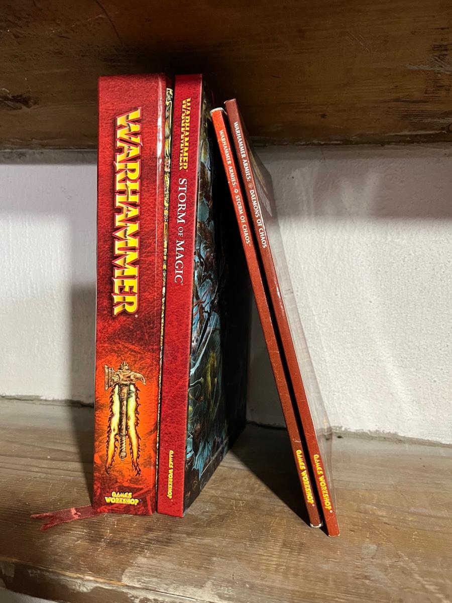 8th edition of Warhammer fantasy battles main rule book with additional rule books for storm of chaos and storm magic campaign settings. Army book for chaos daemons is also included.