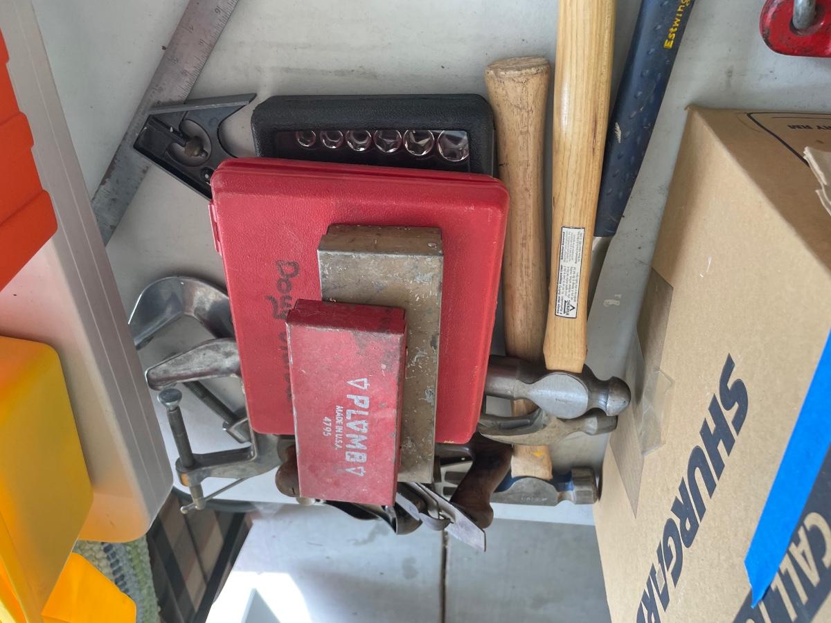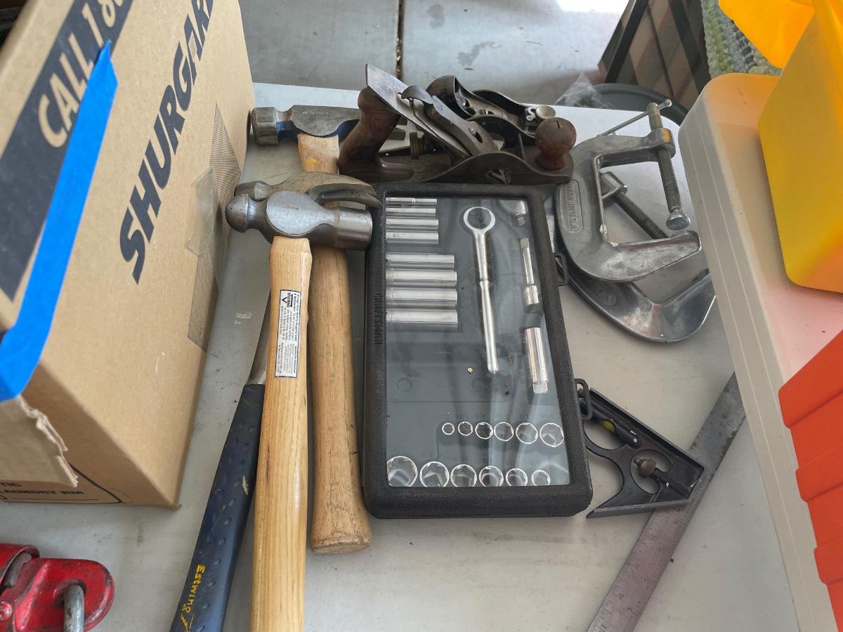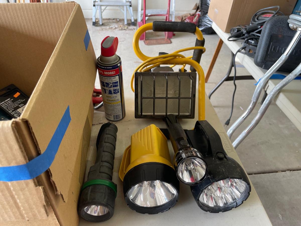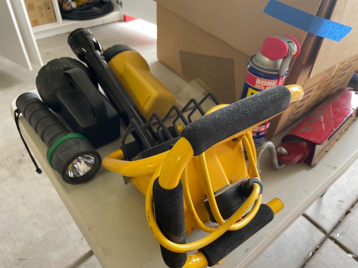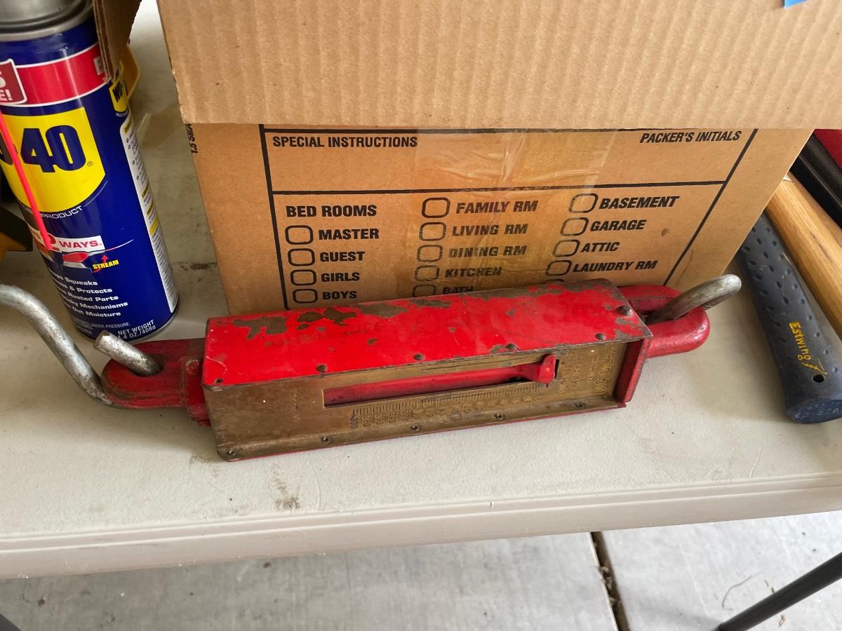 Vintage scale, random hand tools, plug in garage light, 2 tool boxes, 4 assorted flashlights including 1 mad light, wrenches, 2 planers, and more