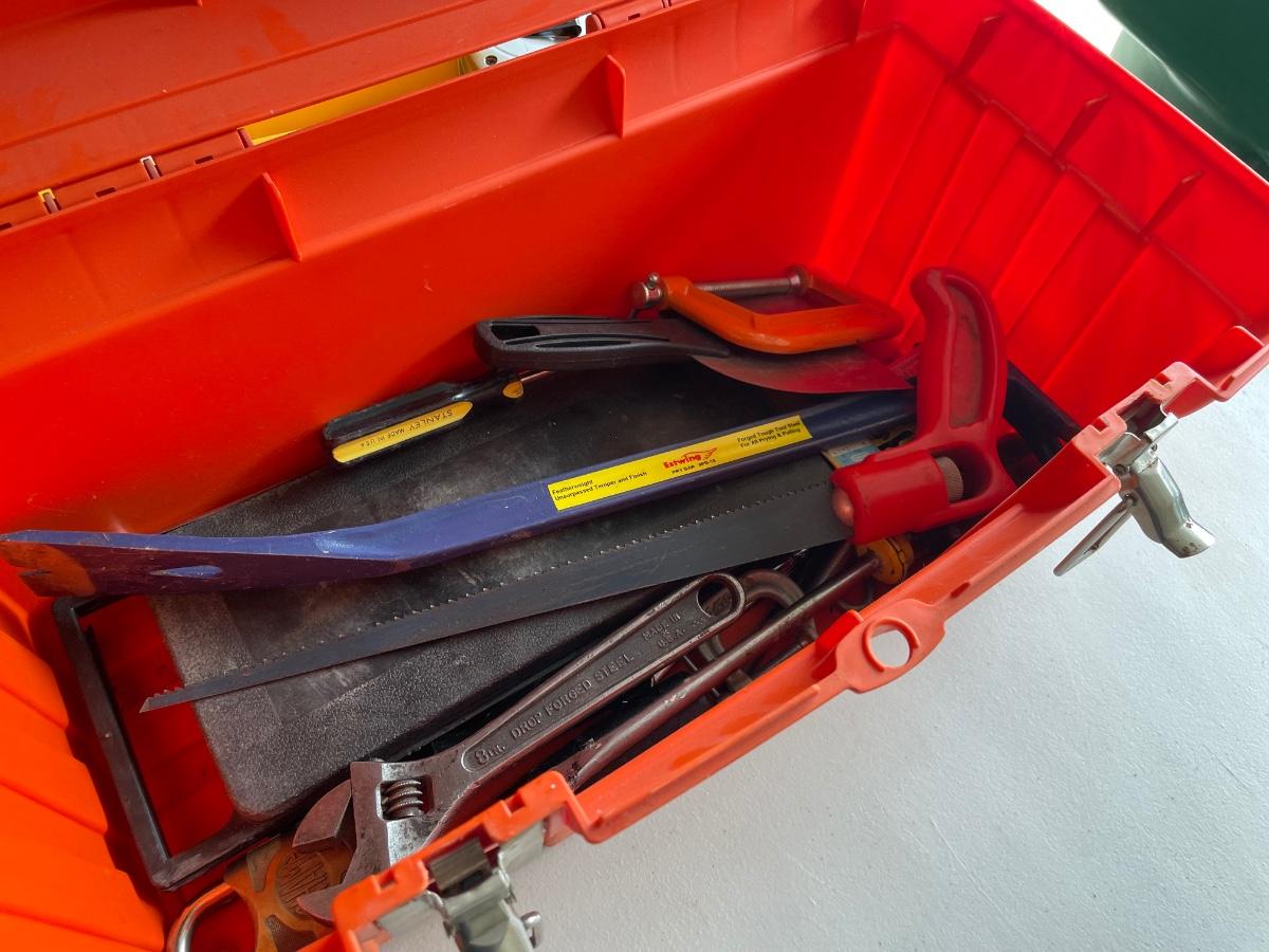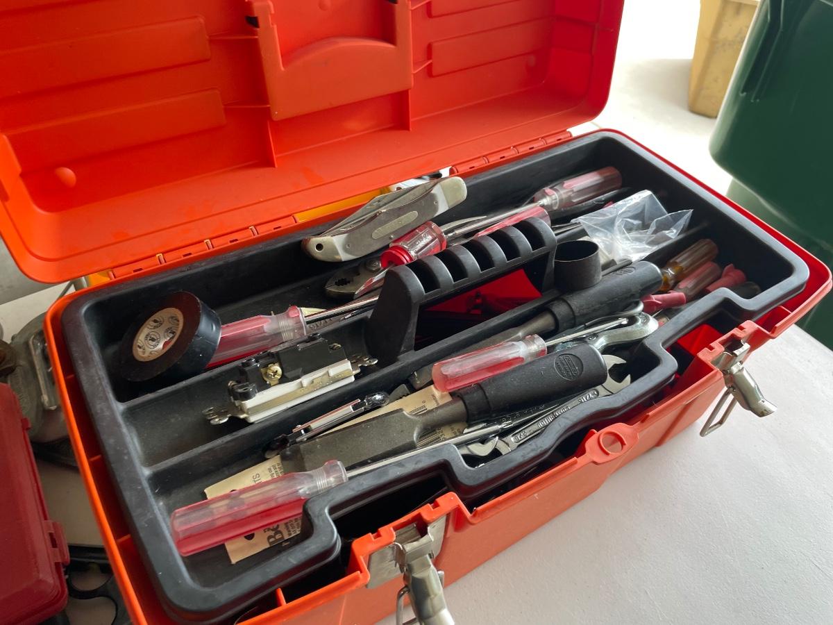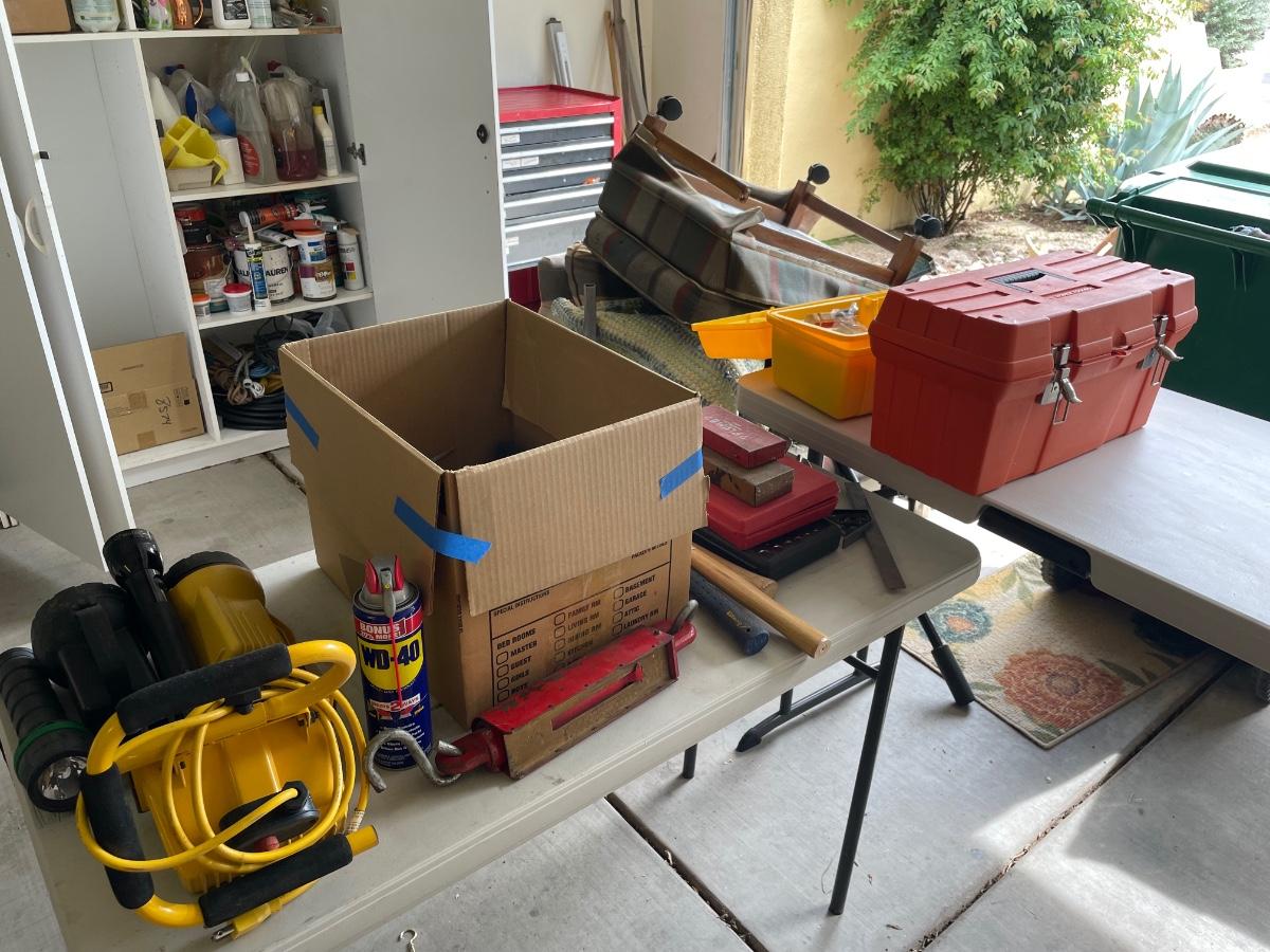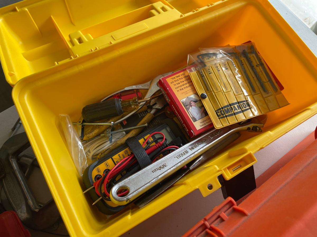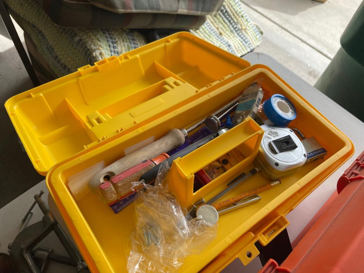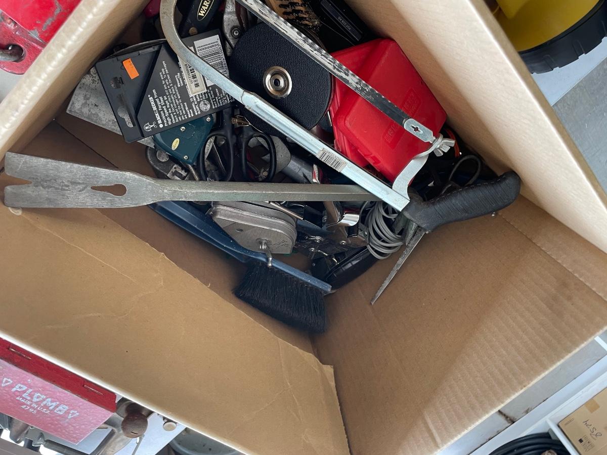 Vintage scale, random hand tools, plug in garage light, 2 tool boxes, 4 assorted flashlights including 1 mad light, wrenches, 2 planers, and more