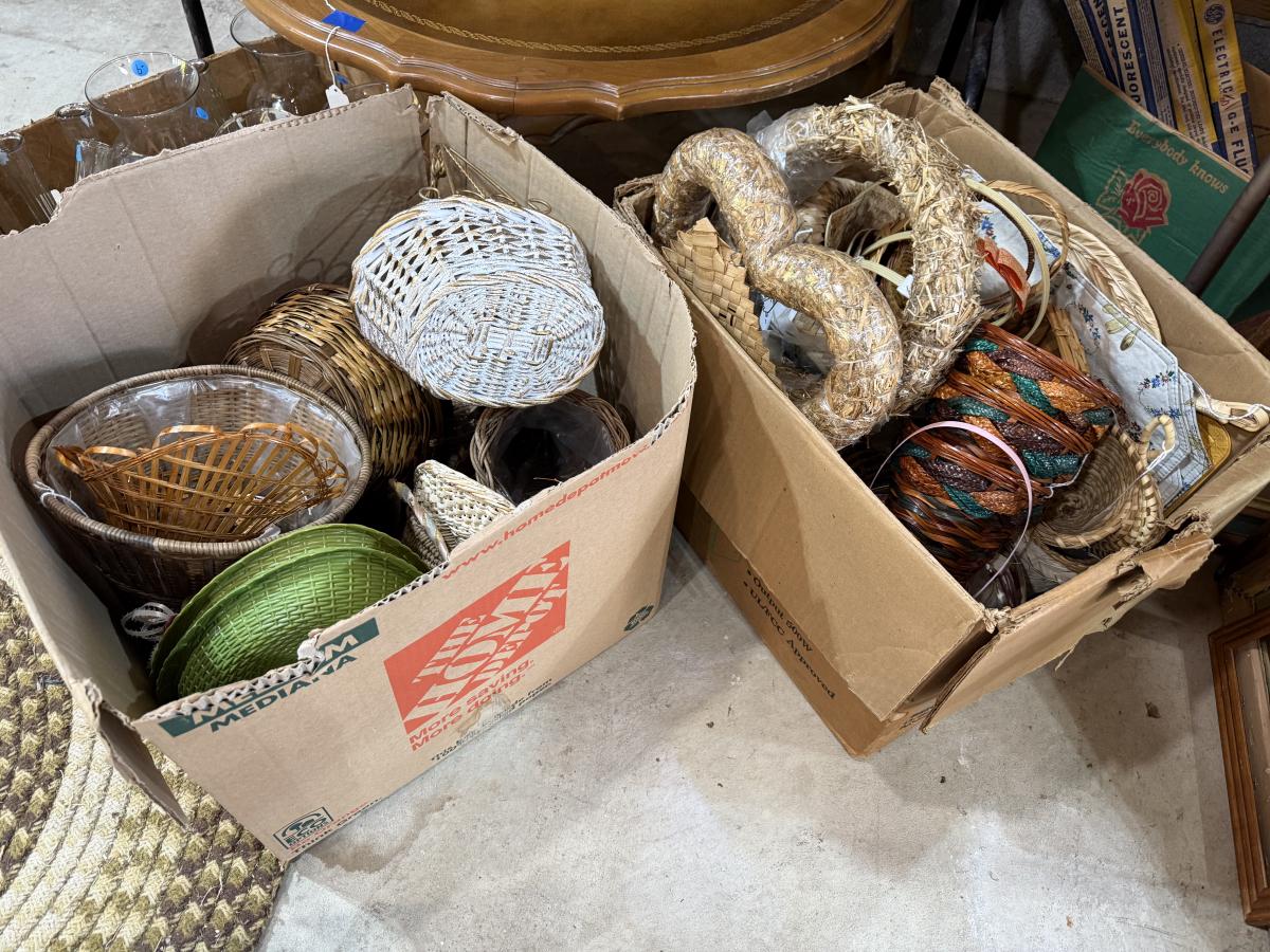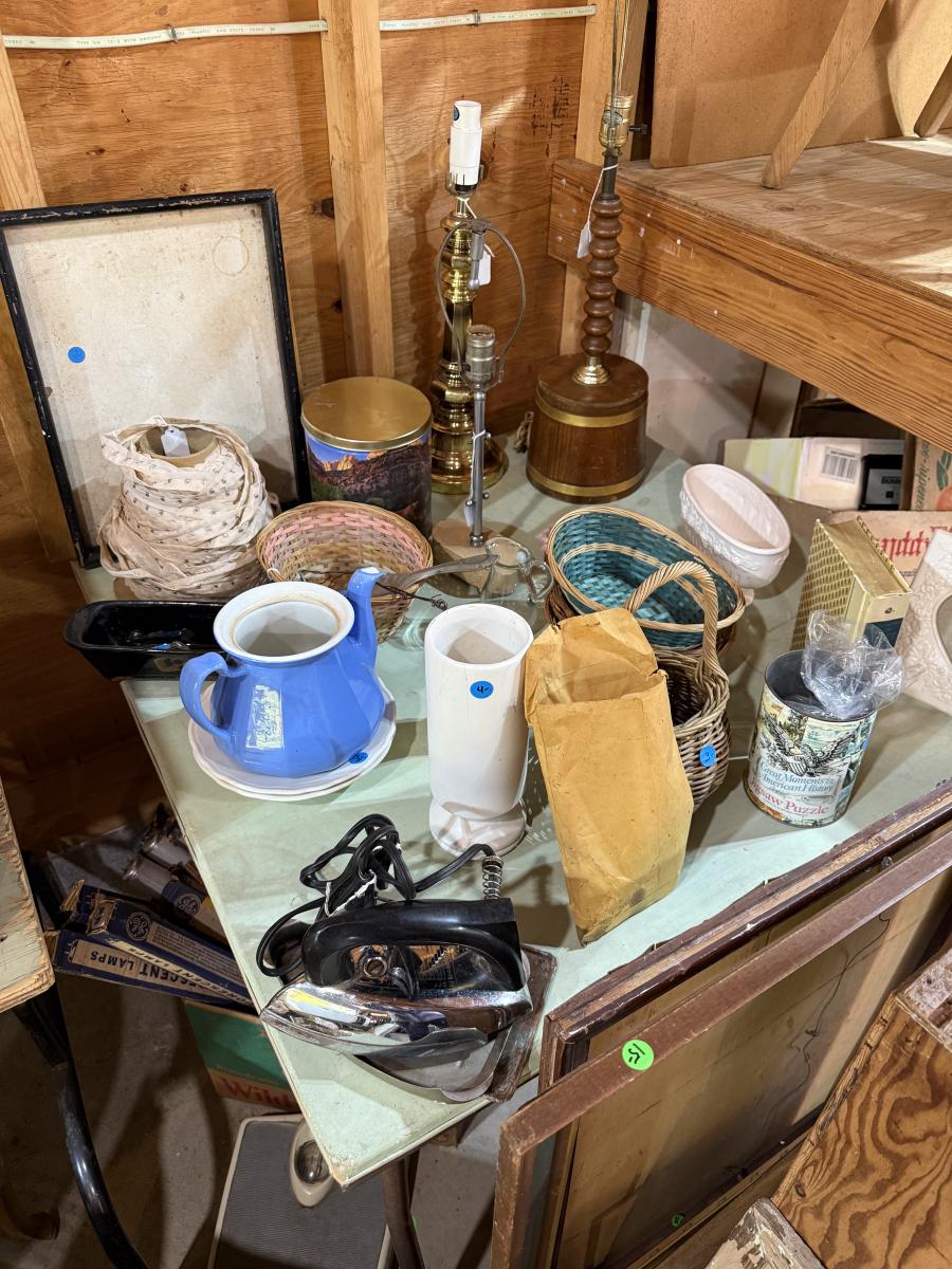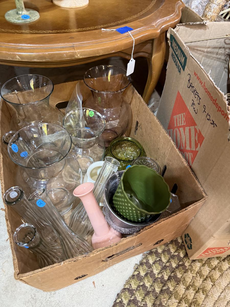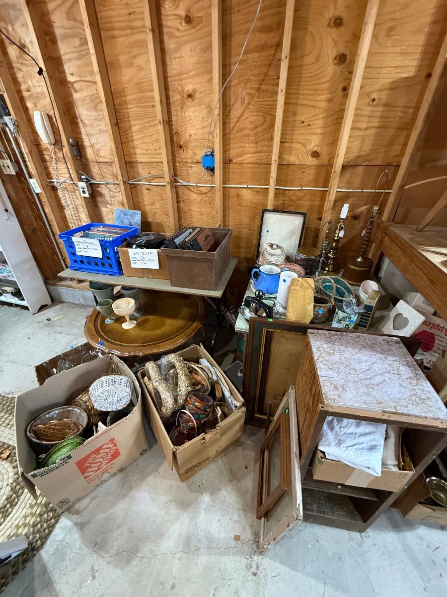 Records, Baskets, frames, vases, Pottery coffee Table, mirror, Upholstery supplies, cabinet, and more.