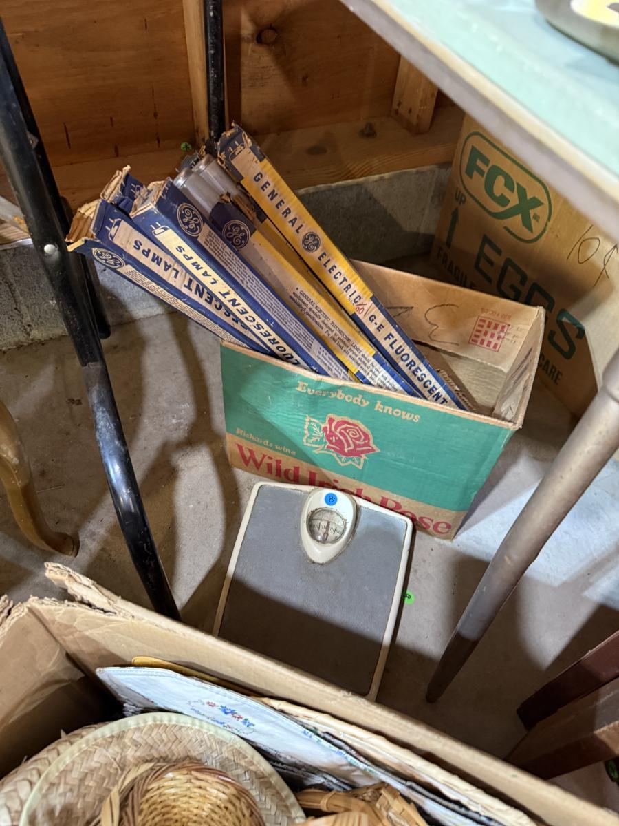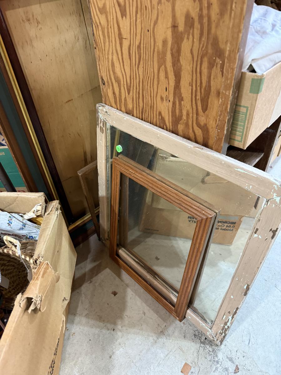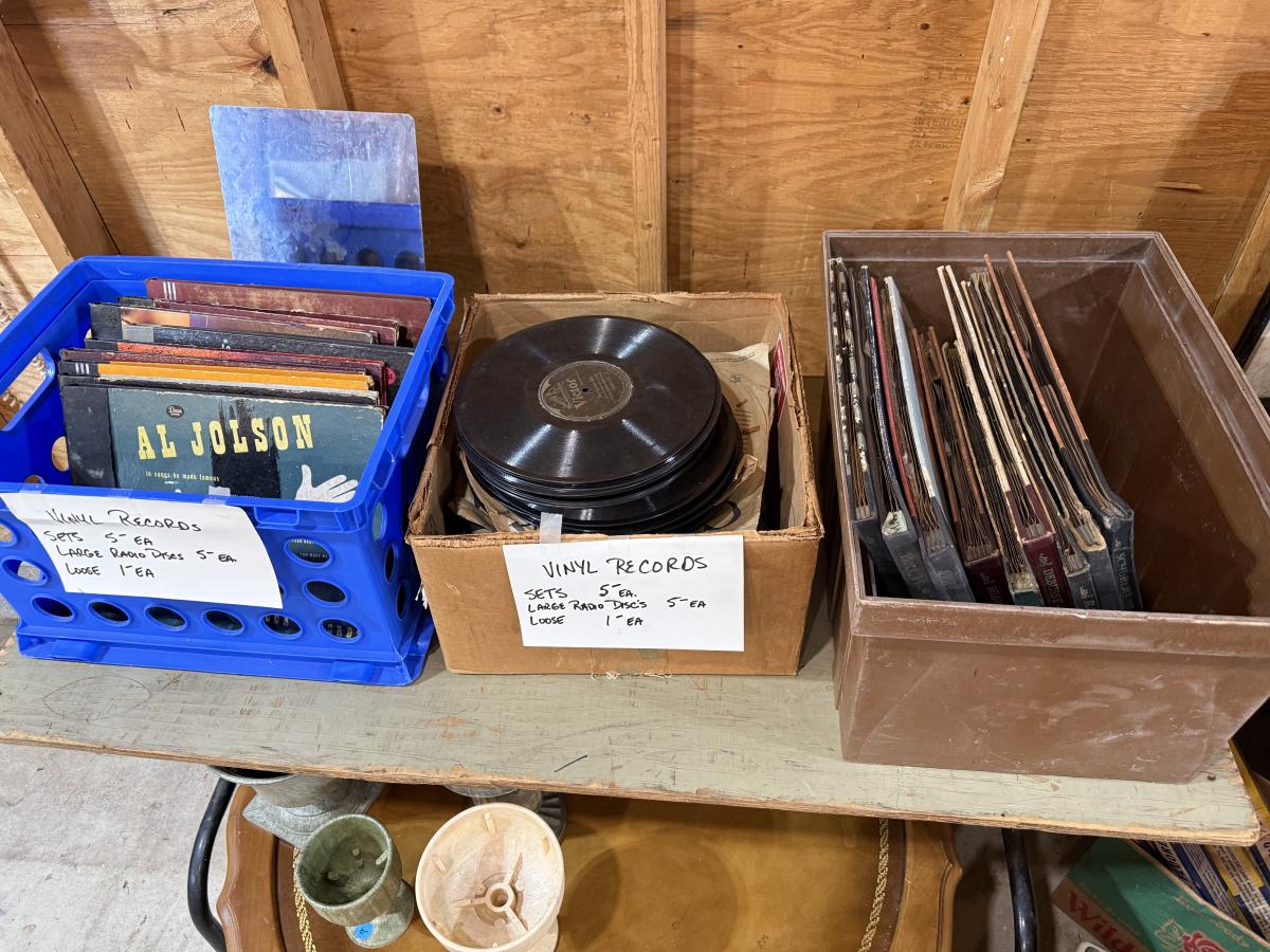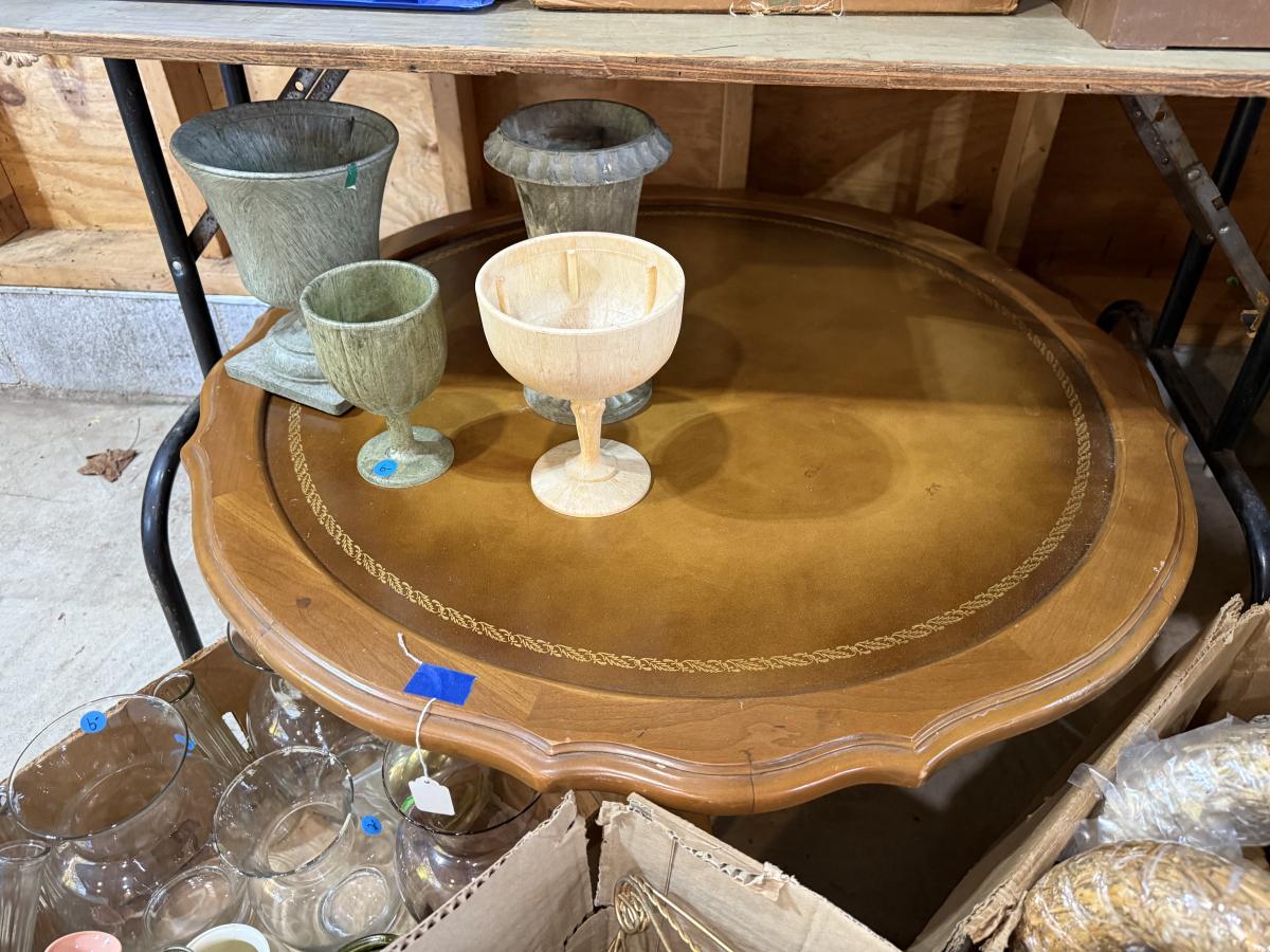 Records, Baskets, frames, vases, Pottery coffee Table, mirror, Upholstery supplies, cabinet, and more.