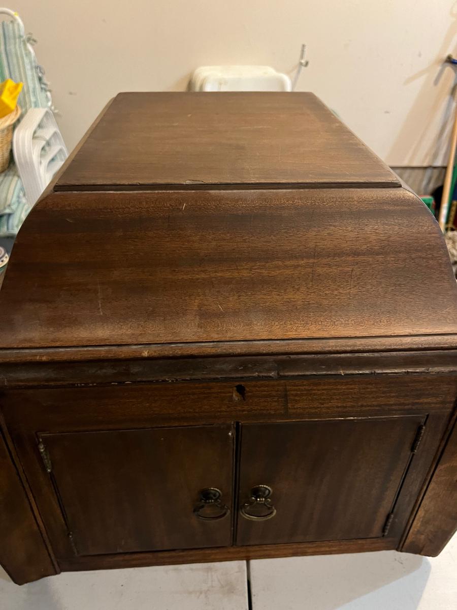 Does not seem to be working. Might be overwound?? Mahogany wood. Needs work.
