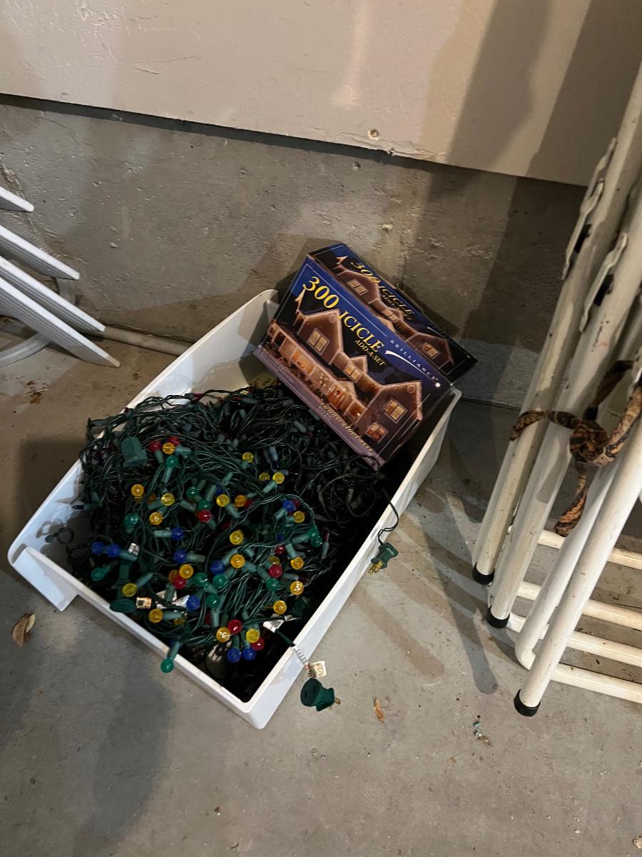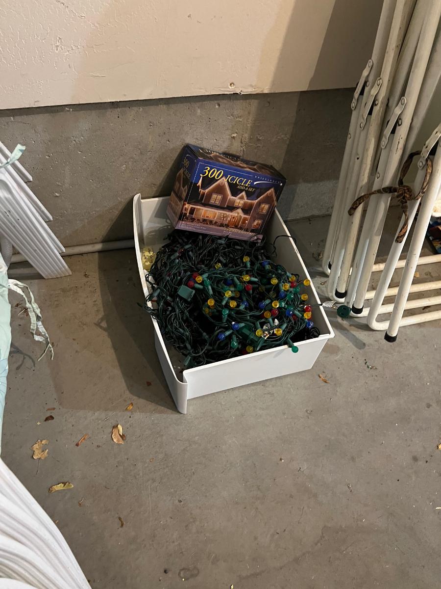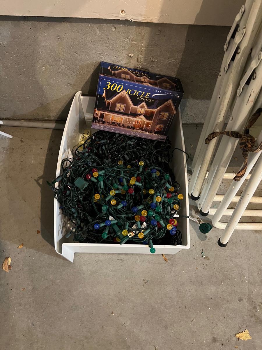 Garage: Box Full of Christmas Lights Used.