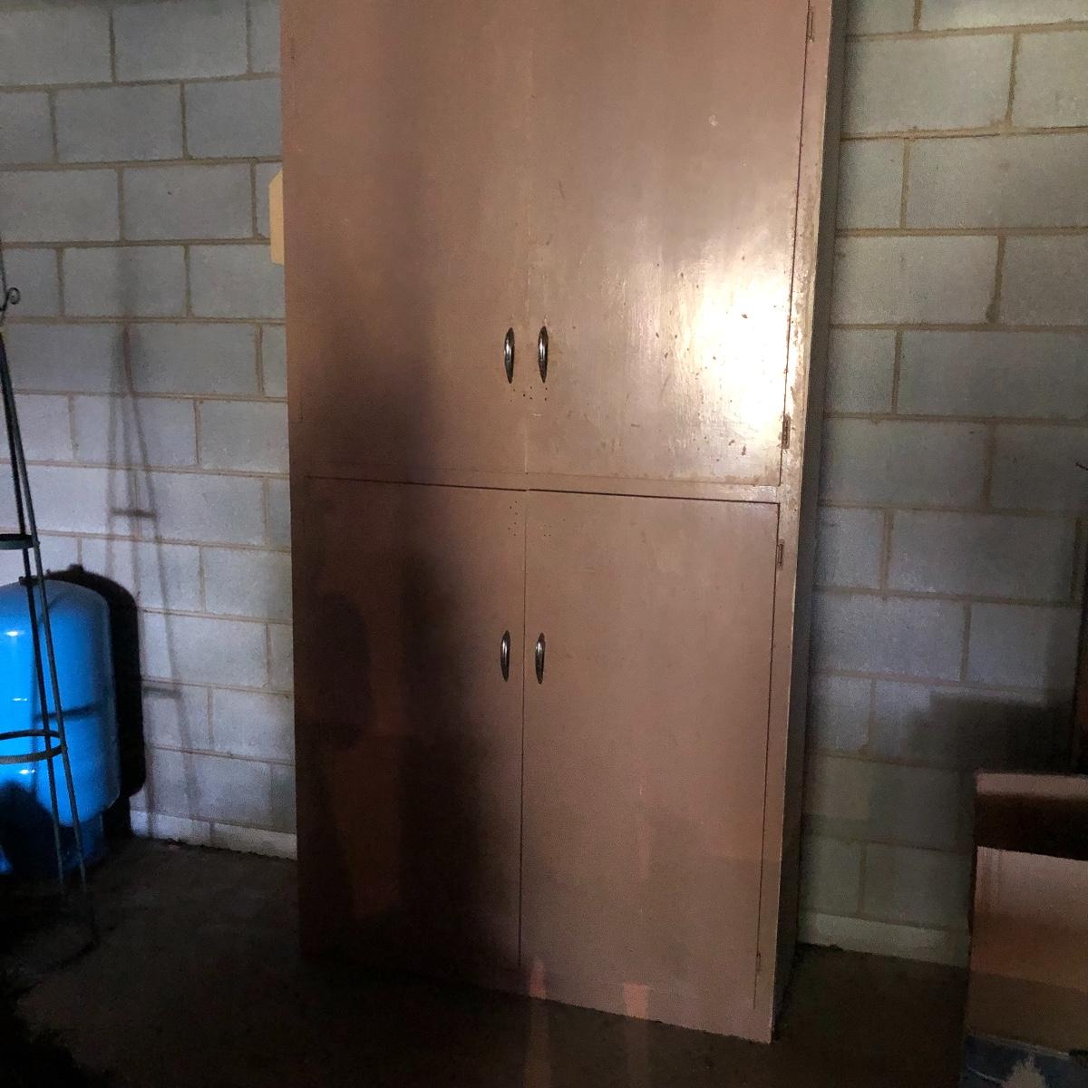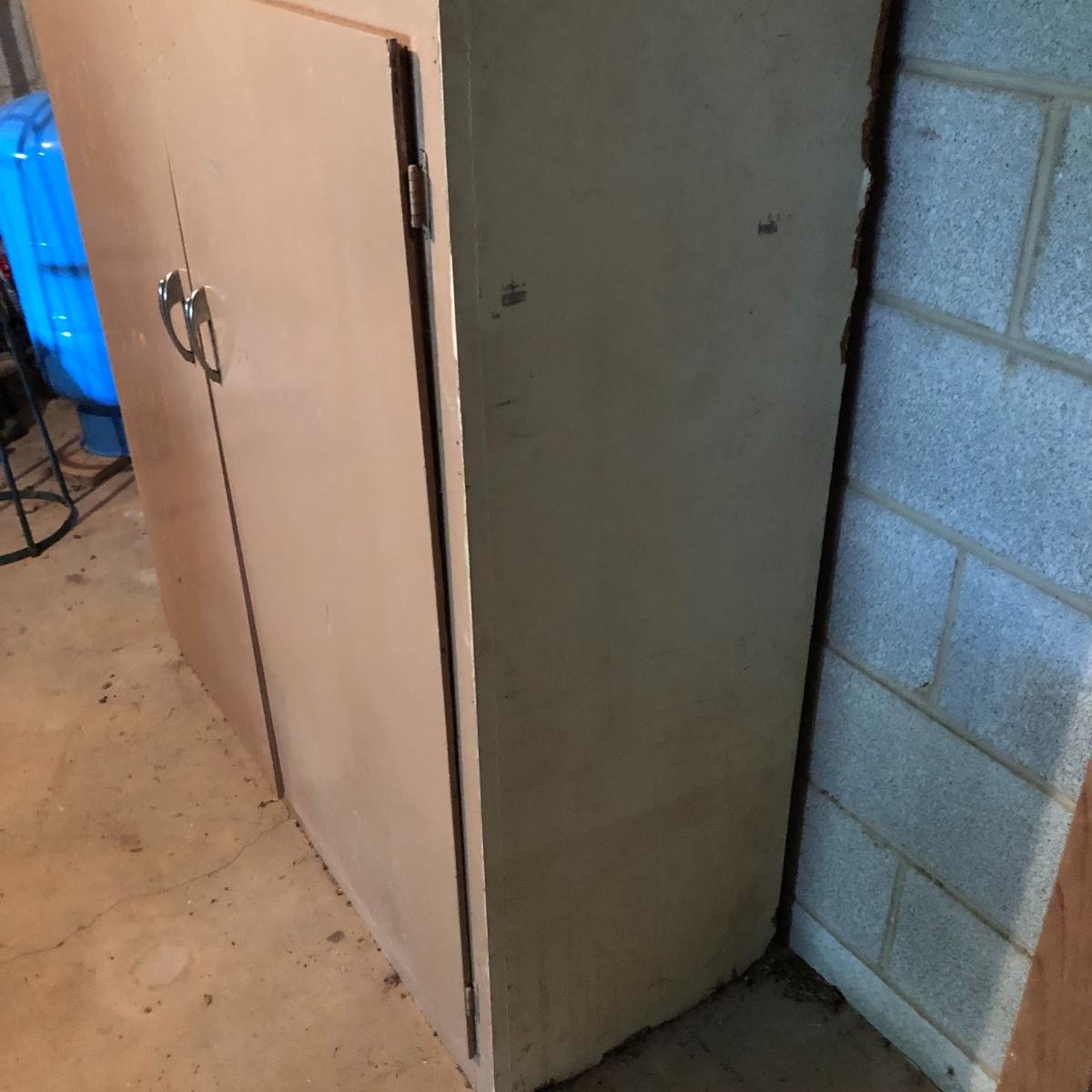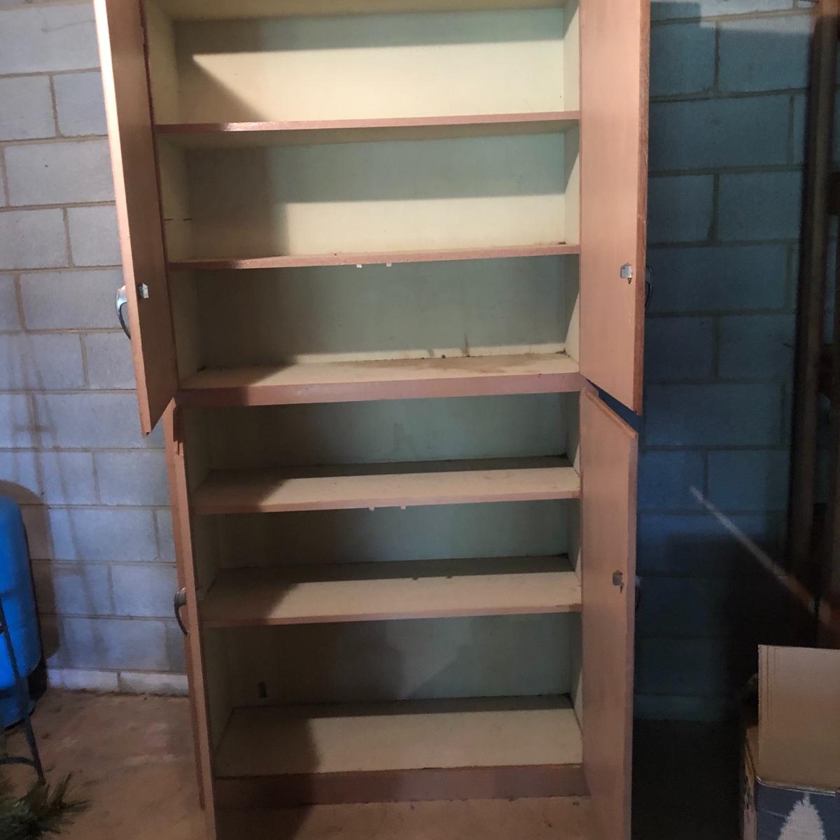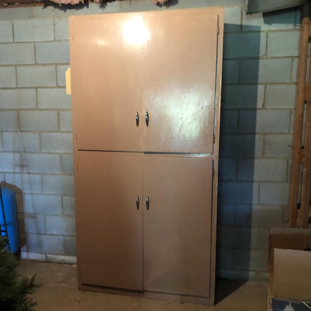 This cabinet is made of plywood. The door handles press in to release the latch on each door. The dimensions are 45” x 17” x 87”. Pls bring help to load. Local pick up only.