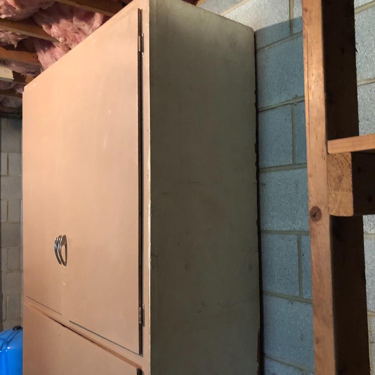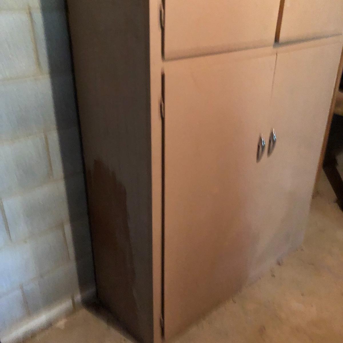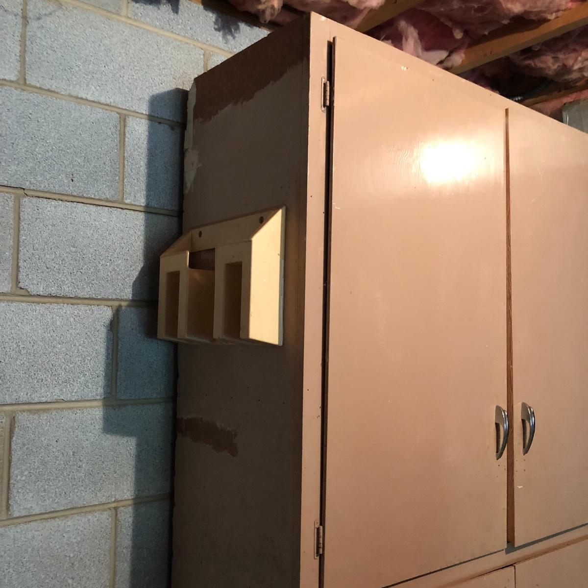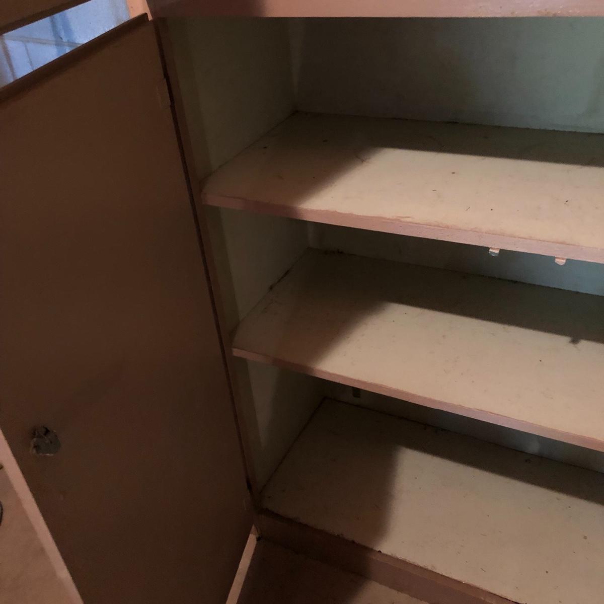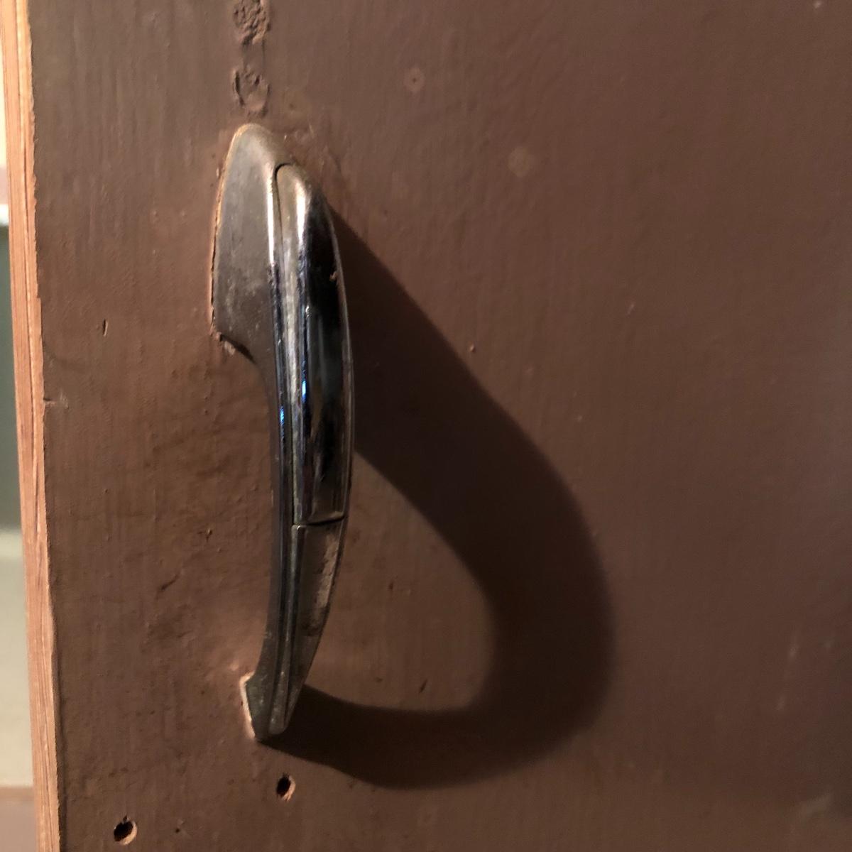 This cabinet is made of plywood. The door handles press in to release the latch on each door. The dimensions are 45” x 17” x 87”. Pls bring help to load. Local pick up only.