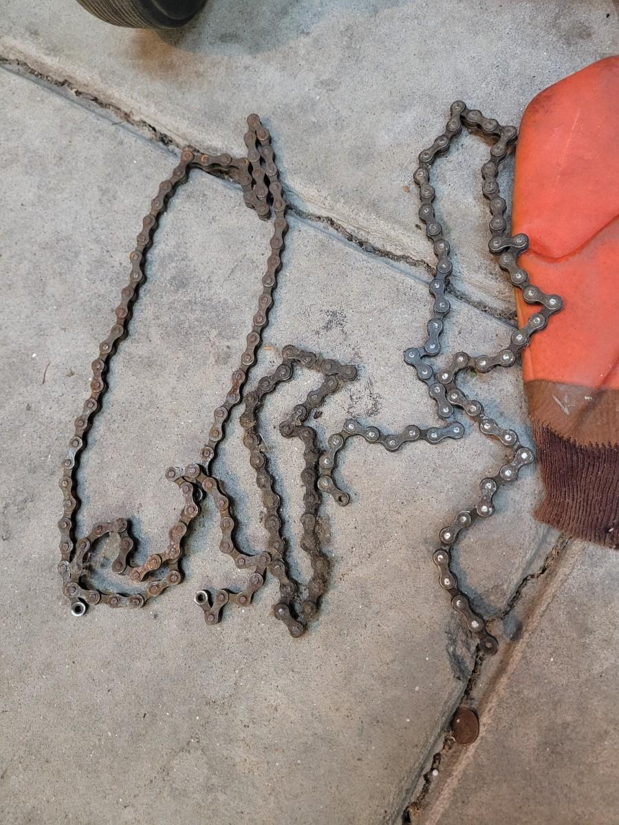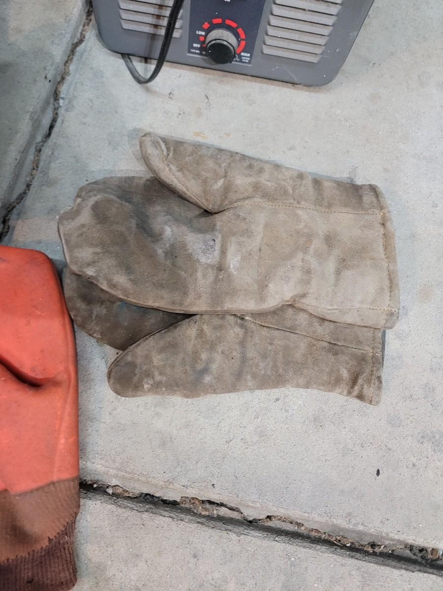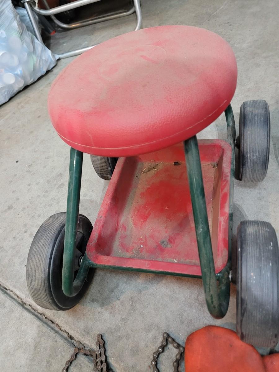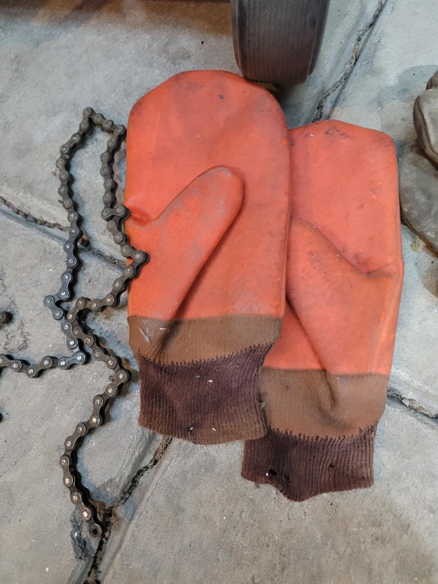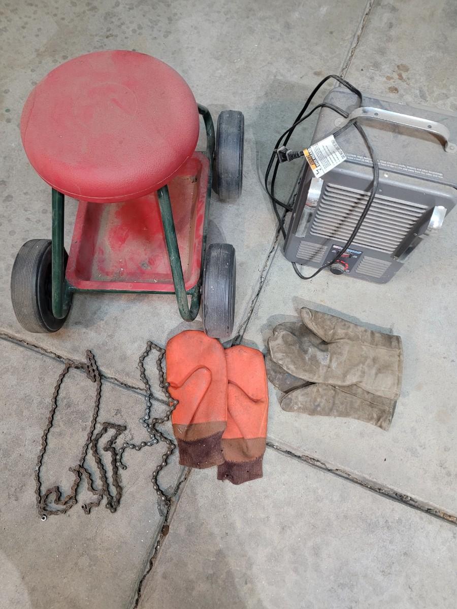 Garage creeping seat, vintage working space heater, mittens and bike chains