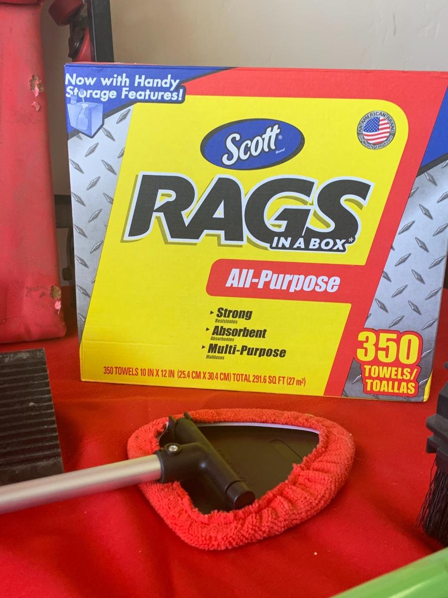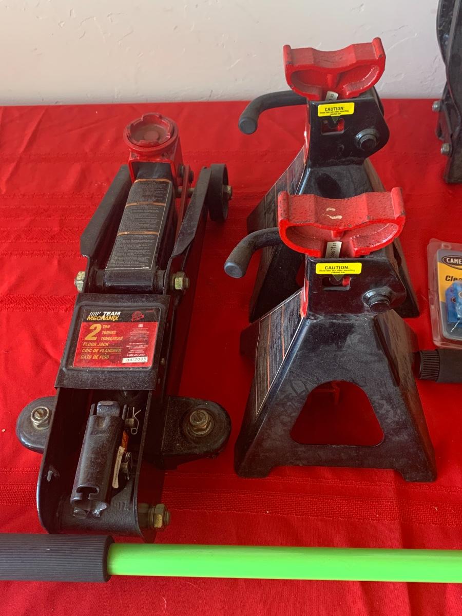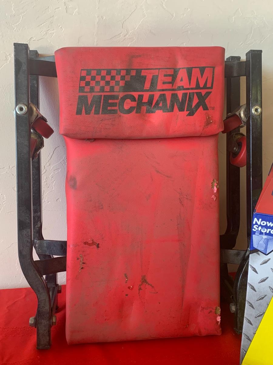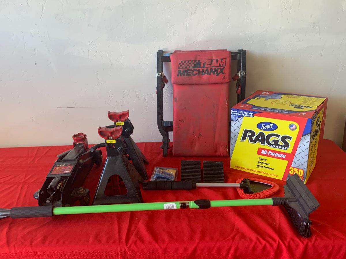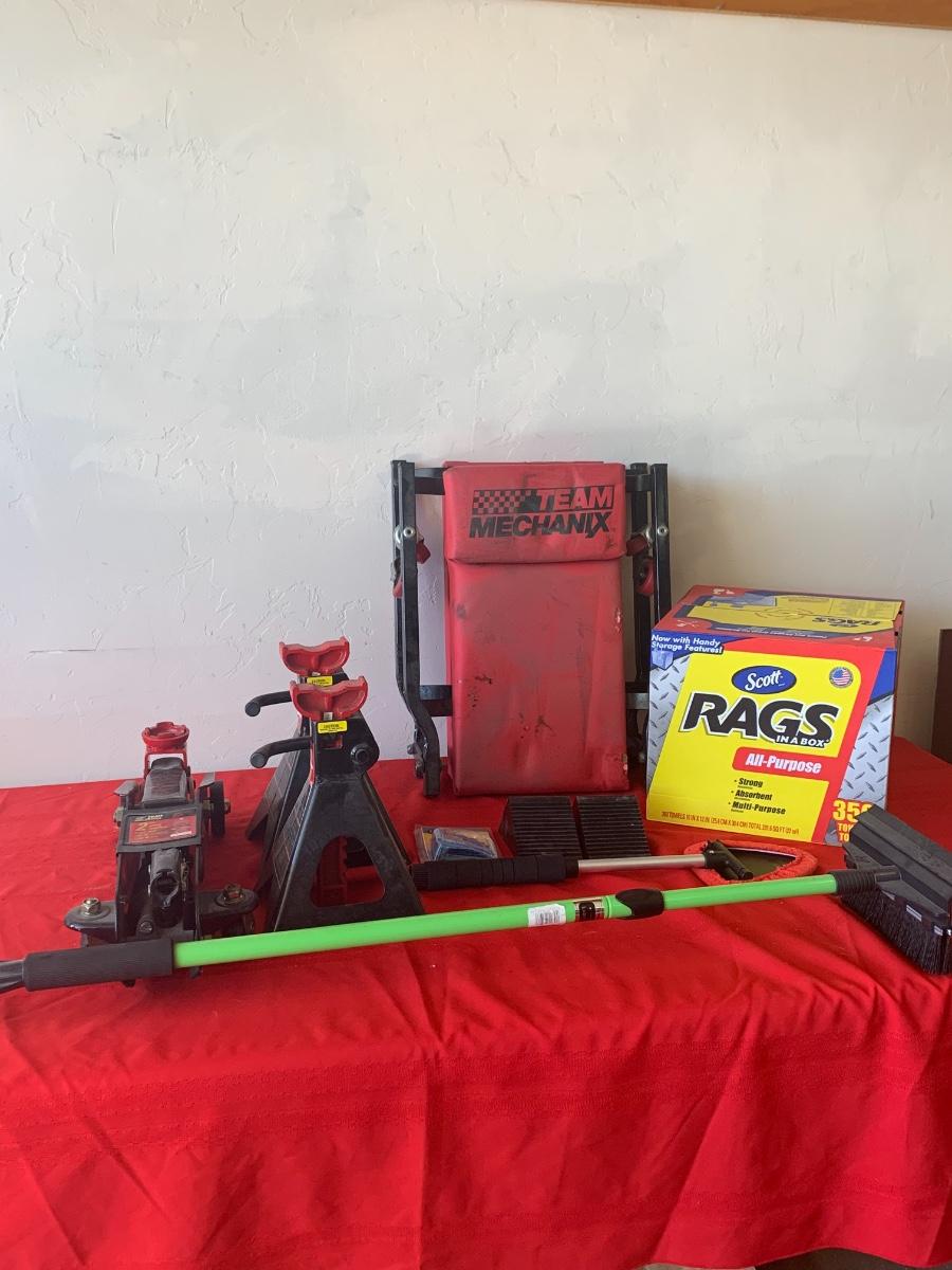 Team Mechanix creeper, Scott rags in box, Team Mechanix jack and stands, ice scraper and more. All in used condition.