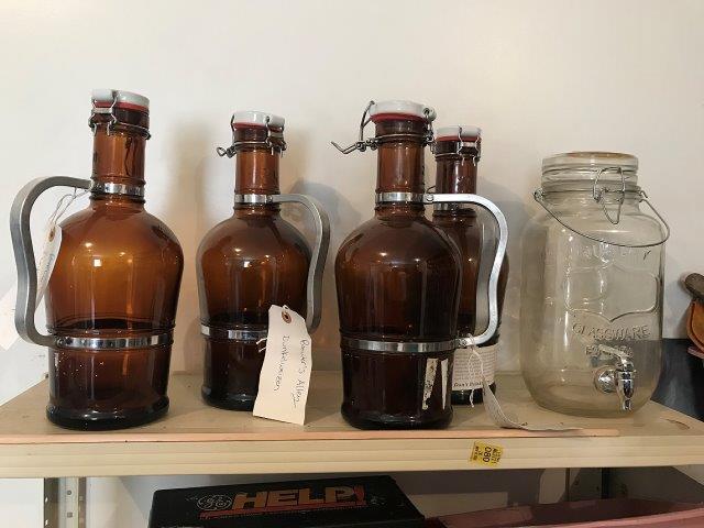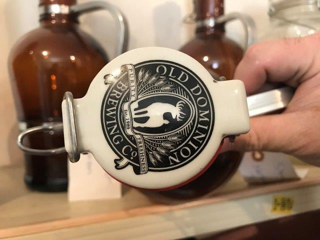 Lot includes four 2 litre Muster Geschutzt growlers with Old Dominion Brewing Company ceramic latch lids. Includes one snap lid dispenser jar with front spigot