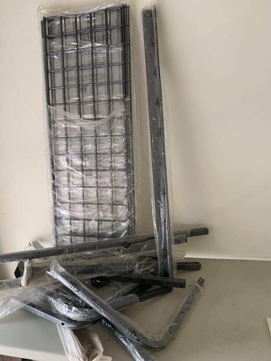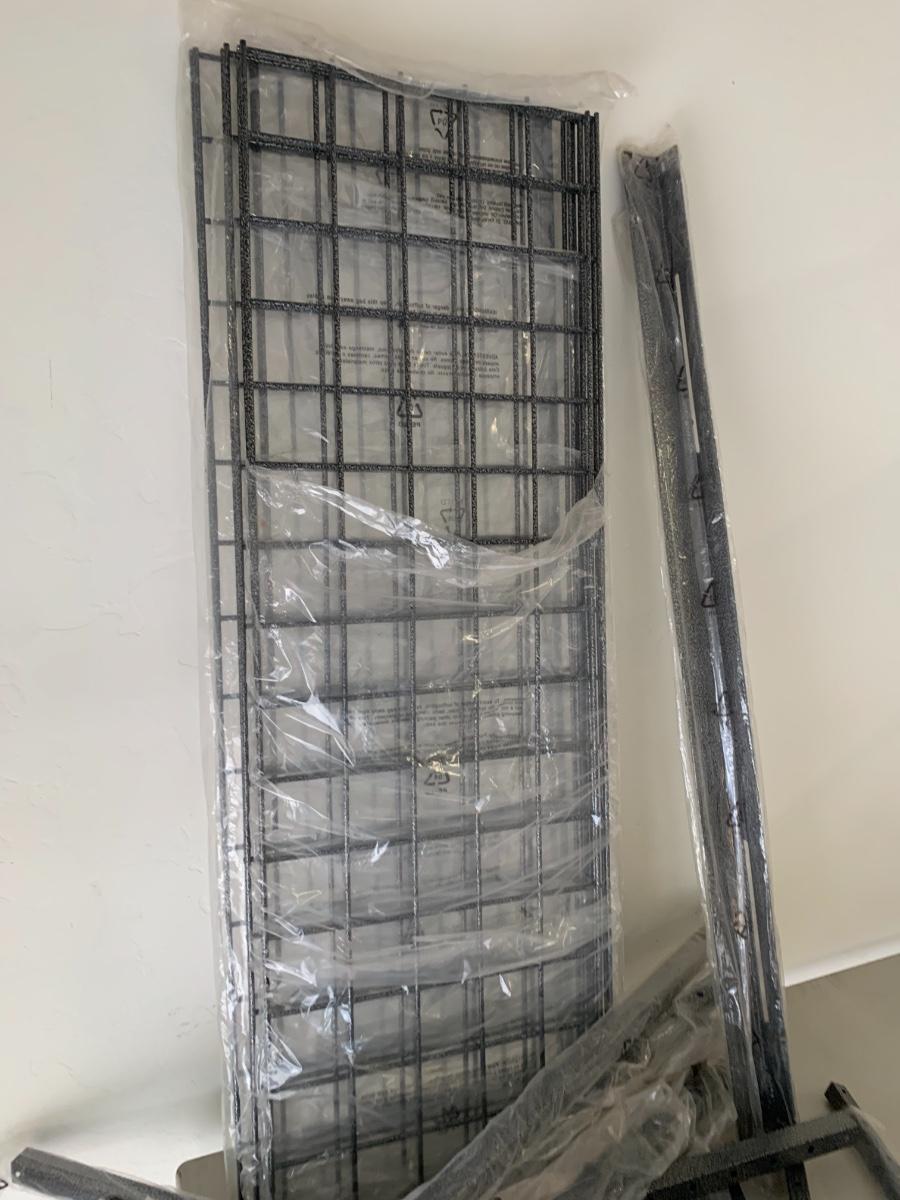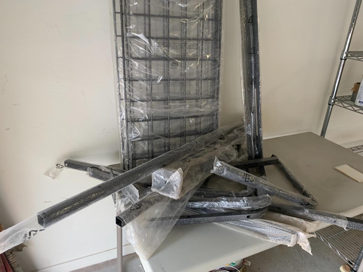 Lot includes new, powder coated metal overhead garage storage shelf- never installed, unsure if all parts are present.