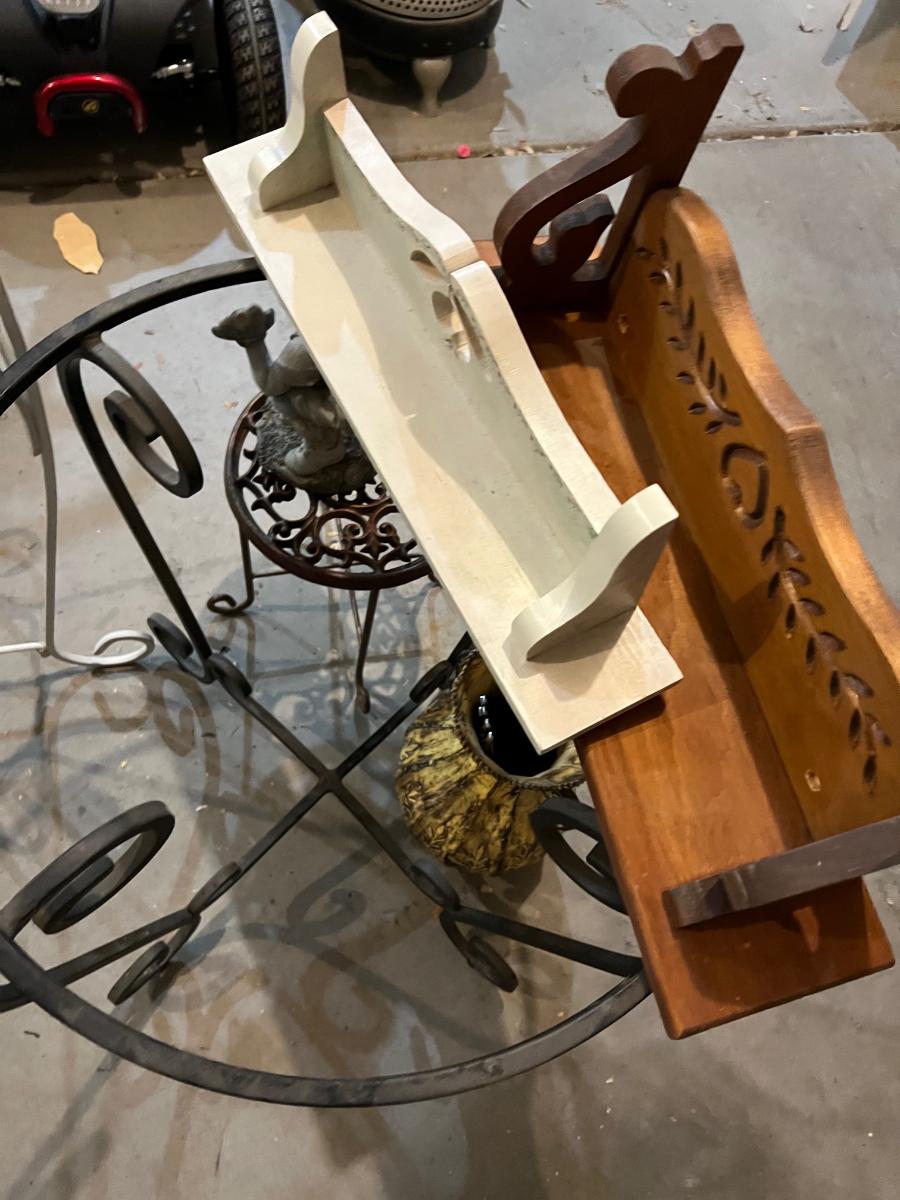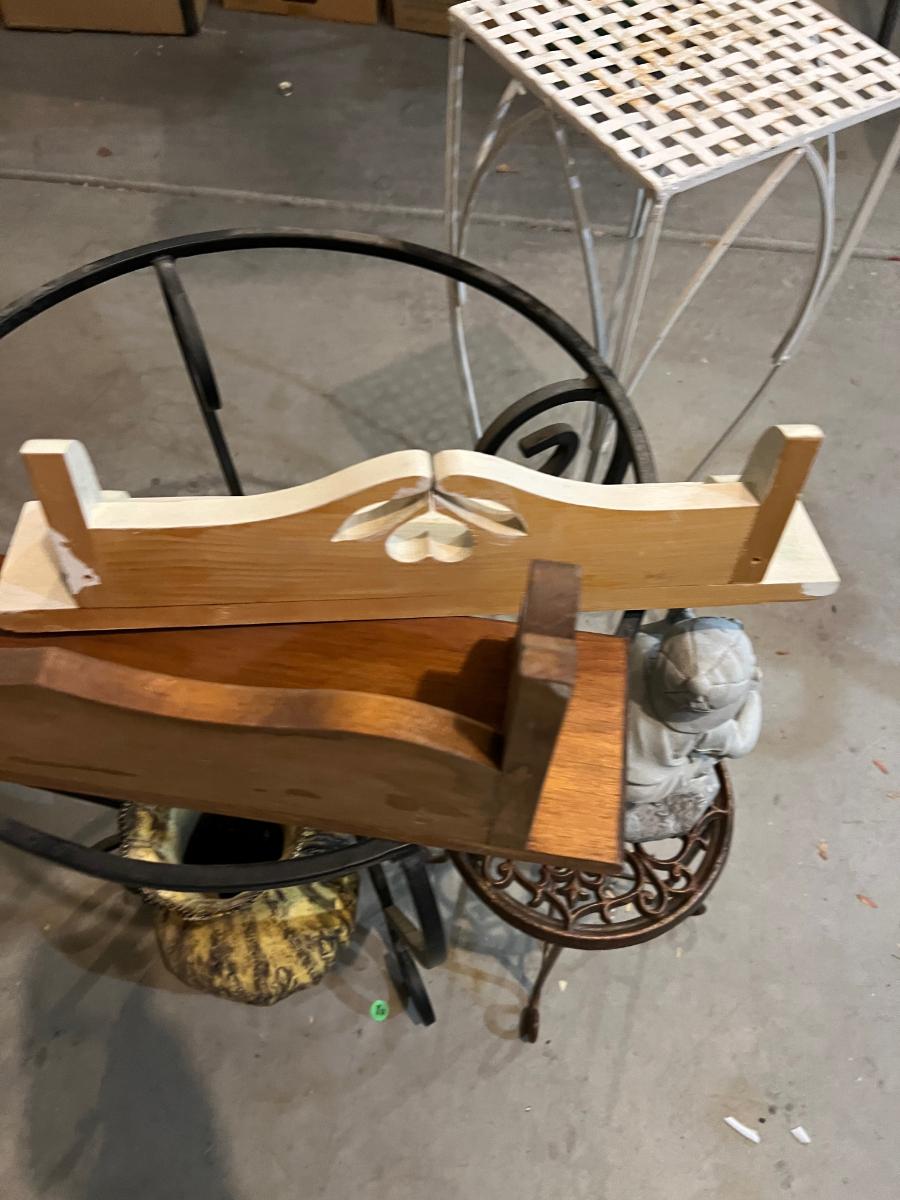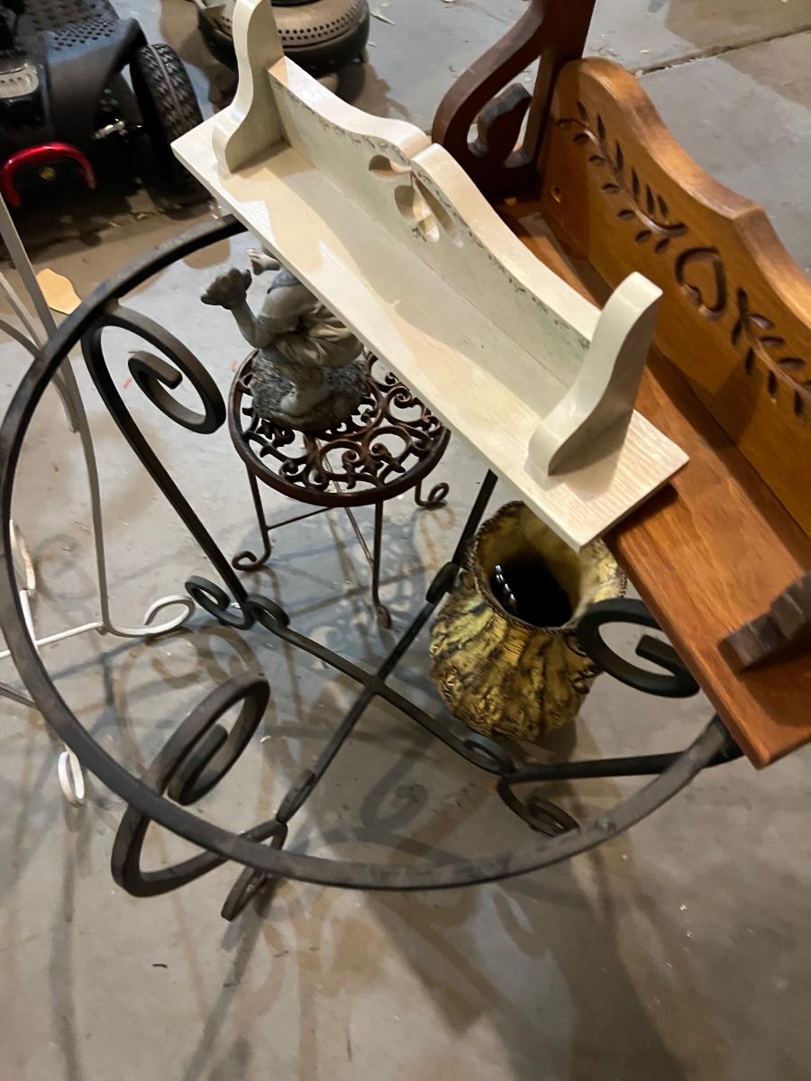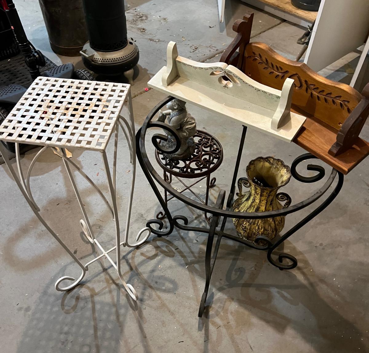 Garage:  Plant Stands, Yard Décor, Shelves.