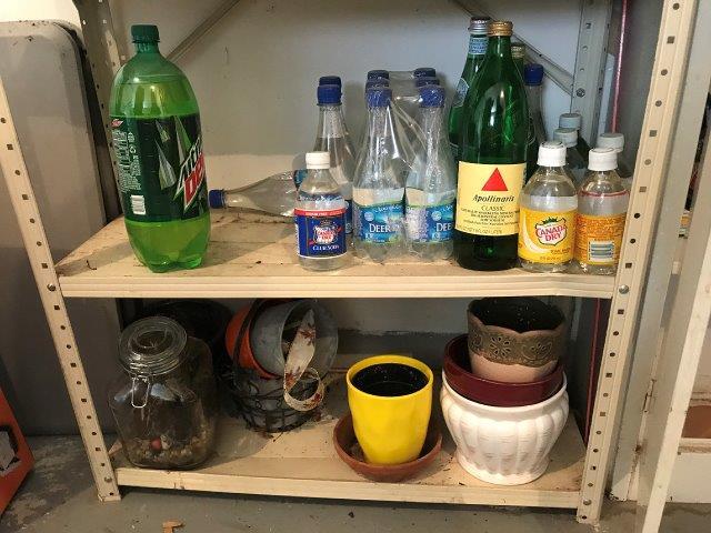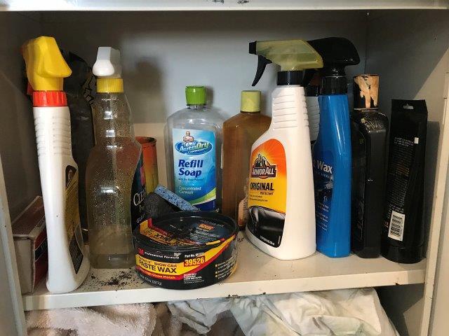 Includes shelf unit and cabinet with all contents. To include misc pots, rags, auto cleaners, gloves, bottled water etc.